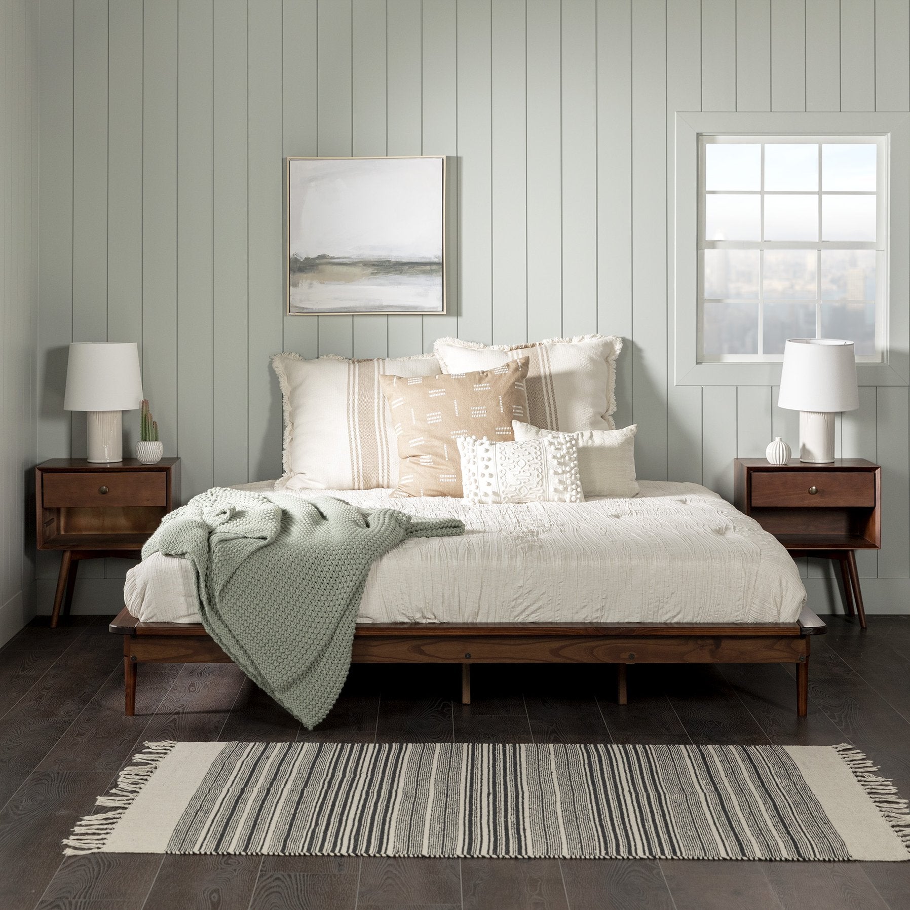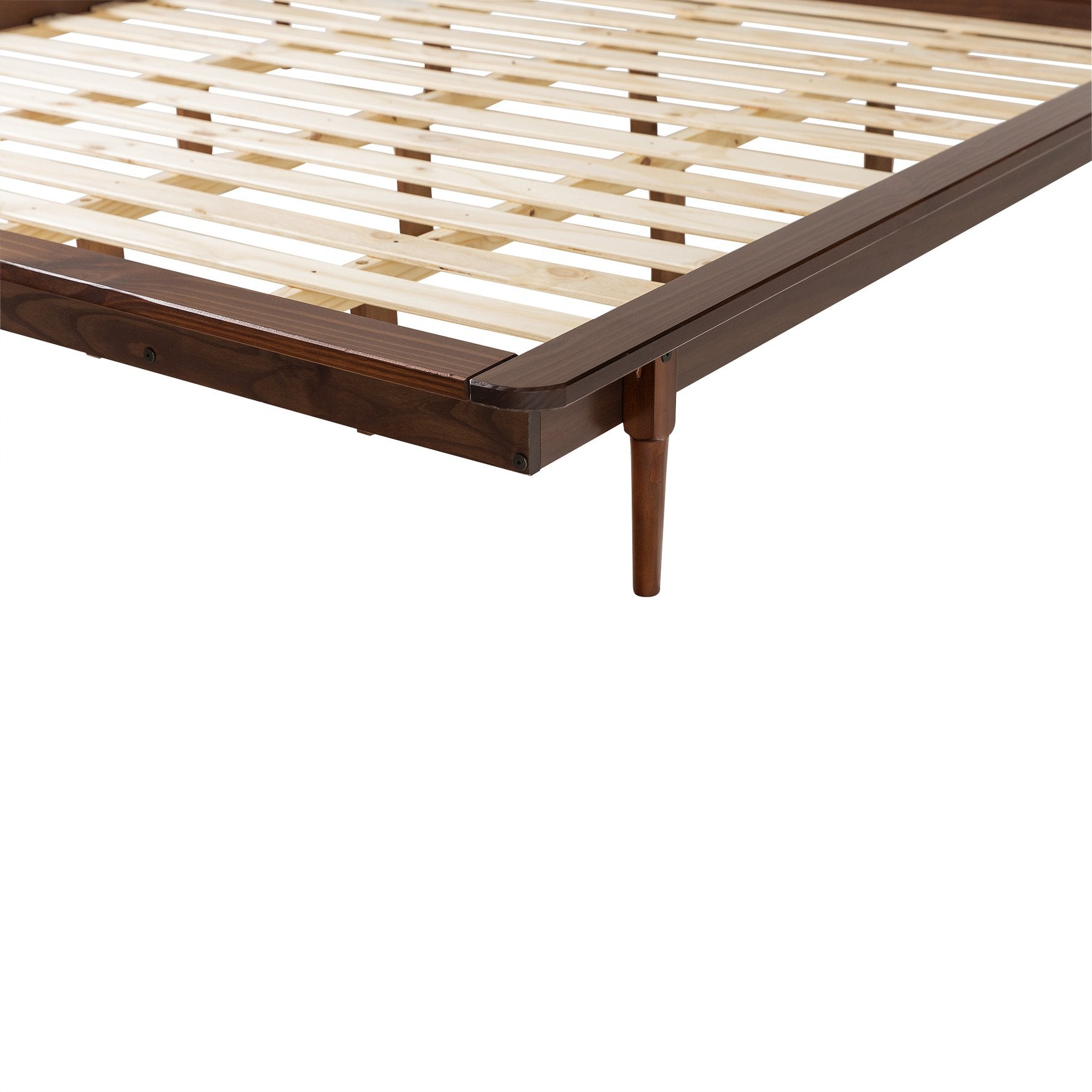 Invite timeless mid-century style into your bedroom with this solid pine king platform bed in a warm caramel finish. Designed for durability and a clean, low-profile silhouette, it combines sturdy construction with nostalgic tapered legs and a simple slatted platform that eliminates the need for a box spring. Easy to assemble and built to last, this bed provides reliable support and an elegant focal point for a variety of decor styles.