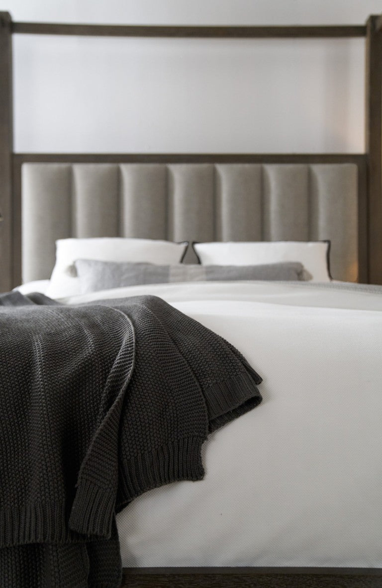 - Headboard: vertically-channeled upholstery in Cleary Cement — soft, neutral tone that complements many decor schemes