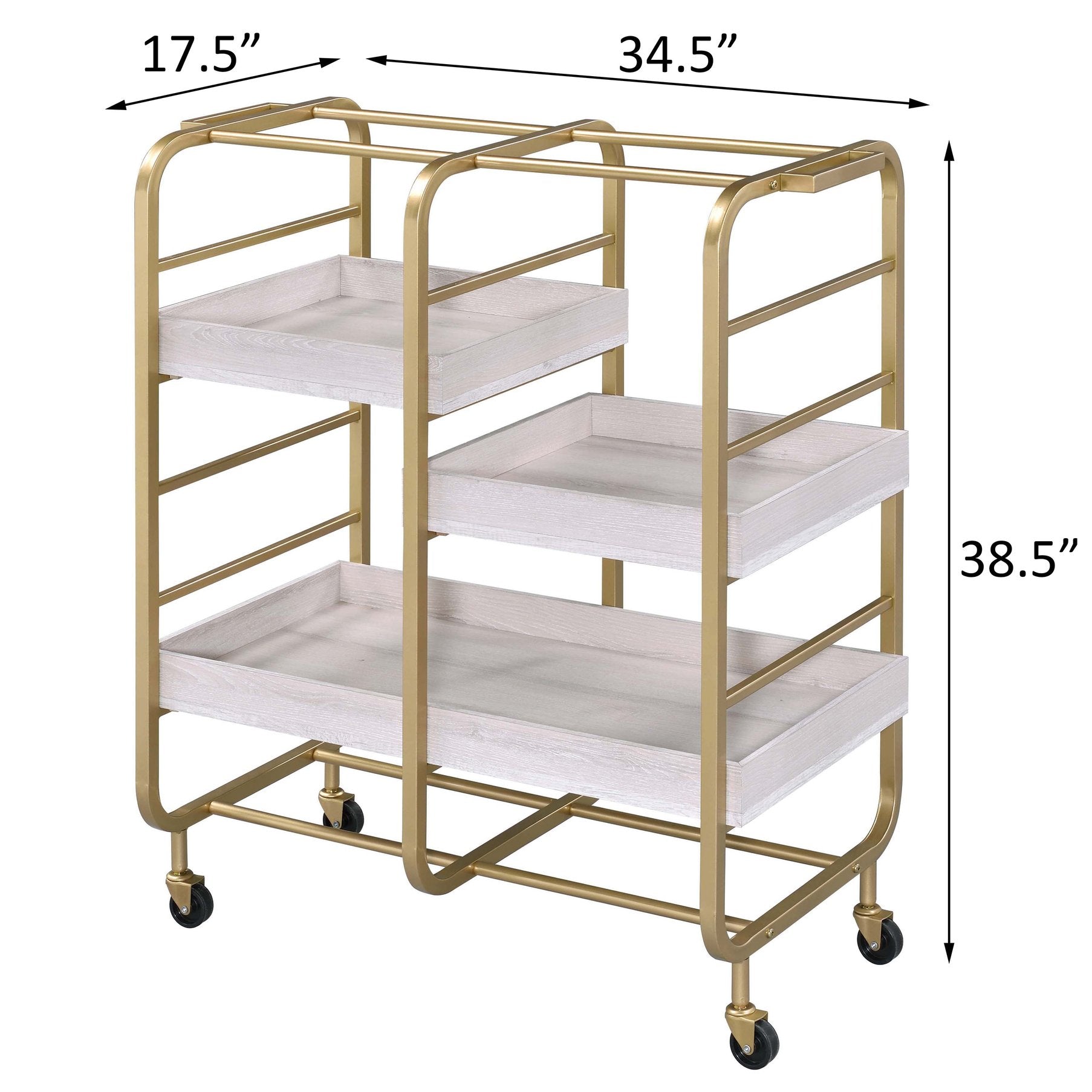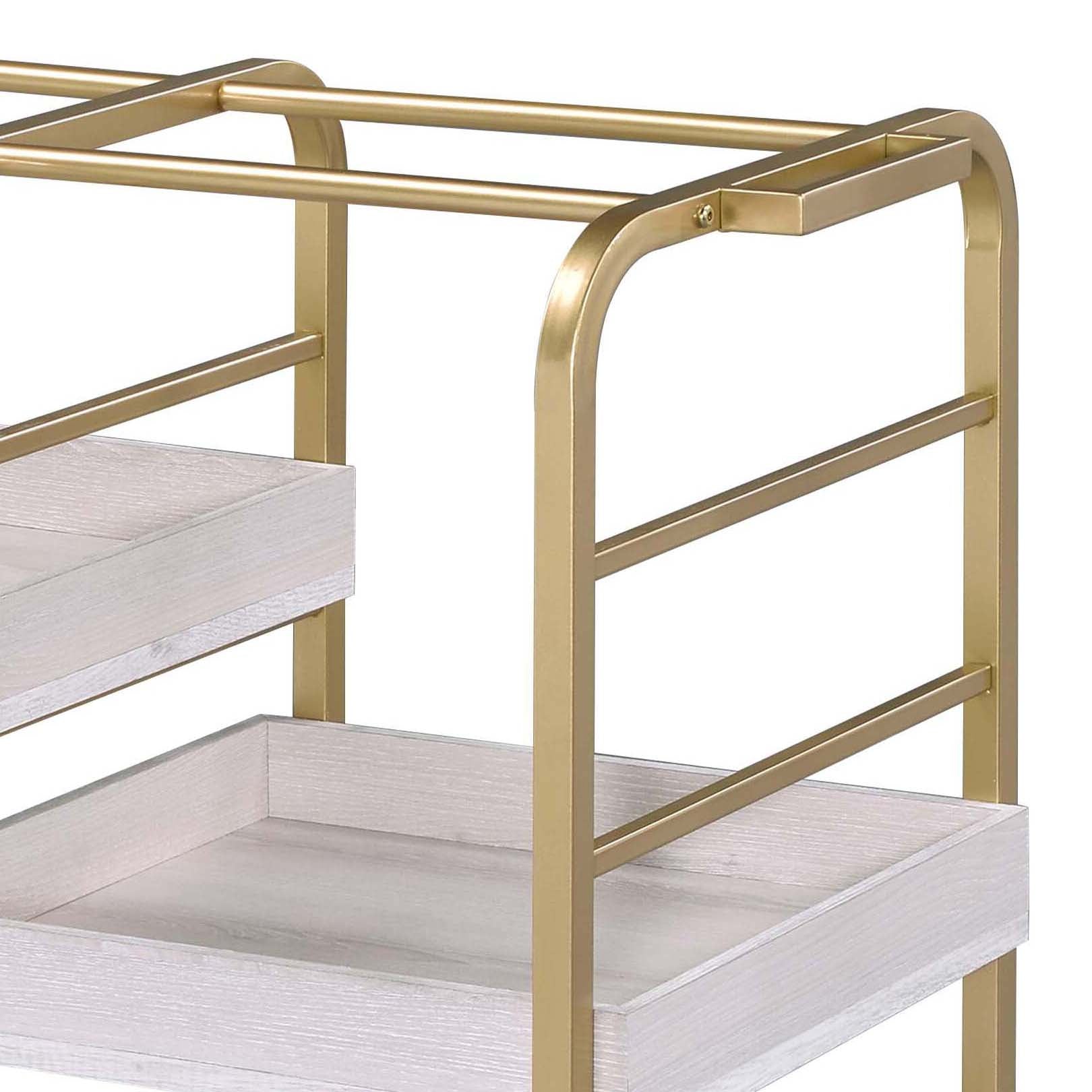 Elevate your entertaining with this elegant Gold and White Washed Serving Cart — a stylish, functional centerpiece that combines vintage-inspired charm with modern durability. Thoughtfully designed for effortless serving and storage, the cart's three adjustable trays and sturdy industrial frame make it perfect for cocktail hours, dessert service, or as a decorative bar or buffet accent. Smooth-rolling casters let you move it anywhere in the home with ease, while the refined gold and white finish adds a luxe touch to any room.