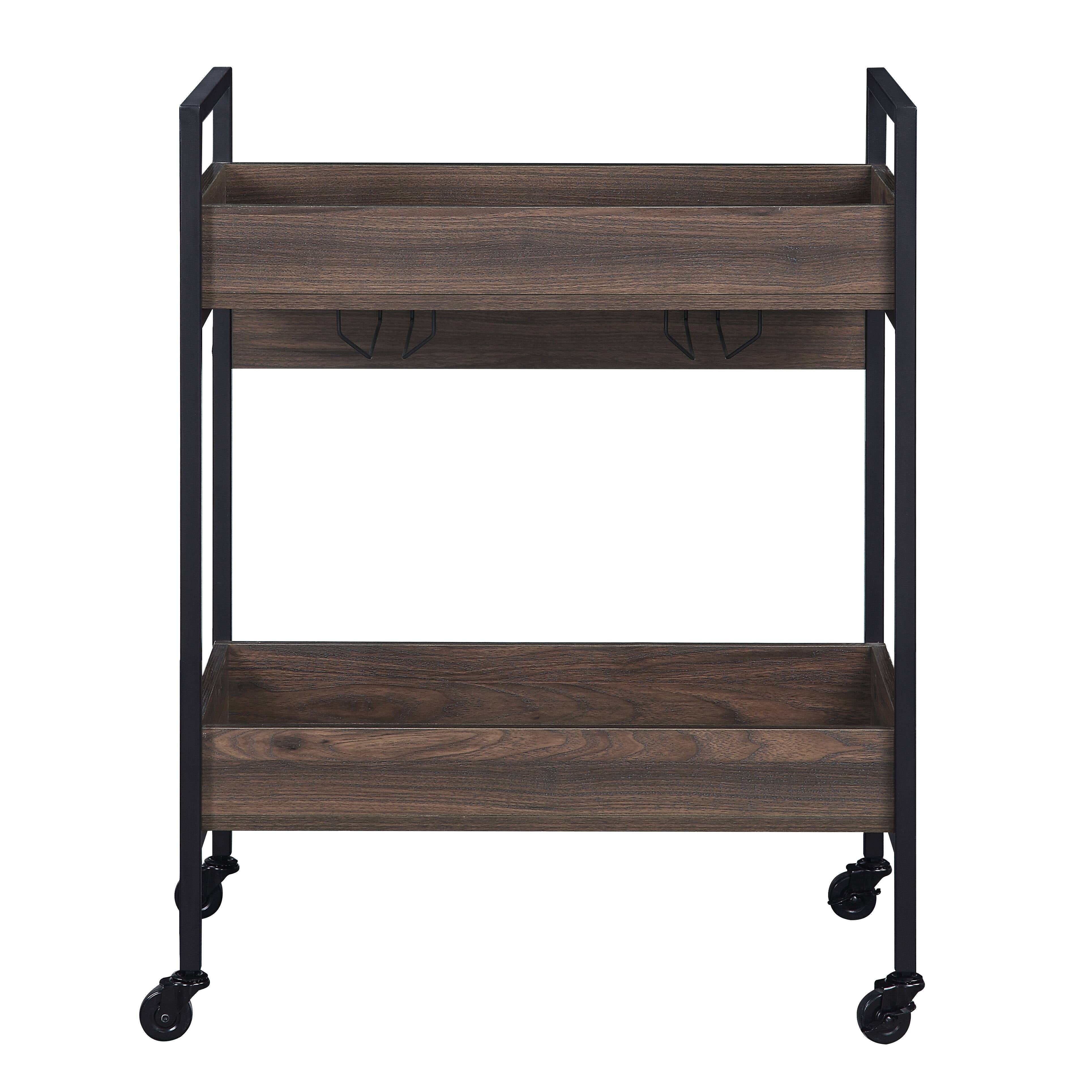 Elevate your entertaining and everyday serving with the Jerrick Walnut & Black Finish Serving Cart. Combining industrial metal accents with warm walnut tones, this two-tier rectangular cart offers sturdy utility, thoughtful details like a cup holder, and compact dimensions that fit kitchens, dining rooms, or small host spaces. Its powder-coated metal frame and melamine-finished wooden top deliver durability and easy care, while the open design keeps essentials accessible and stylish.