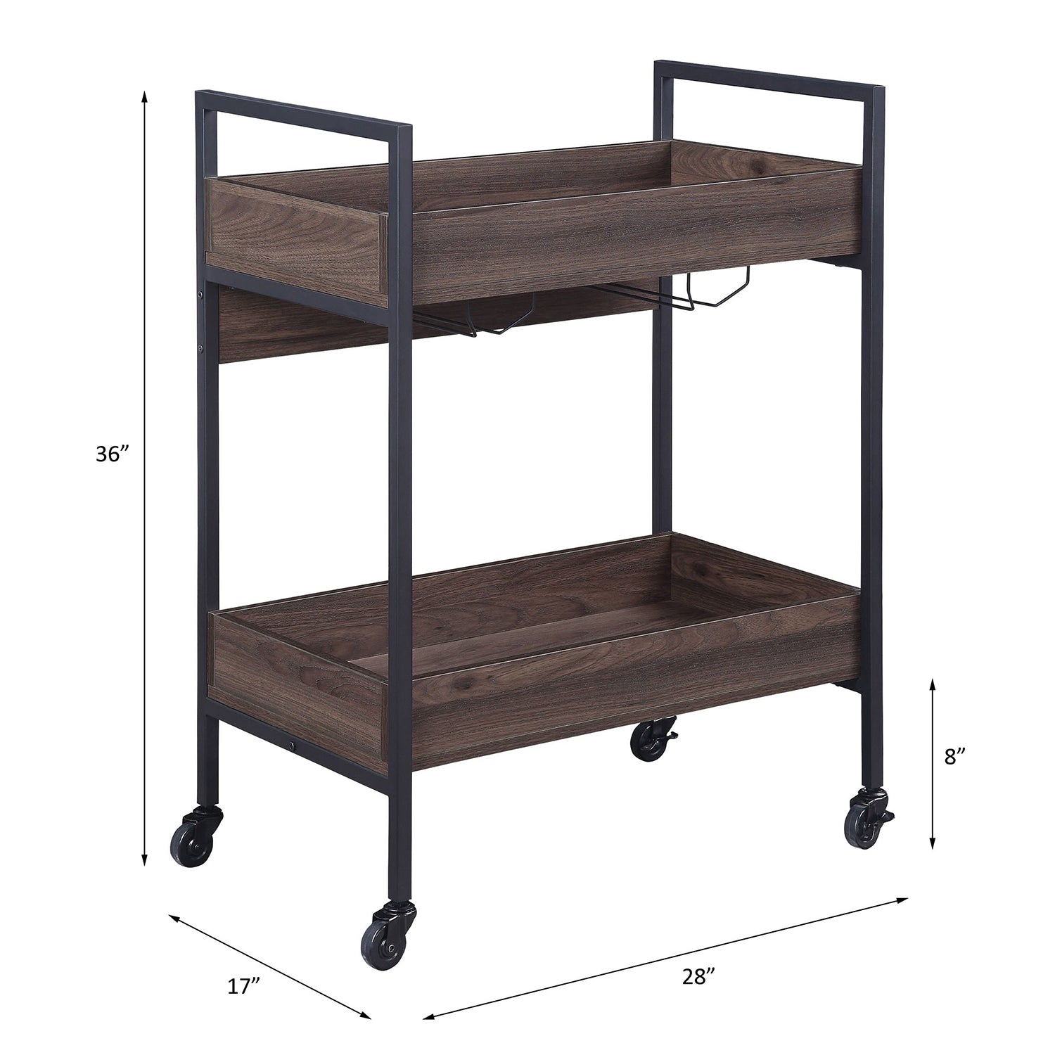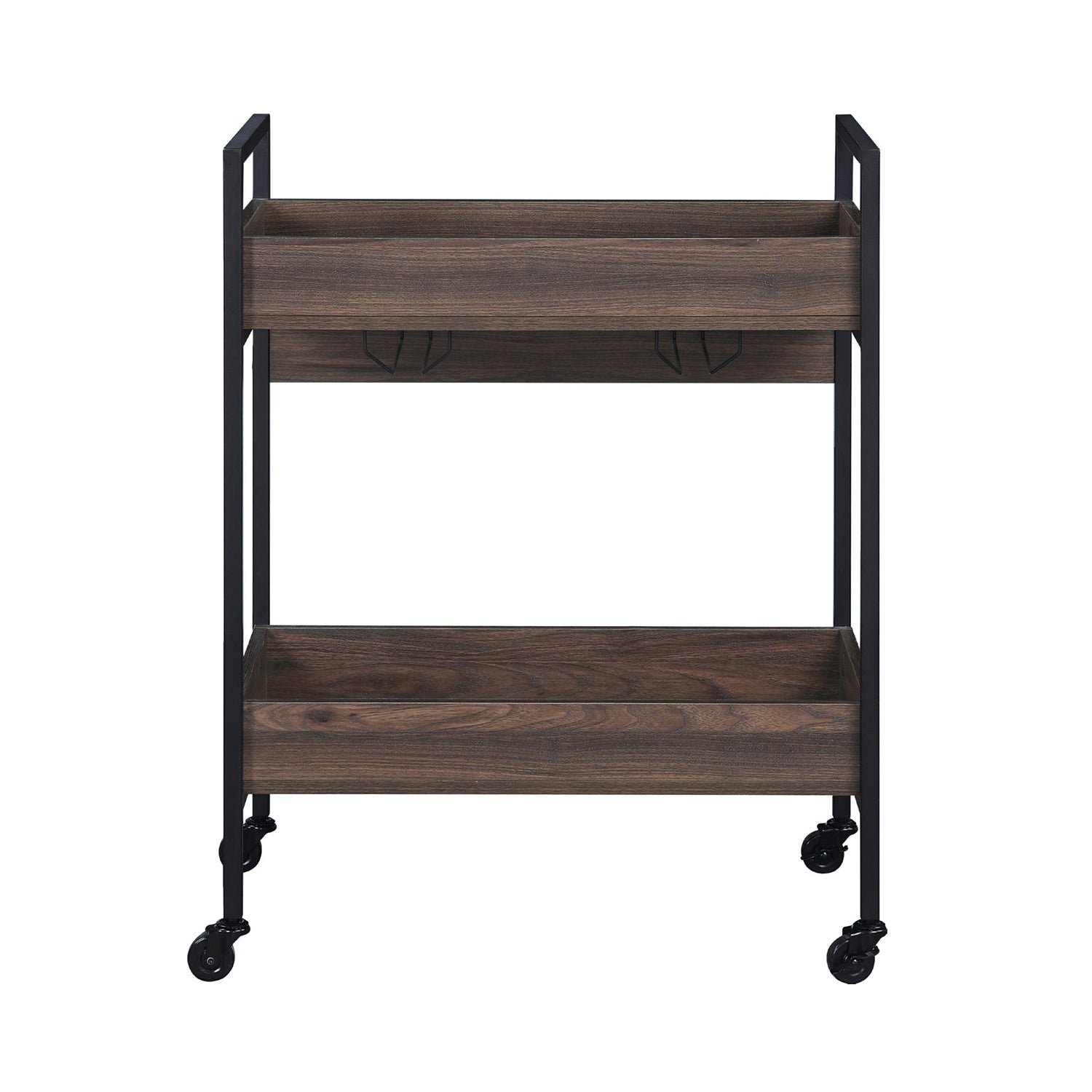 Add versatile, industrial-chic functionality to your home with this rectangular two-tier serving cart. Thoughtfully designed for mobility and convenience, it keeps drinks, glassware, and serving essentials organized while its warm walnut finish and black frame complement modern and rustic interiors alike.