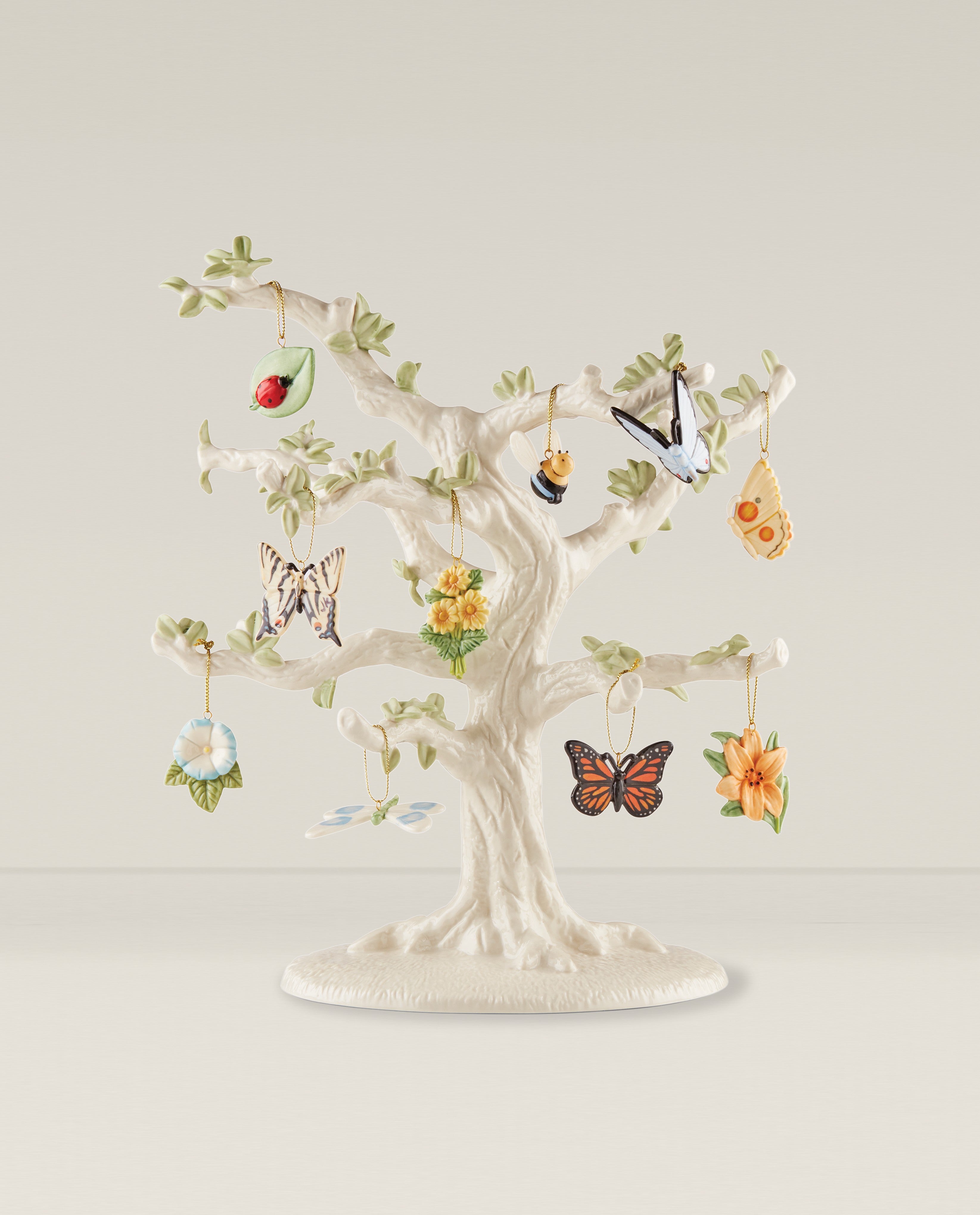 - WhatIsIncluded 1: Includes (1) ornament tree and (10) assorted ornaments: (3) flowers, (4) butterflies, (1) dragonfly, (1) bee, (1) and a ladybug on a leaf