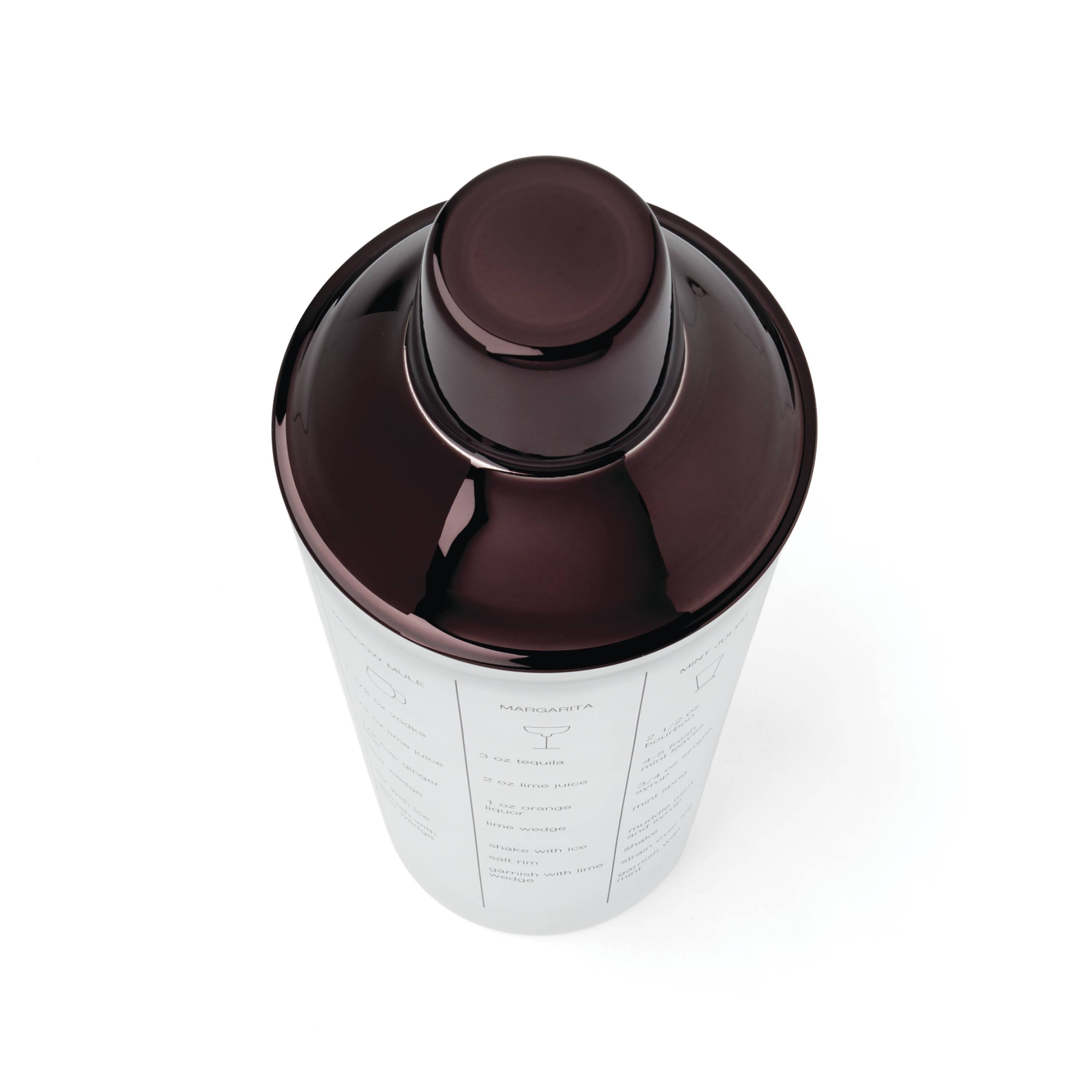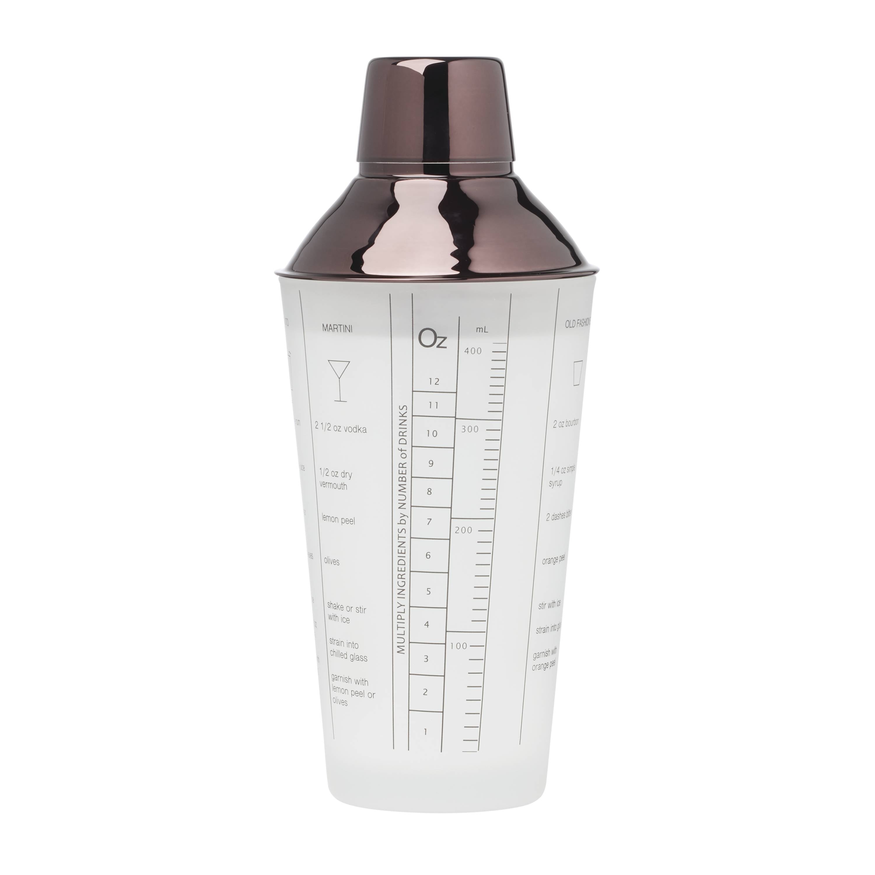 - Glass Shaker features classic, easy-to-read recipes and measure markings
