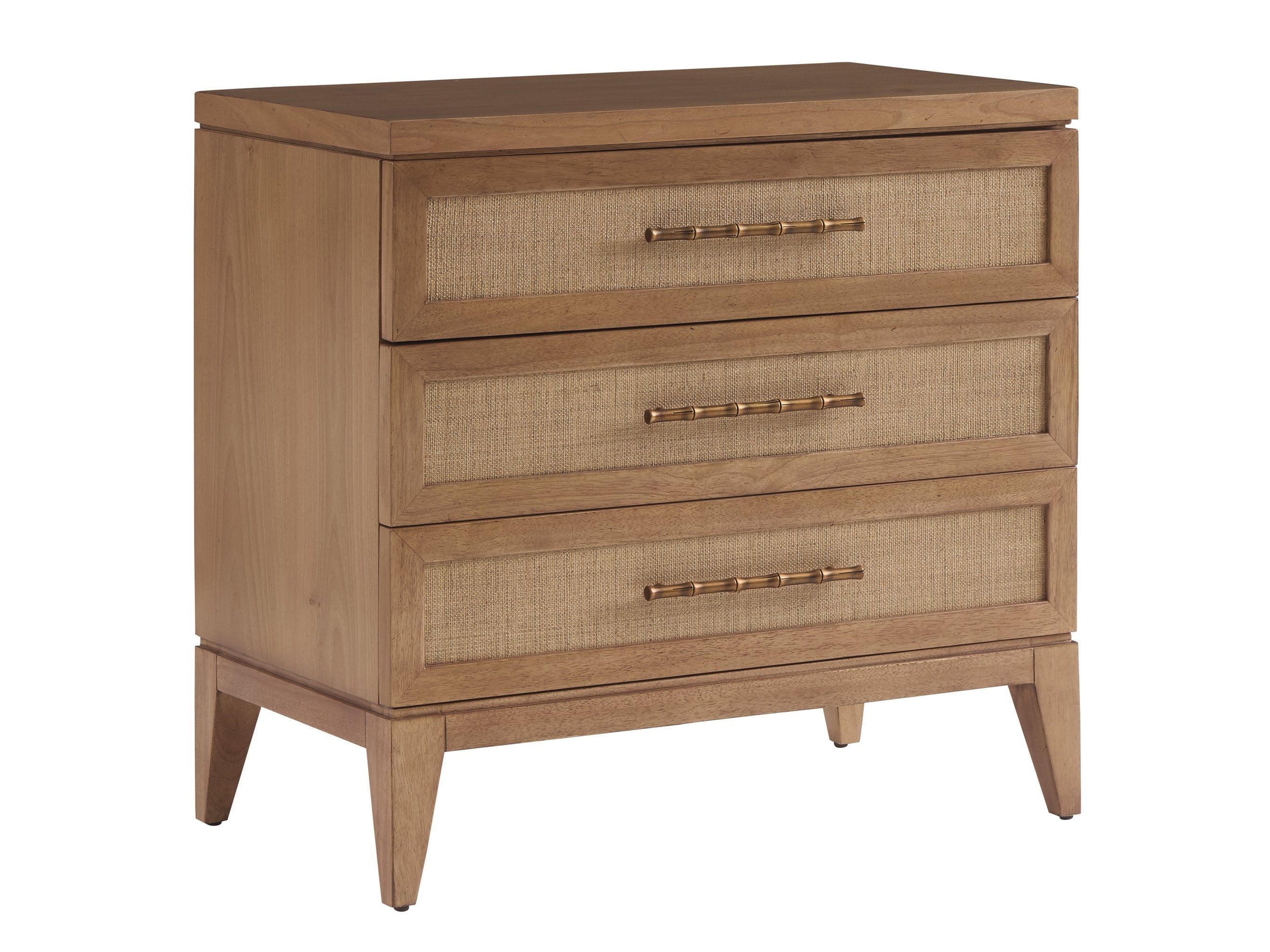 Experience the serene elegance of coastal living with this exquisite nightstand, designed to evoke the tranquil vibes of a beachside retreat. Crafted with meticulous attention to detail, it features a stunning light driftwood finish that beautifully highlights the natural grain of Alder veneers. The woven raffia drawer fronts add a touch of texture, while the elegant burnished brass hardware enhances its sophisticated charm. This nightstand is more than just a practical furniture piece; it encapsulates the essence of relaxation and stylish coastal decor, making it a perfect addition to your bedroom sanctuary.