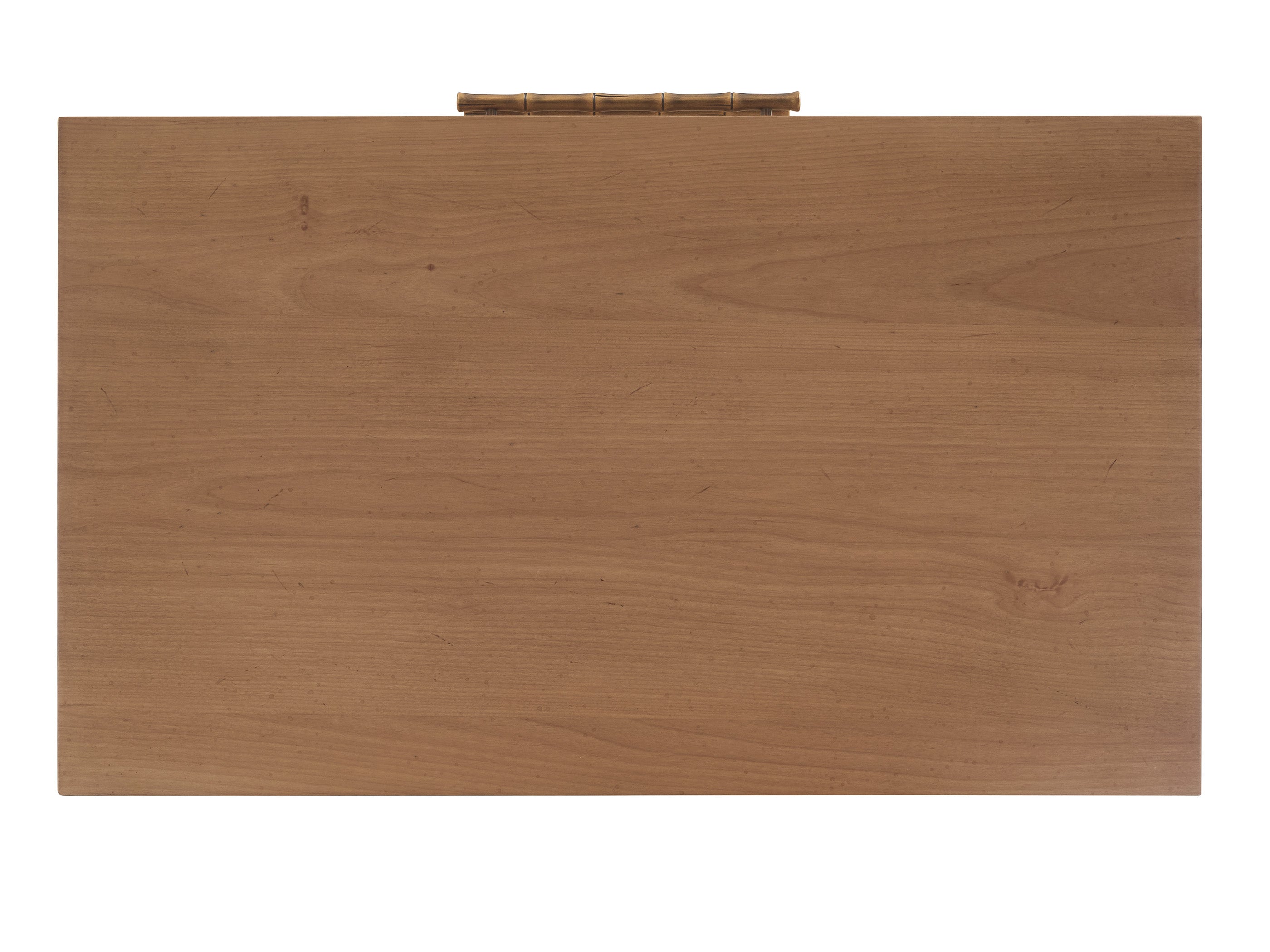- A harmonious blend of natural materials, including leather-wrapped rattan and bamboo veneer