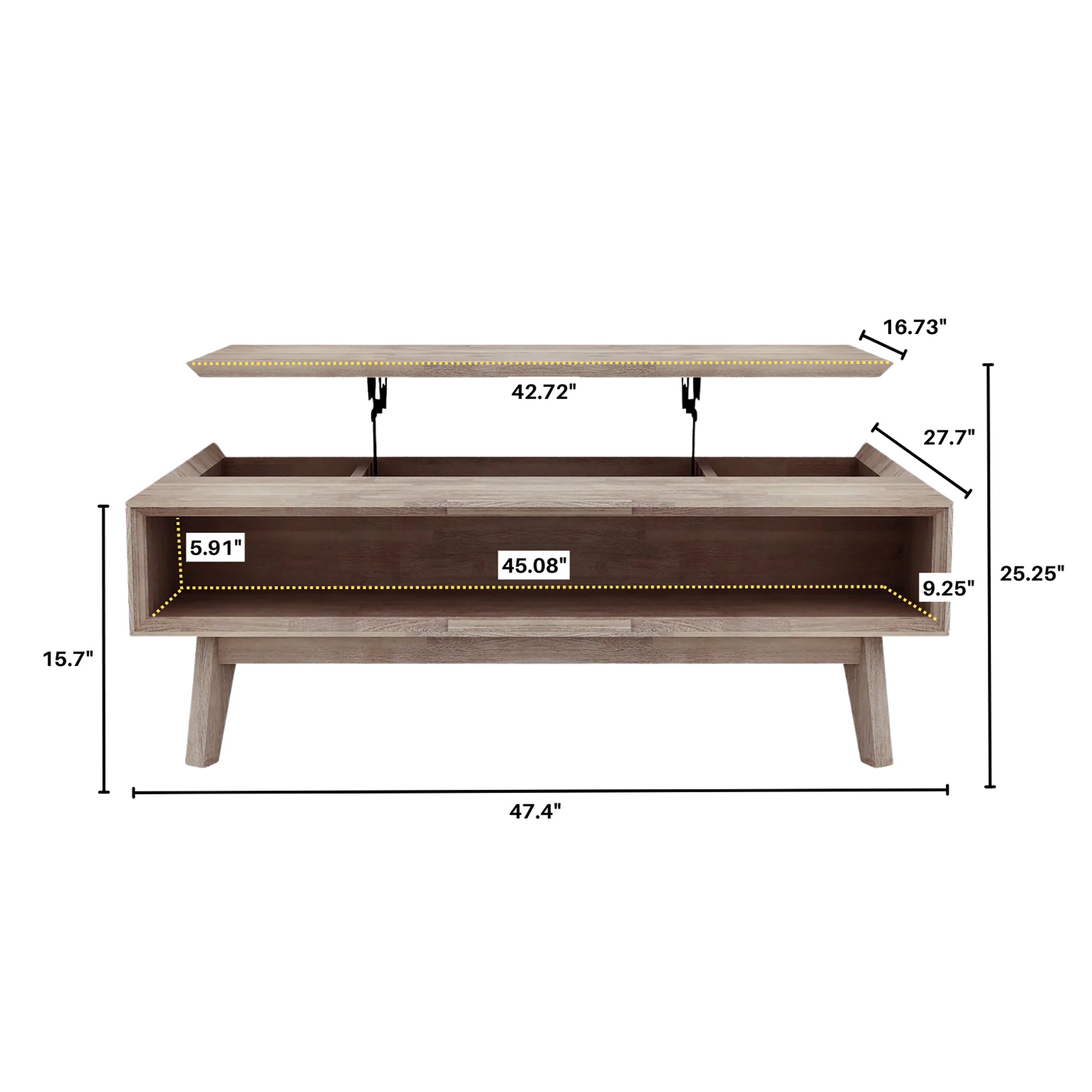 - Additional Dimensions WDH":: Lift Top (WD): 42.72 x 16.73; Overall Height when top is lifted: 25.25; Height from table top to lifted top: 8.1;