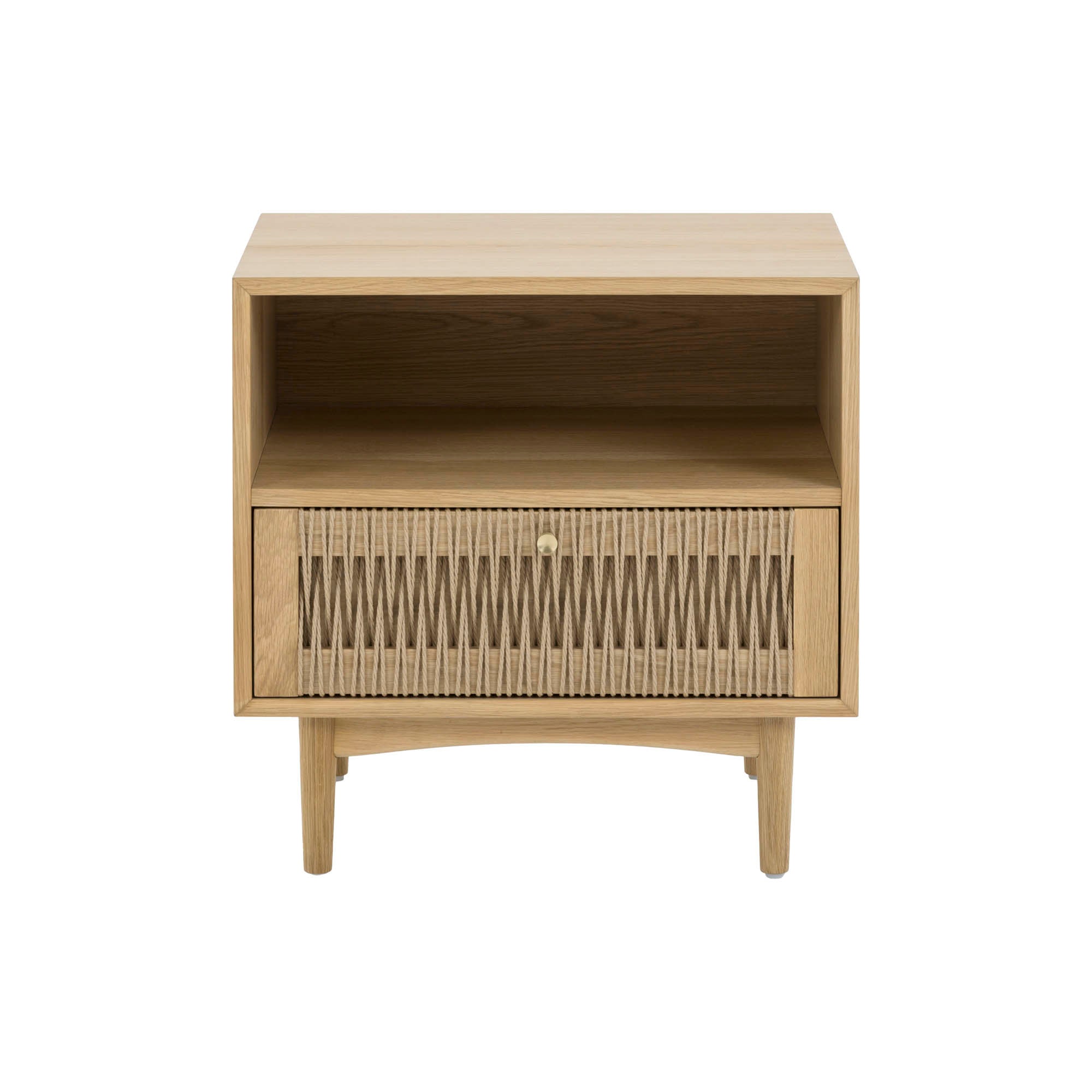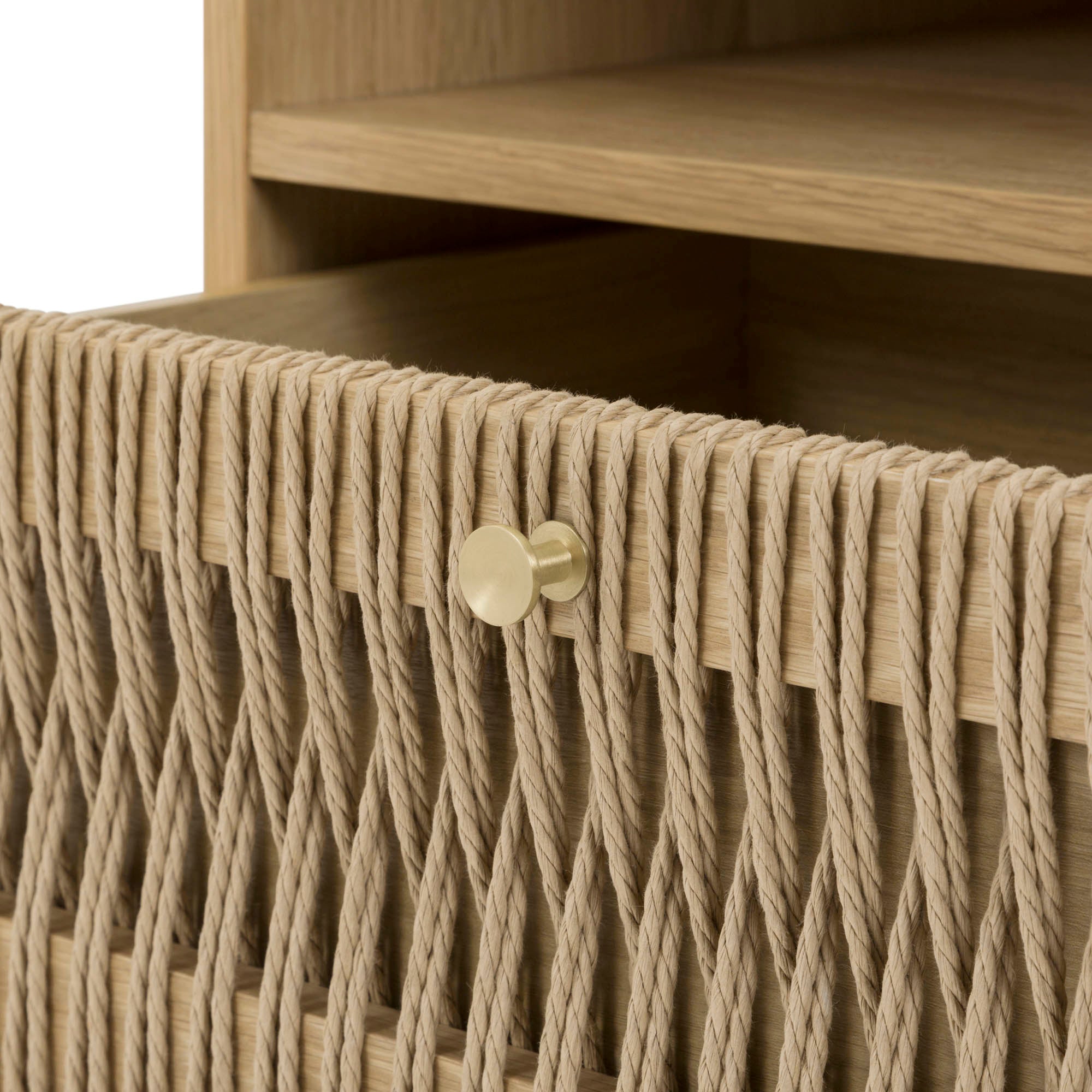 - The nightstand's unique charm lies in its natural paper cord accents. Delicately woven, the paper cord provides a captivating visual and tactile experience, adding a touch of artisanal craftsmanship to your bedroom.