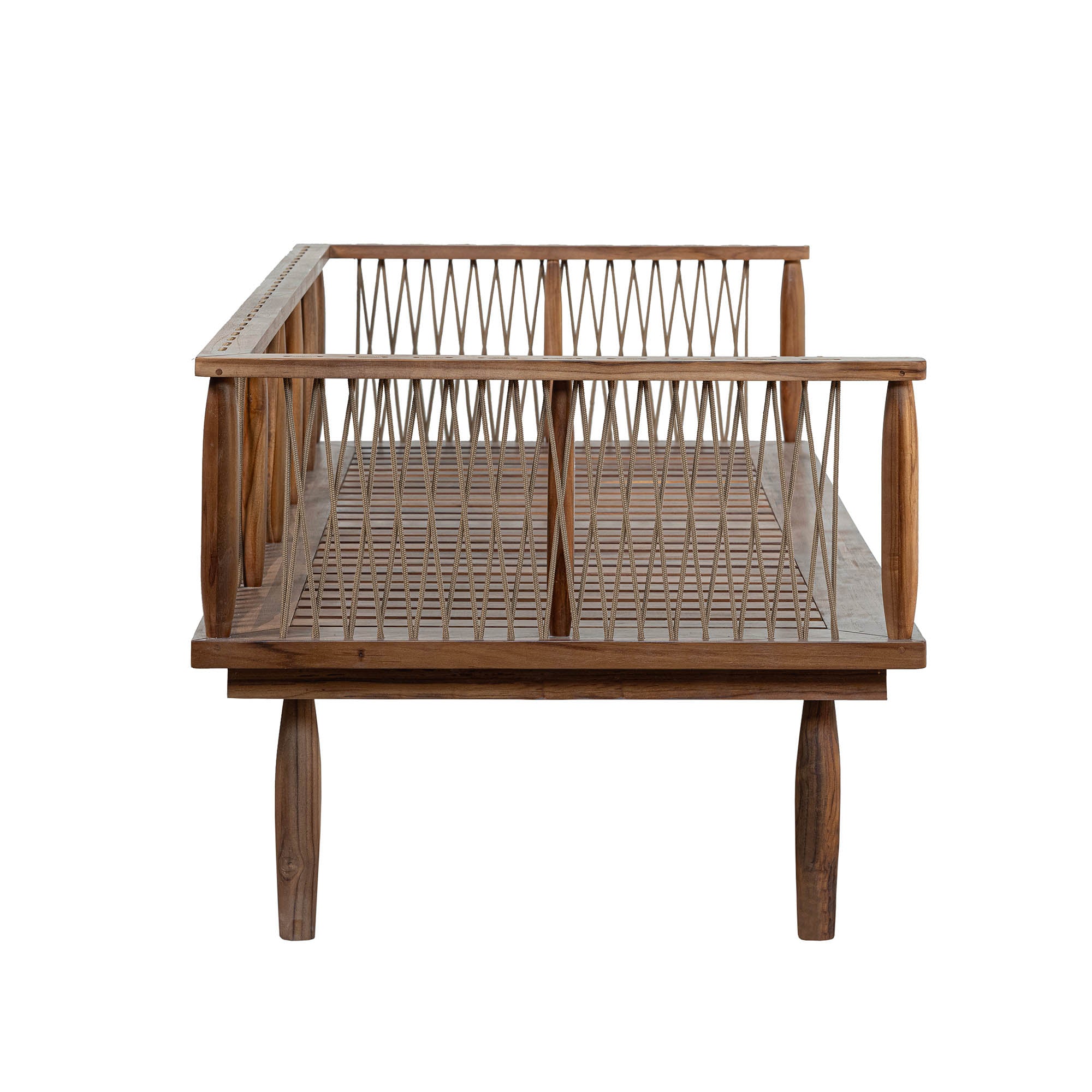 - Experience unparalleled comfort and durability with our outdoor sofa, meticulously crafted from solid teak wood and adorned with rope detailing and luxurious olefin fabric, engineered to resist fading, moisture, and stains, ensuring enduring beauty and effortless maintenance. Bring a touch of sophistication to any outdoor or indoor setting.