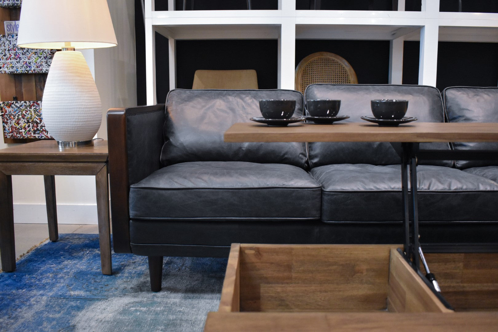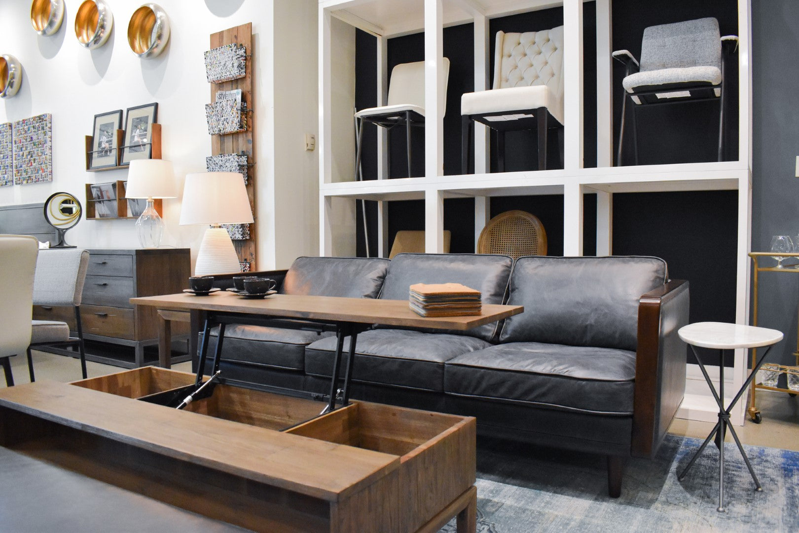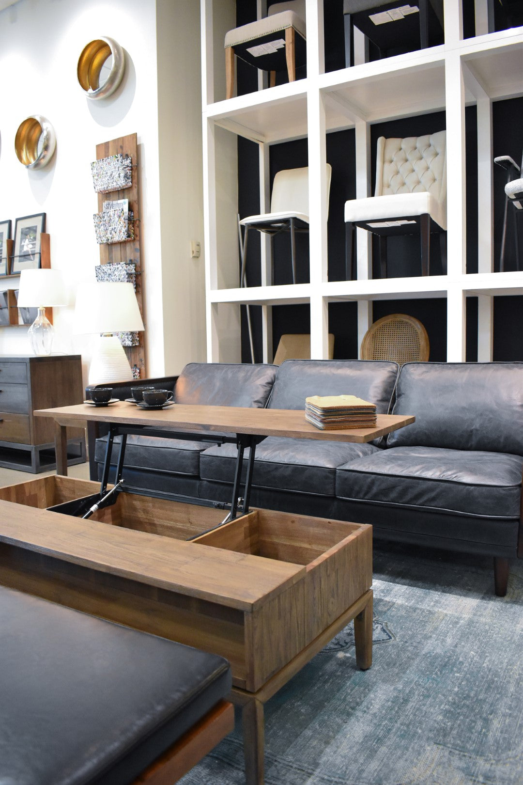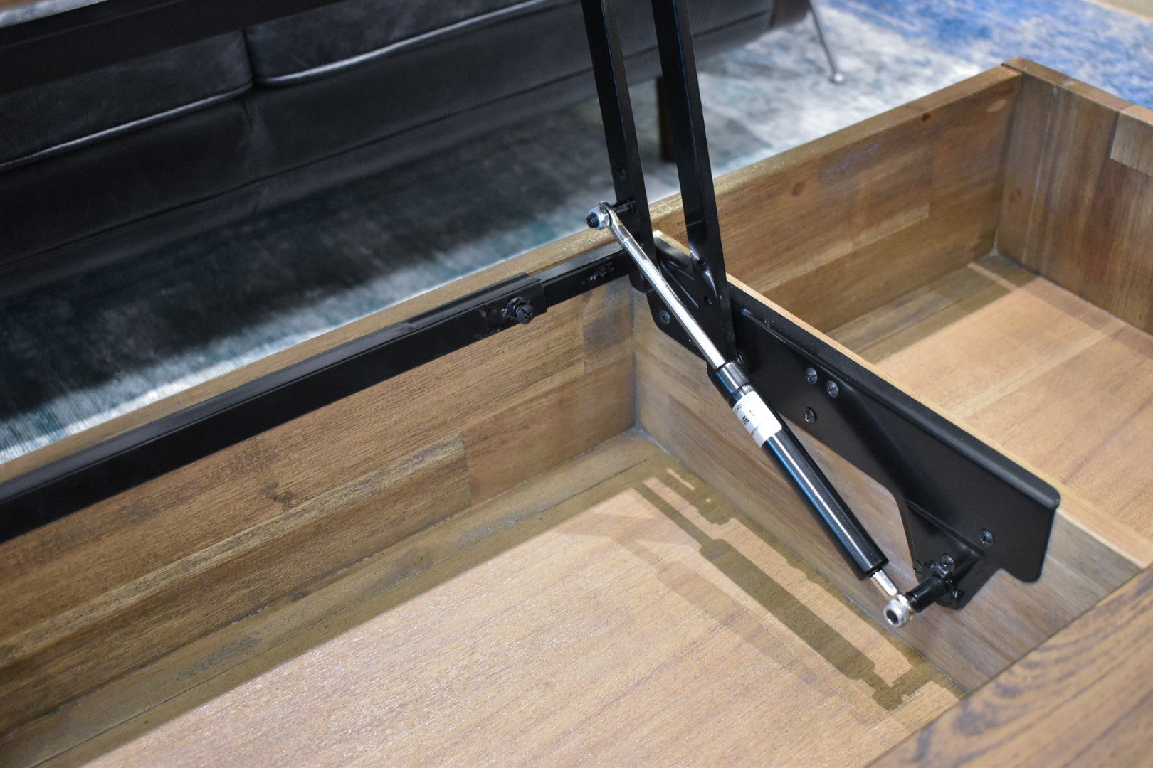 - Inside Dimensions (eg. drawers) WDH":: Inside lift top storage space (3): A: 13 x 14.75 x 5.75; B: 21.5 x 14.75 x 5.75; C: 13 x 14.75 x 5.75; Front niche: 49 x 7.25 x 6;