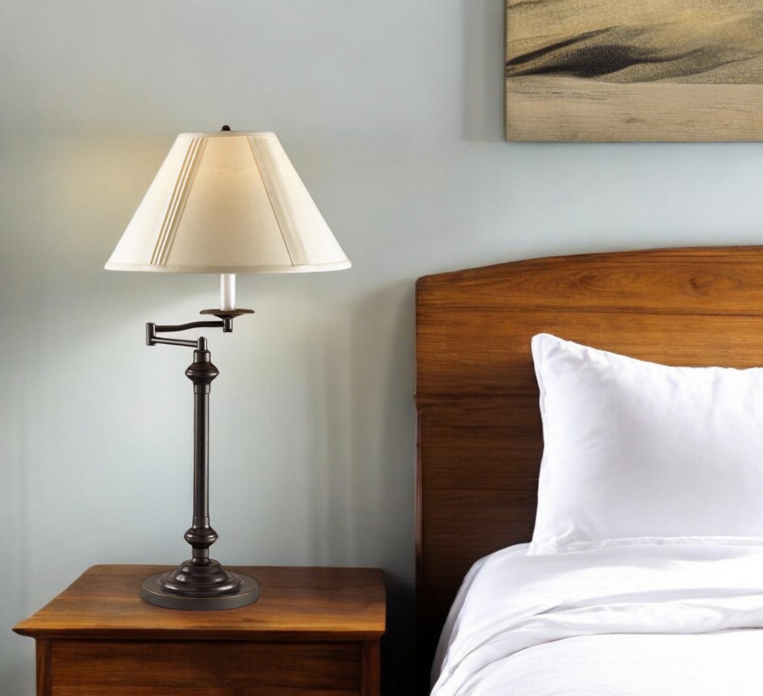 - Traditional candlestick table lamp in antiqued bronze with an off-white empire shade.