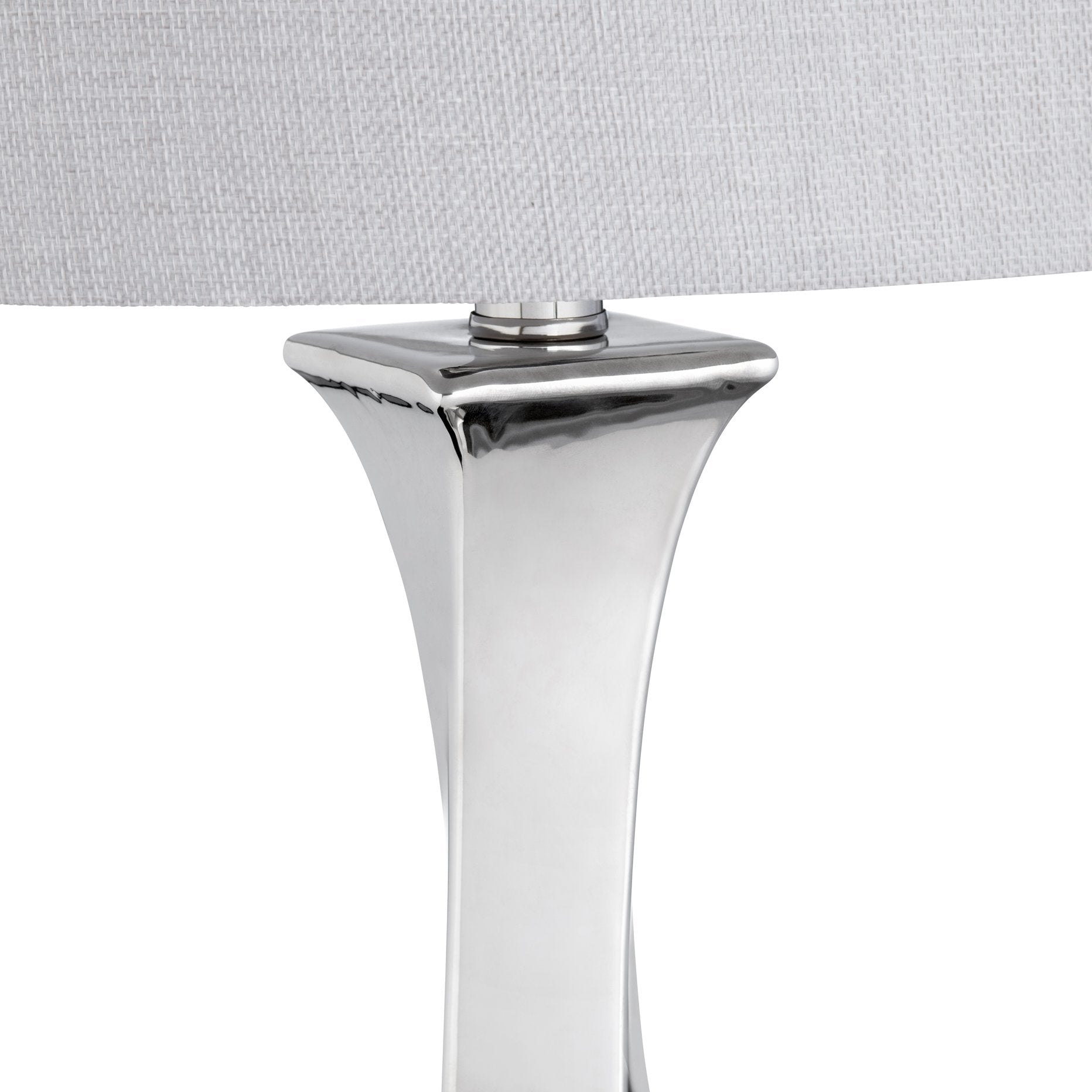 - Grey linen drum shade offers soft, ambient lighting