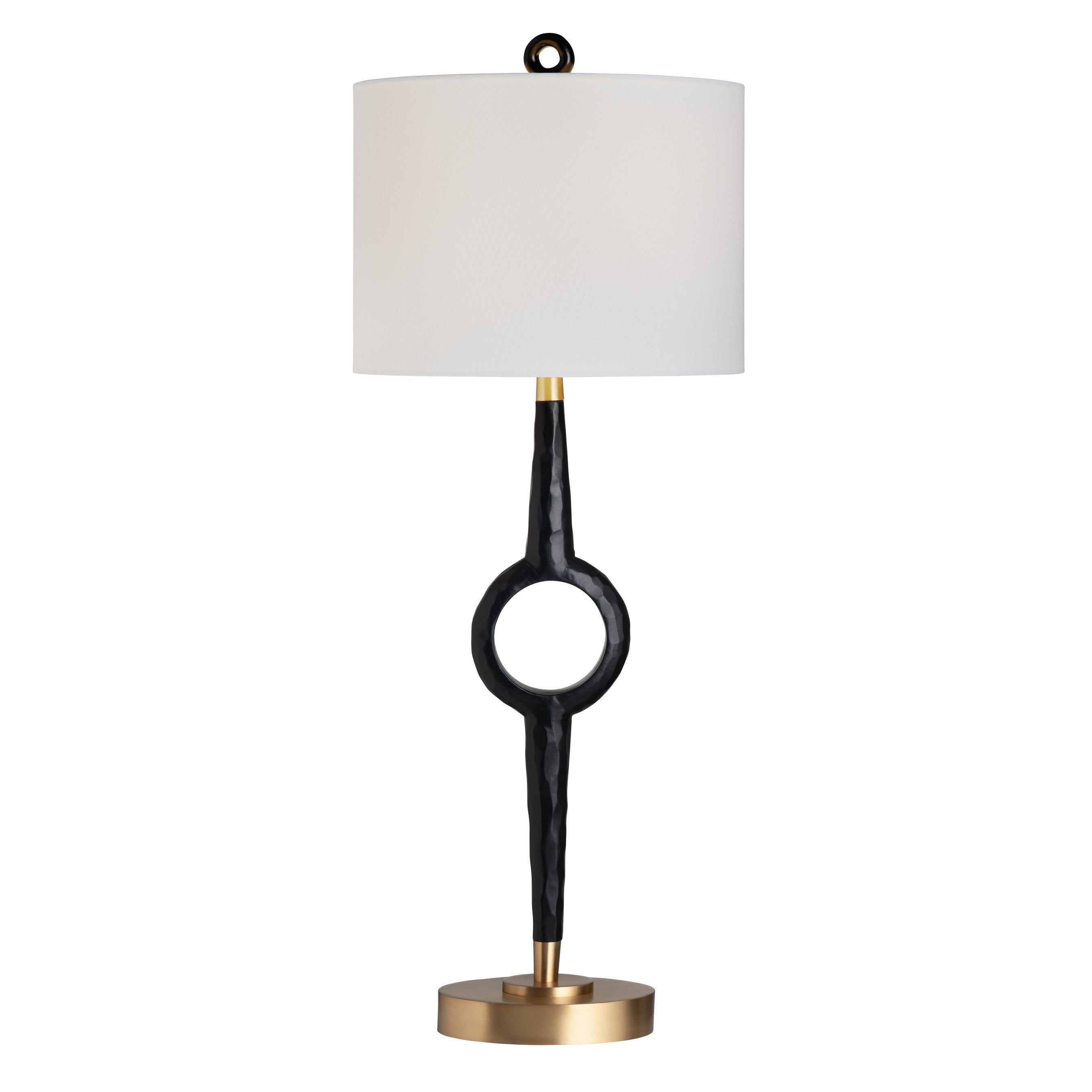 - Topped with a matching finial that mirrors the open circle in the lamp's body