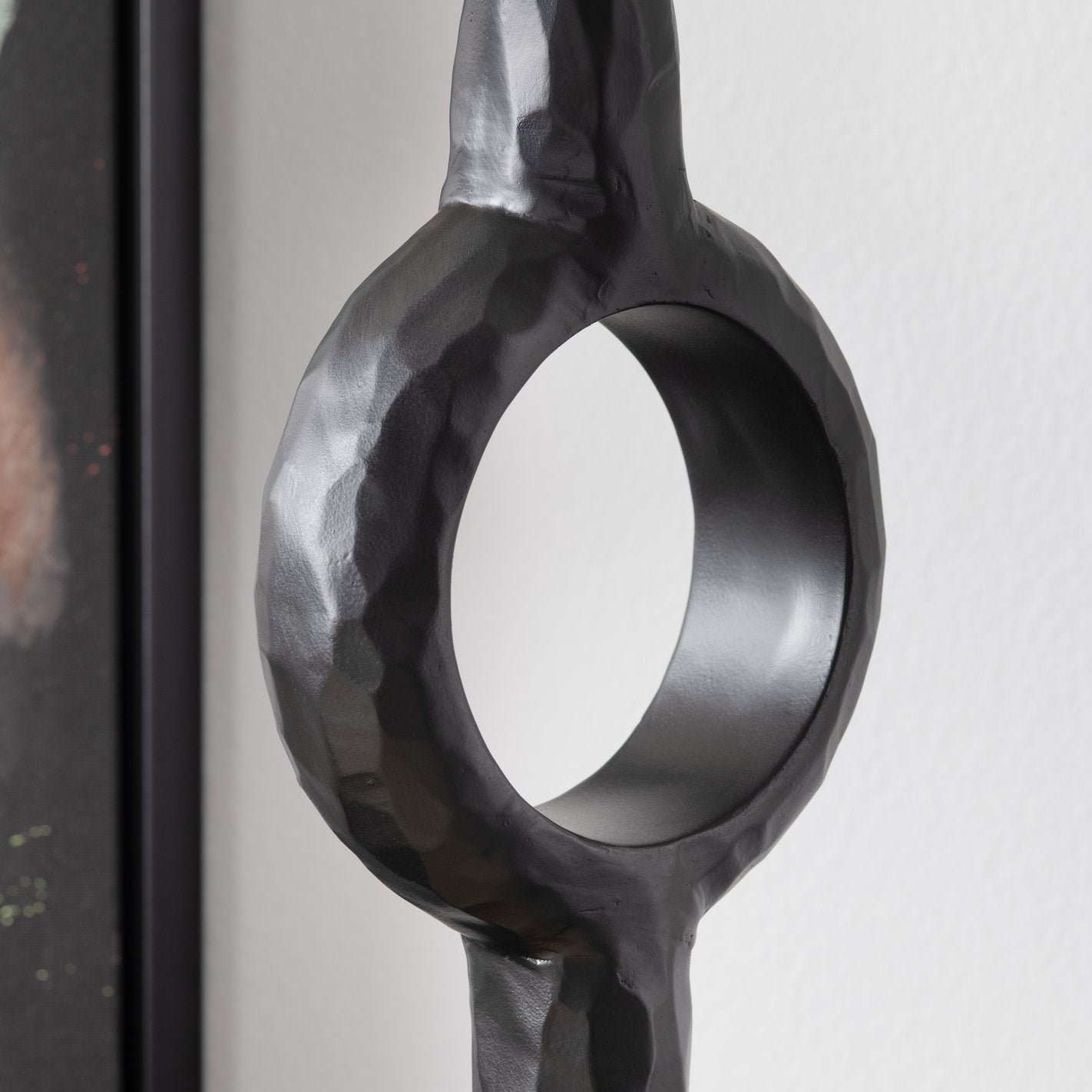 - Slender form featuring an open circular shape in the center for visual interest