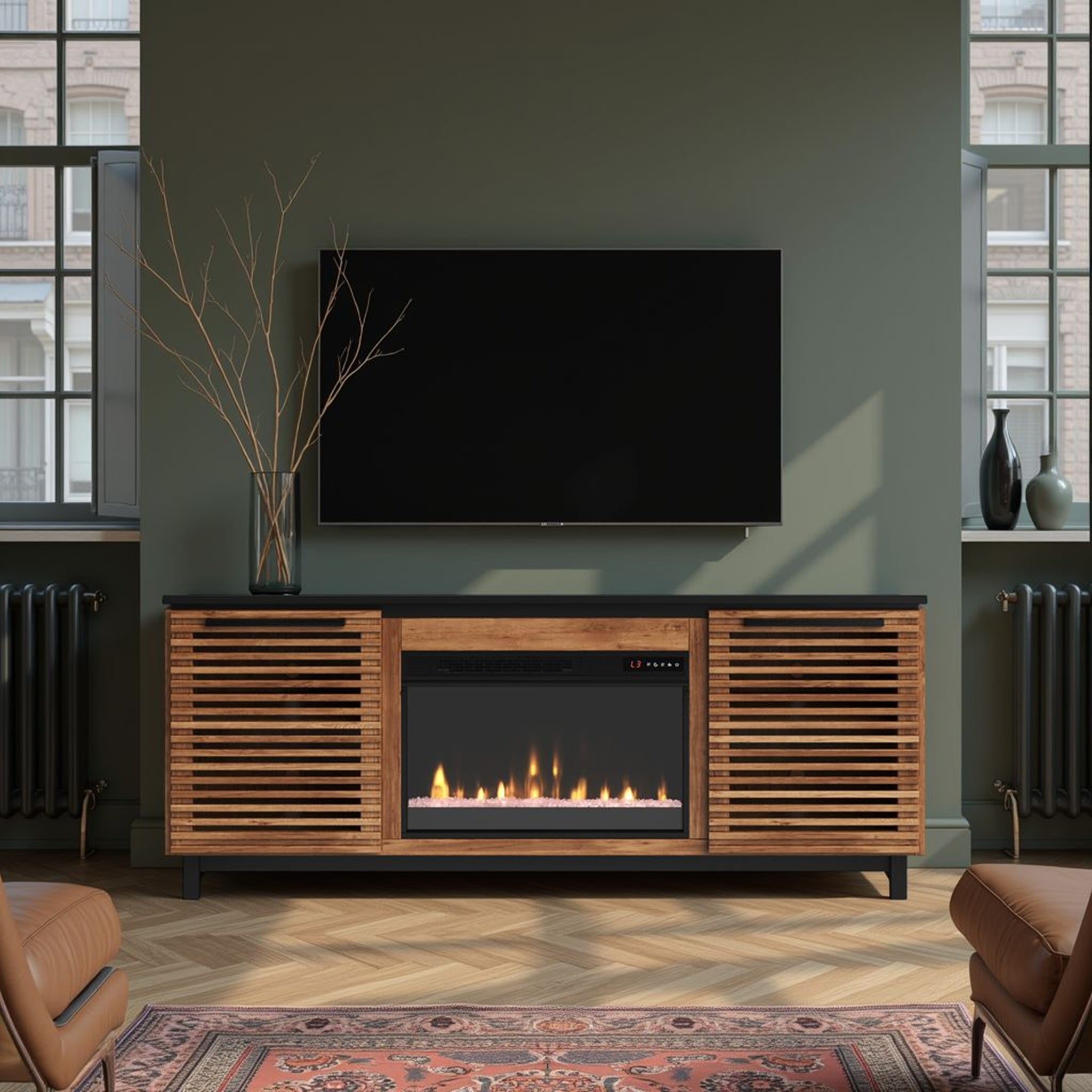 Elevate your living space with this Scandinavian-inspired 69" fireplace TV console, designed to combine modern styling with practical functionality. Crafted from solid poplar and Okume veneers in a two-tone Bourbon and Black finish, this entertainment center creates a warm focal point while providing organized storage and a powerful electric fireplace to heat and enhance rooms up to 400 sq ft.