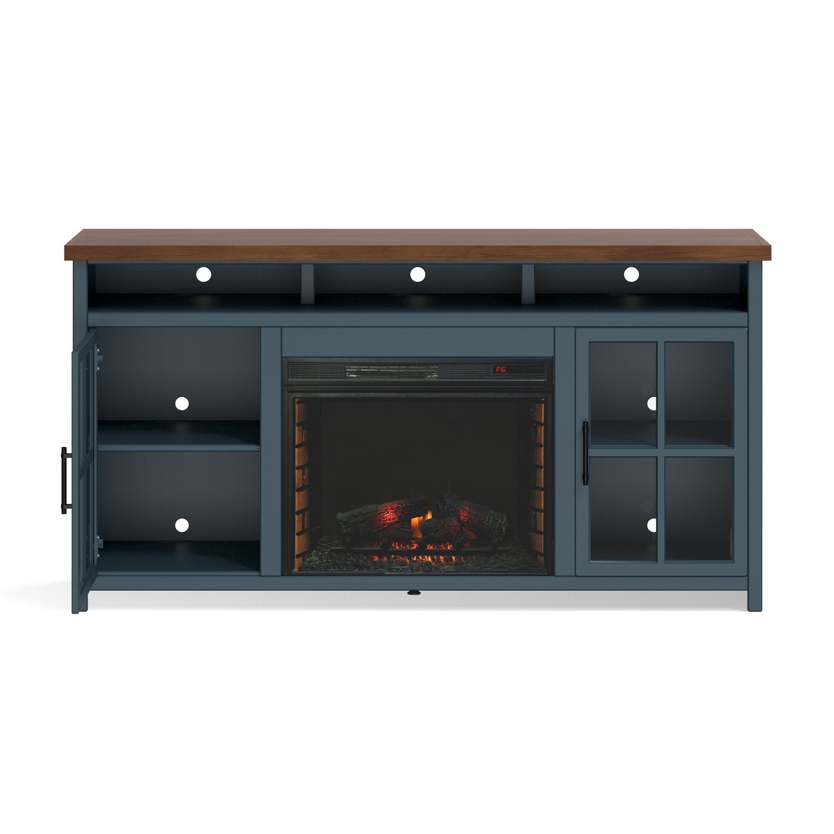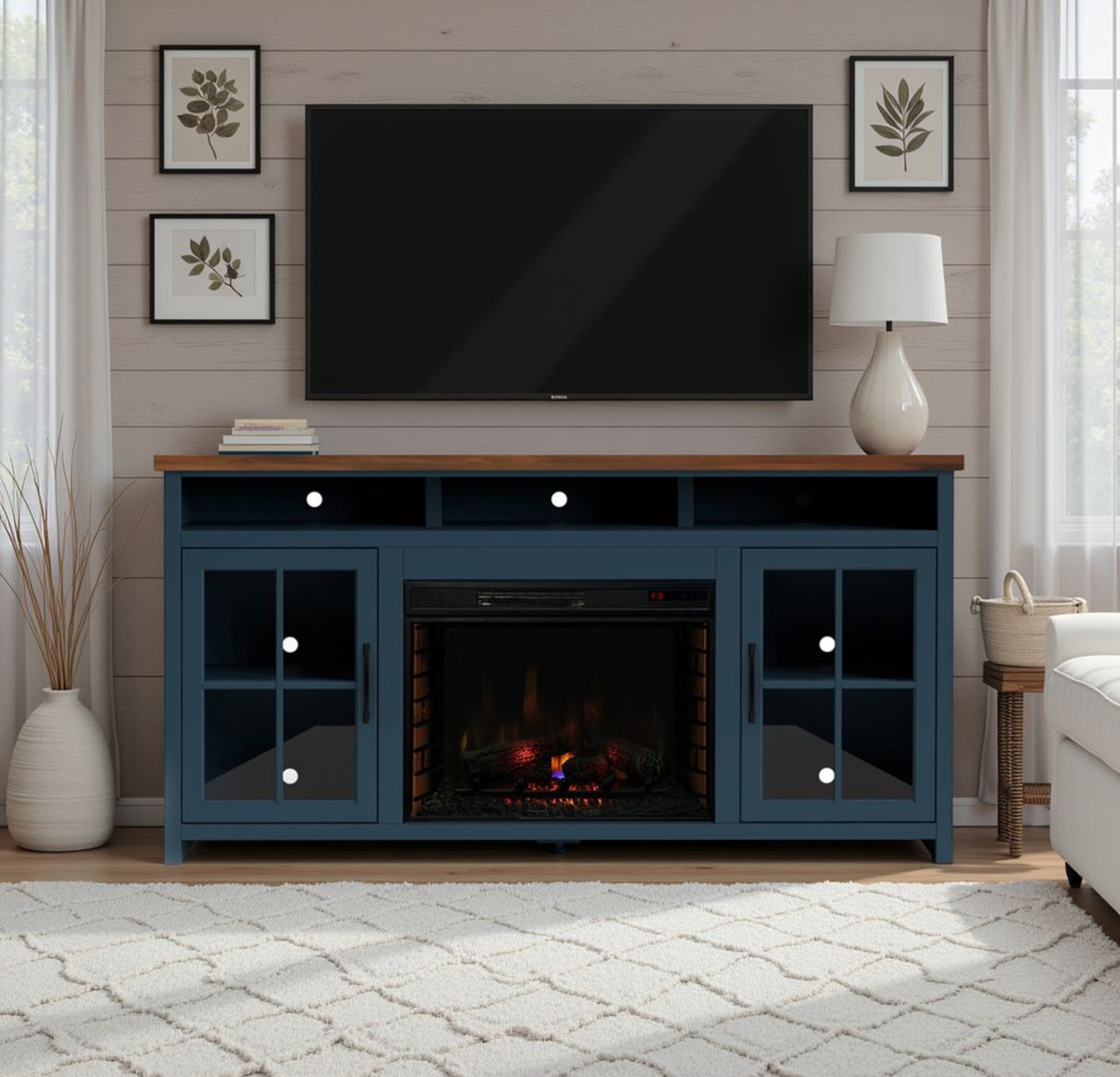 Bring warmth and classic farmhouse charm to your living room with this 74 inch fireplace TV stand console. Thoughtfully designed for modern homes, it pairs a two-tone Blue Denim and Whiskey finish with oil-rubbed bronze hardware and sturdy wood construction to create a focal point that’s both decorative and highly functional. Easy to assemble and built to accommodate large TVs, this console organizes media, hides cables, and provides efficient supplemental heating with a convenient electric fireplace insert.