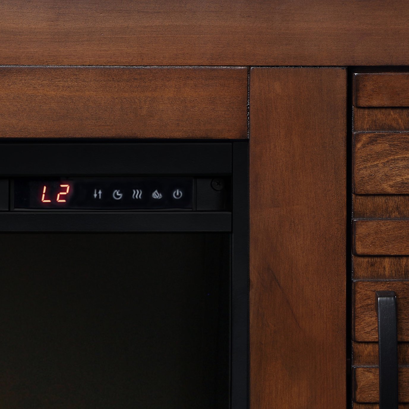 Bring warmth and rustic-modern style to your living room with this robust 78-inch electric fireplace TV console. Skillfully crafted from Knotty Alder solids and veneers with intentional distressing and a rich Whiskey finish, it combines striking visual texture with practical storage and media-friendly features. The included 42-inch electric fireplace insert provides adjustable heat and flame settings, while thoughtful cable management and ample shelving keep your entertainment area tidy and functional.