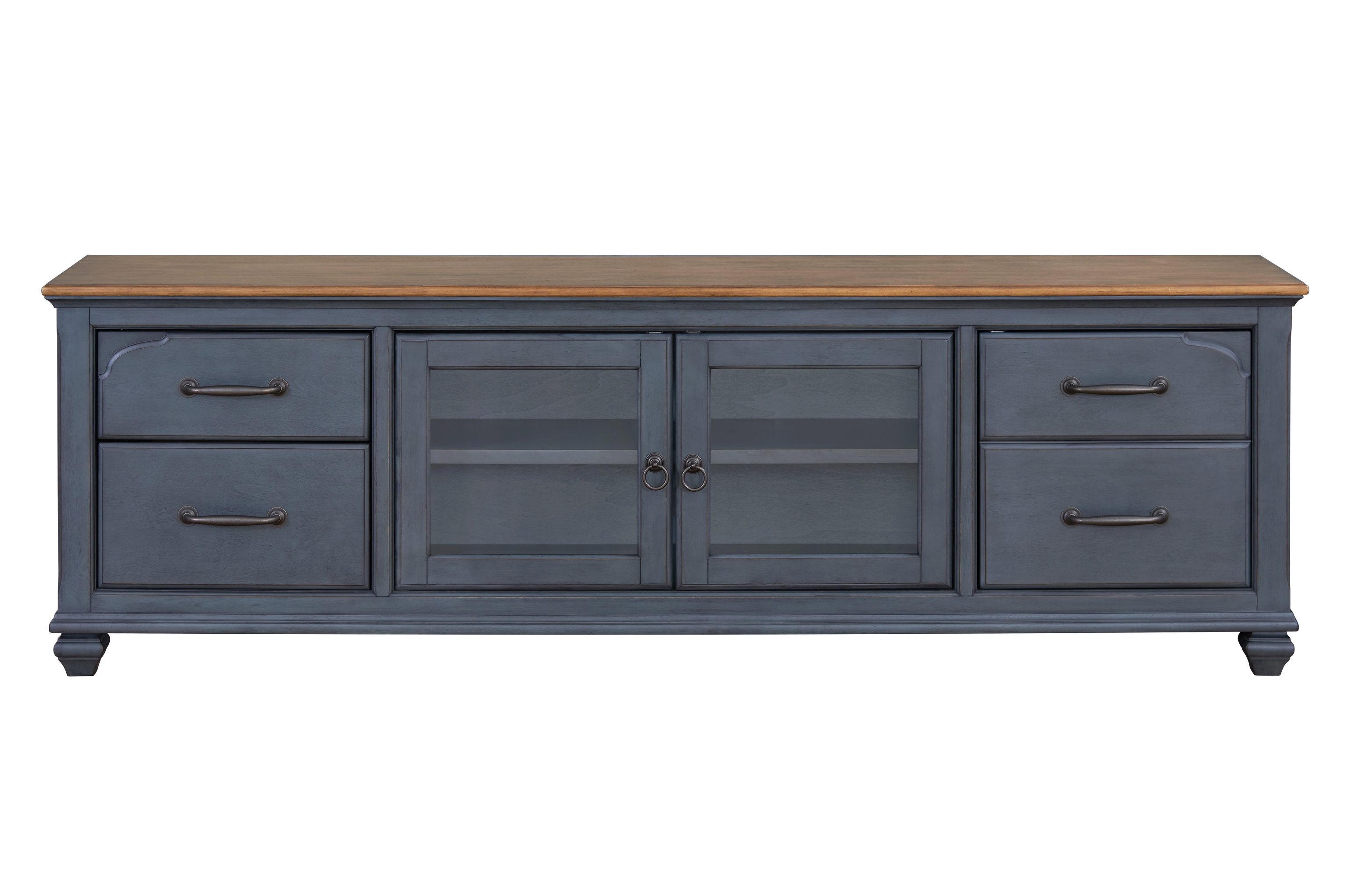Bring coastal charm and ready-to-use convenience to your living room with this fully assembled TV console. Crafted with quality materials and thoughtful storage, it blends classic lines with a relaxed Corduroy Blue finish to complement both modern and traditional décor. Designed to support large screens while keeping media components organized and accessible, this piece is ideal for family rooms, dens, or media centers.