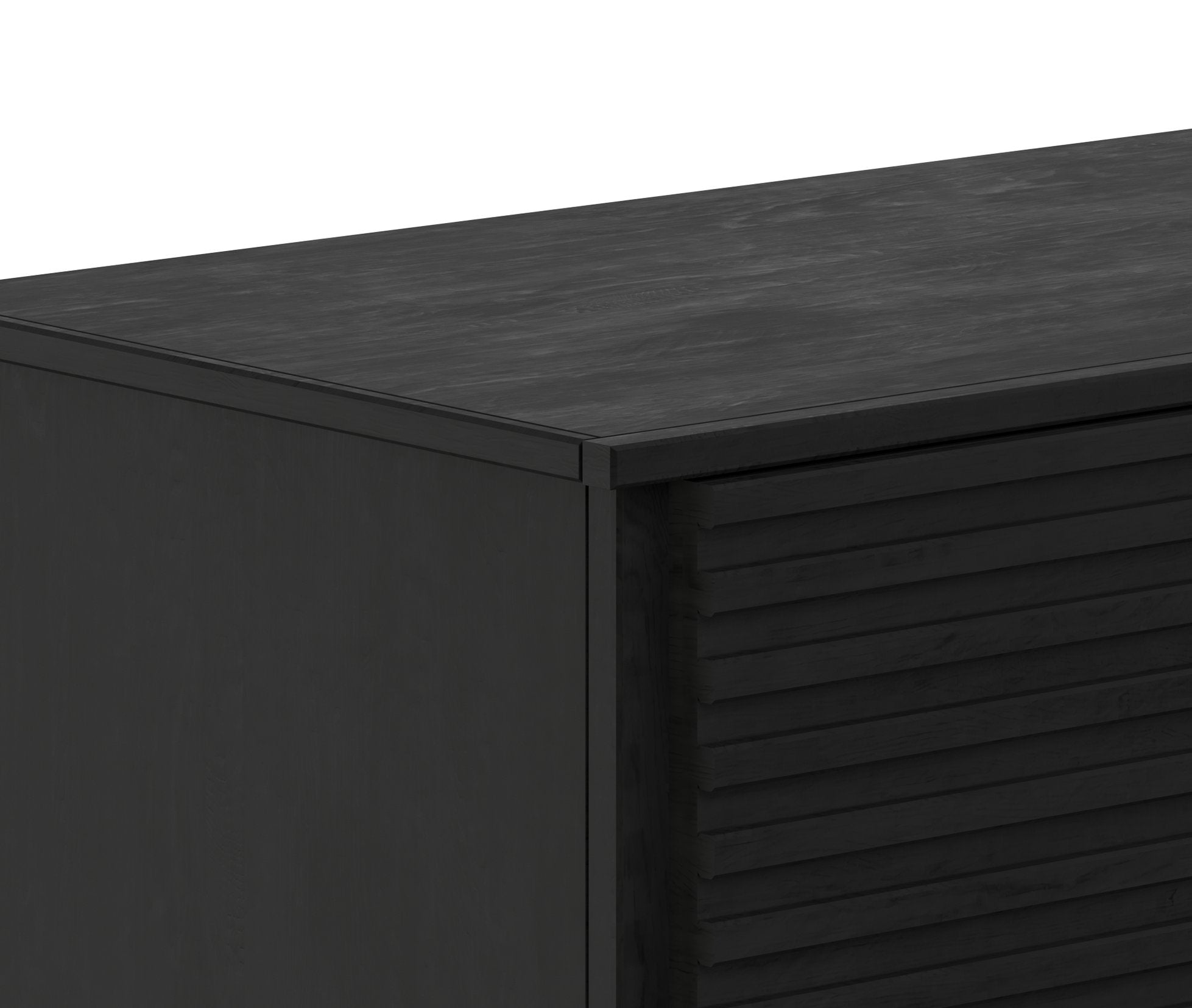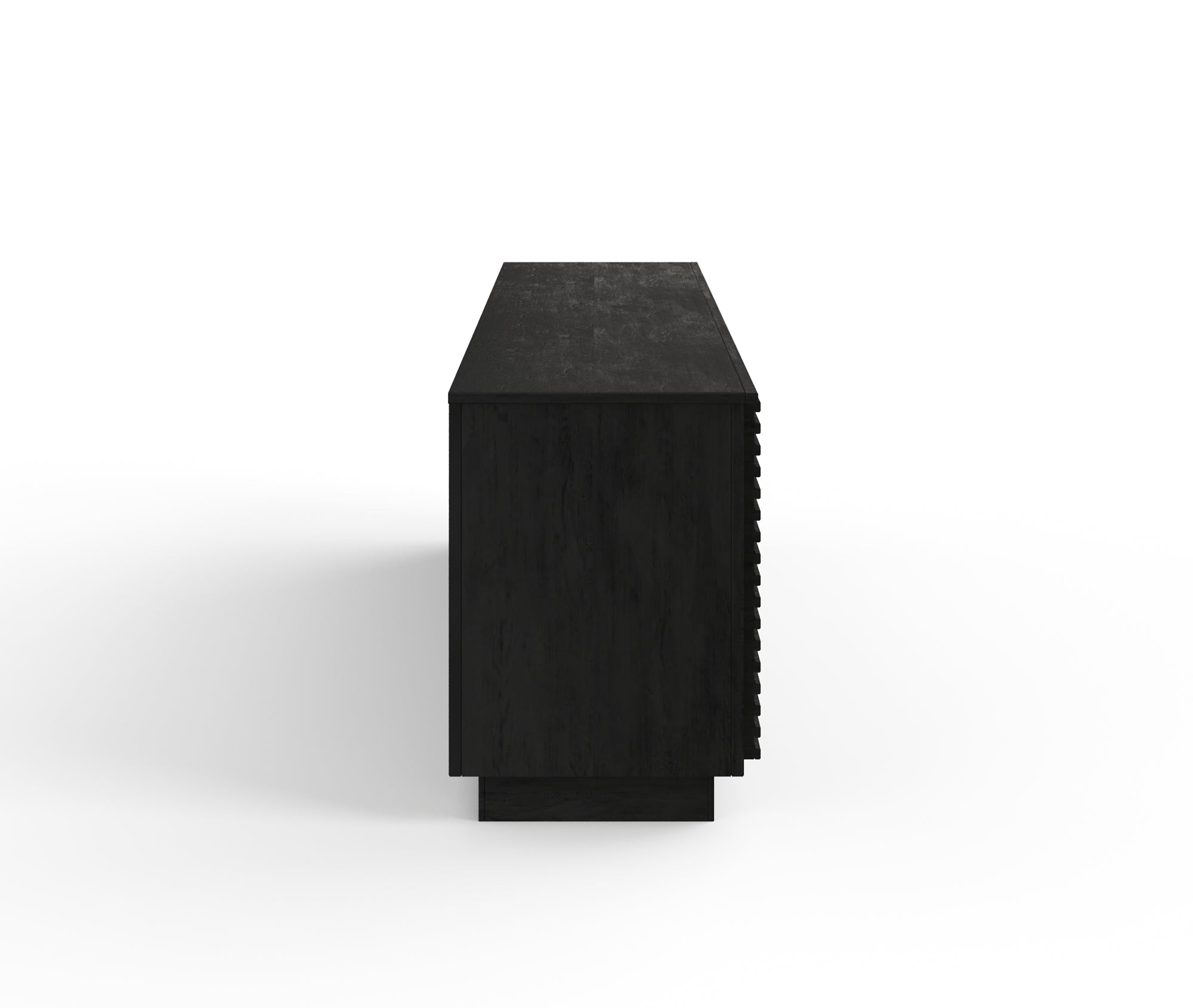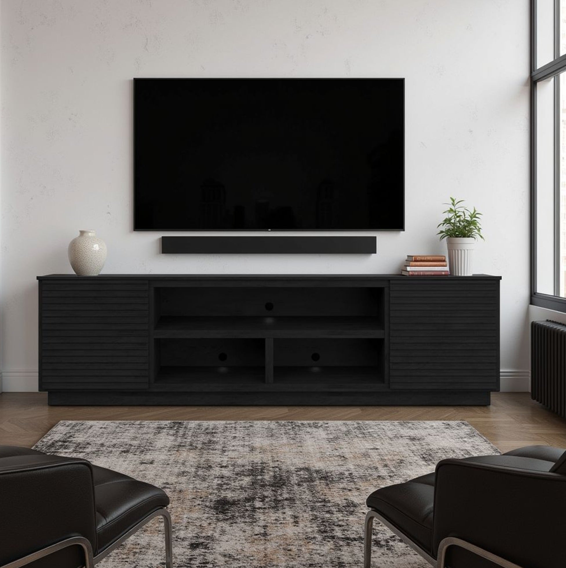 Elevate your living room with a sleek, fully assembled TV console that blends modern minimalism with practical storage. Crafted from solid poplar and okume veneers in a rich black finish, this low-profile stand supports large-screen entertainment while keeping media components organized and hidden for a clean, polished look.
