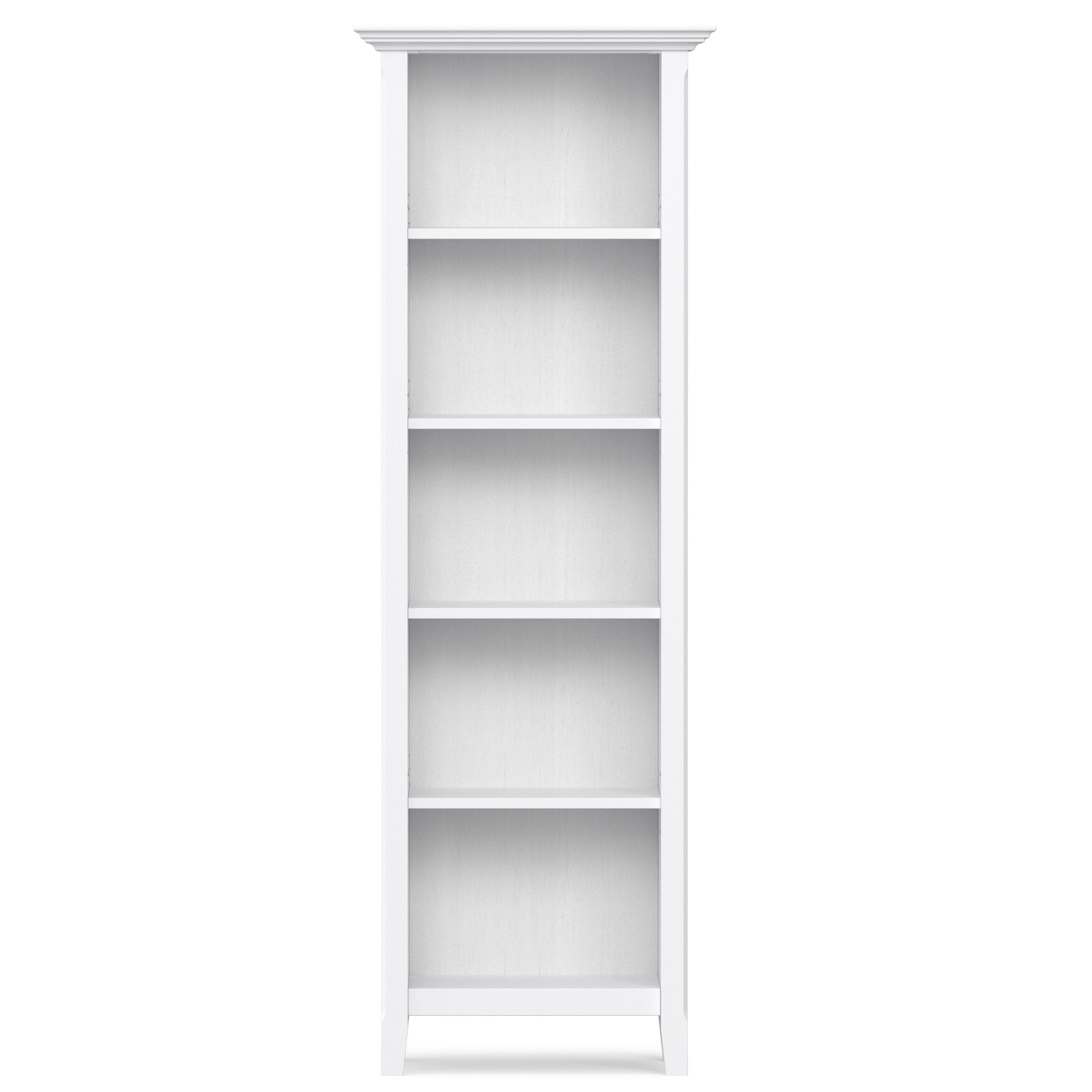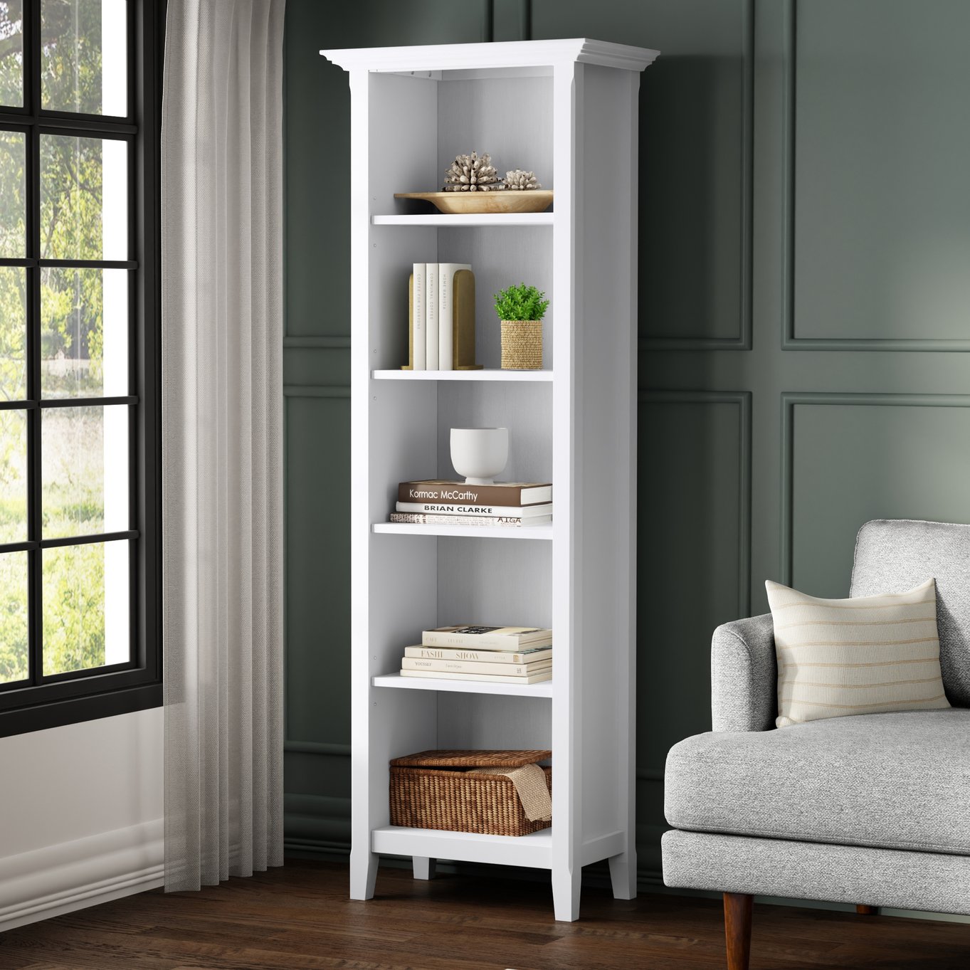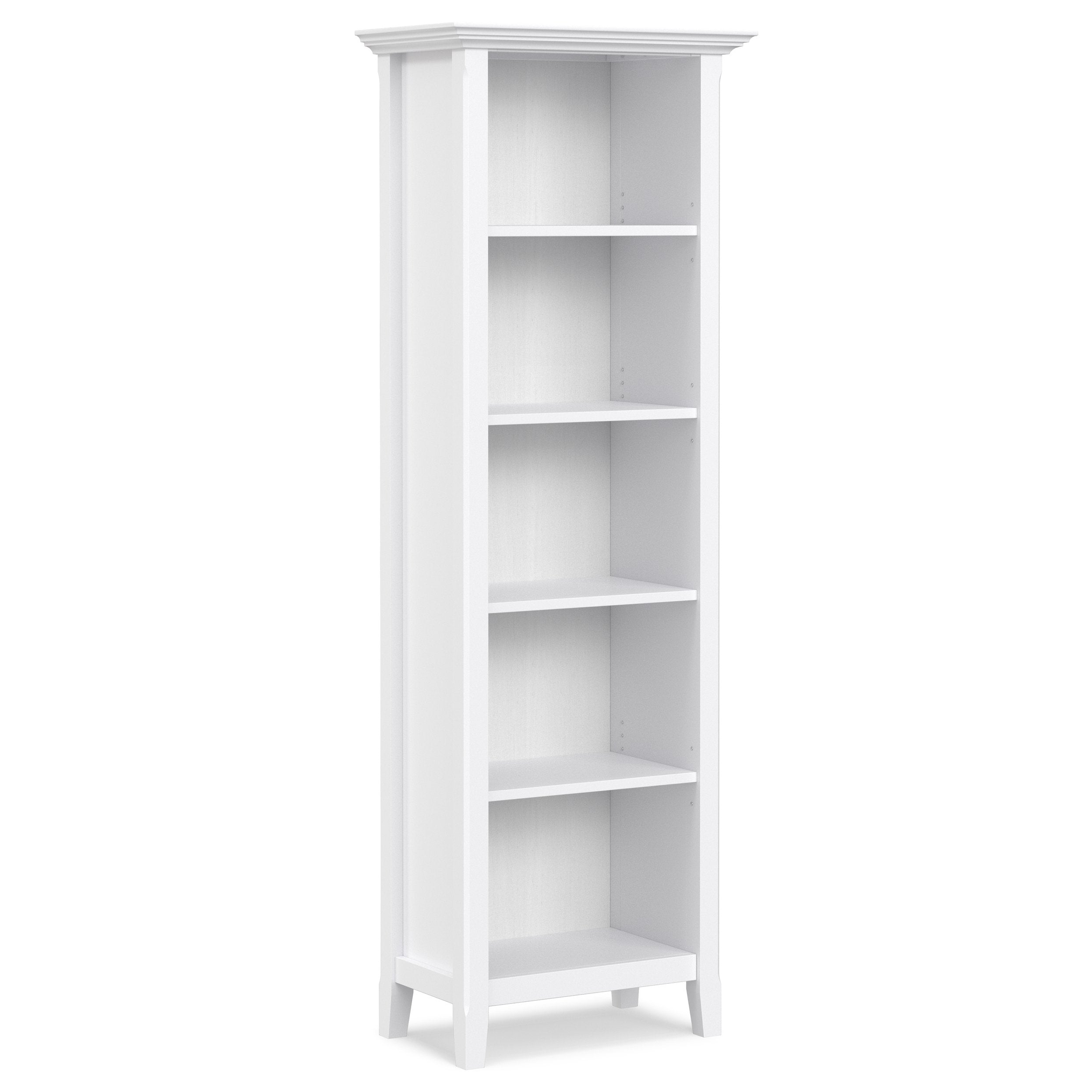 Bring refined, space-saving storage to any room with this tall, slim five-shelf bookcase. Crafted from sustainable solid pine and finished in a low-VOC white-brown paint that highlights natural grain and knots, this unit combines classic crown-molding details with modern functionality—ideal for displaying books, collectibles, or media in living rooms, home offices, or bedrooms.