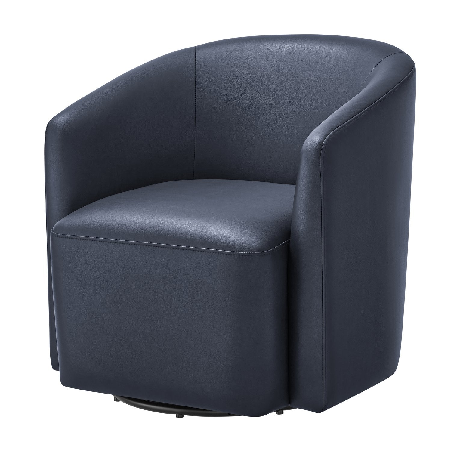 Sink into modern comfort with the Ardena Midnight Blue swivel barrel chair—an elegant, space-smart accent that blends contemporary style with everyday functionality. Upholstered in rich midnight blue faux leather, this chair offers supportive pocket-coil cushioning and a smooth 360° swivel for relaxed conversation, reading, or TV time. Durable, easy-to-clean materials and a compact footprint make it ideal for apartments, living rooms, home offices, or cozy corners.