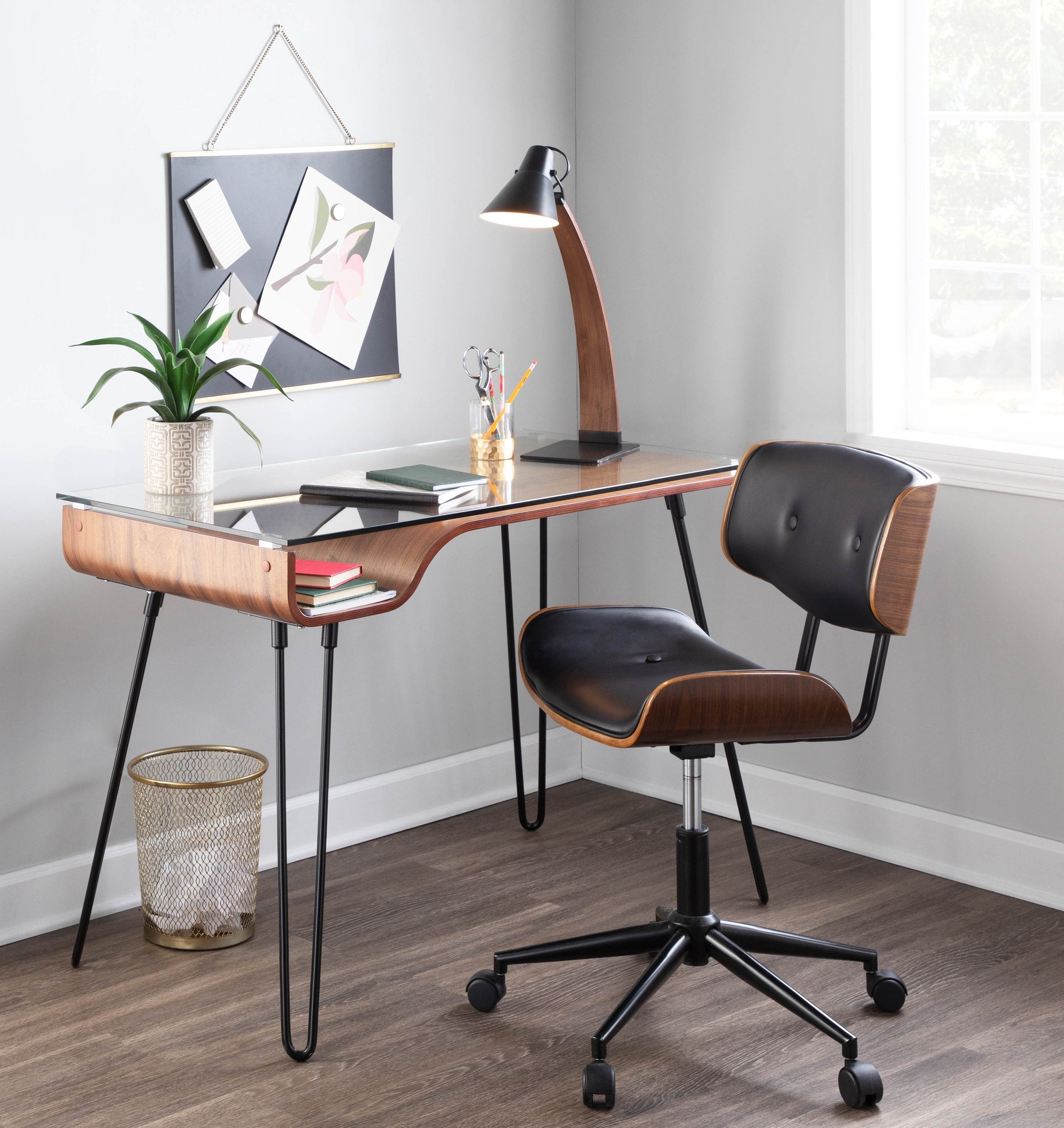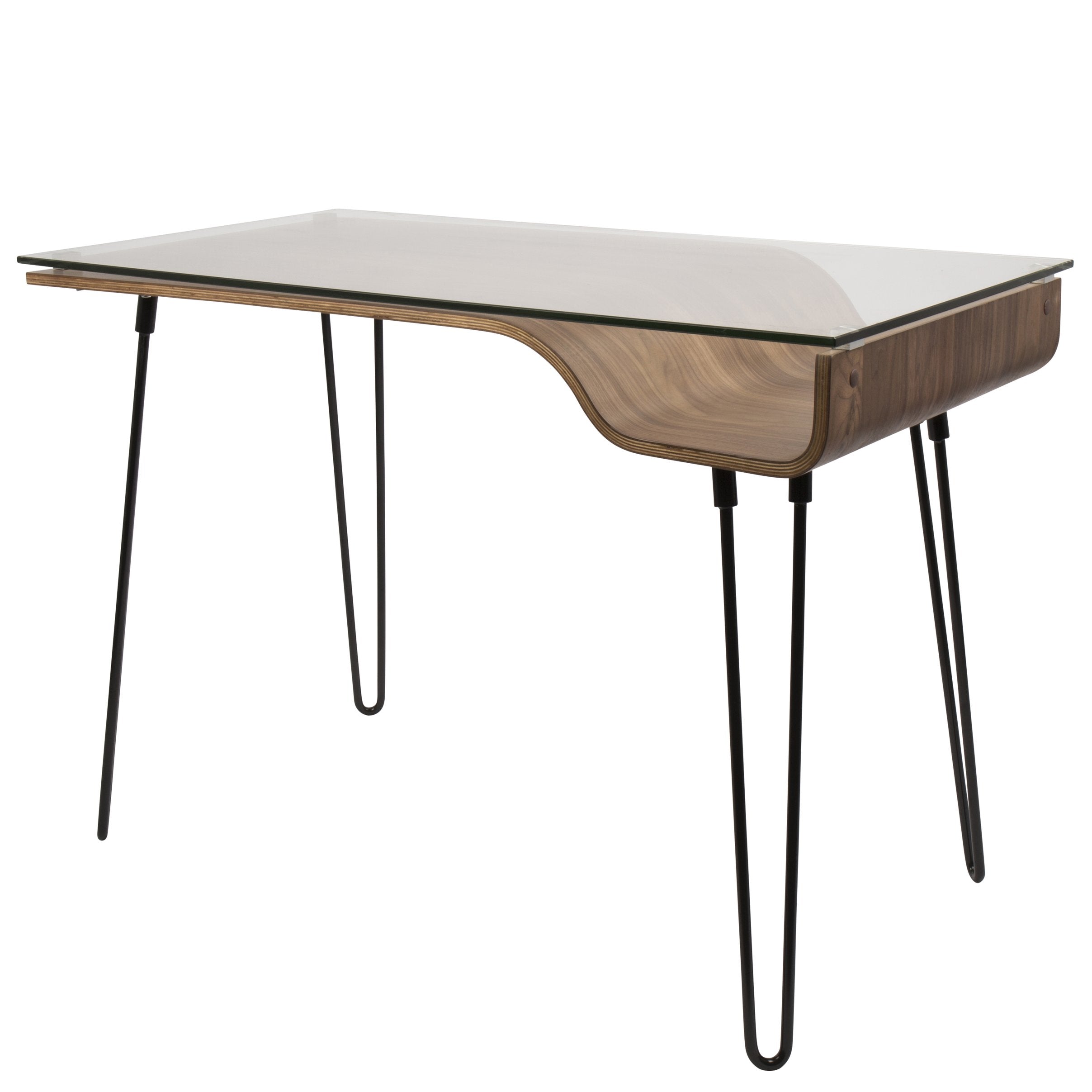 This mid-century modern desk blends warm walnut wood, sleek clear tempered glass, and industrial black metal for a stylish, functional workspace that suits contemporary and retro interiors. Its slim profile and open design make it ideal for home offices, small apartments, or as an accent piece in living areas—offering durable materials and thoughtful storage without overwhelming the space.