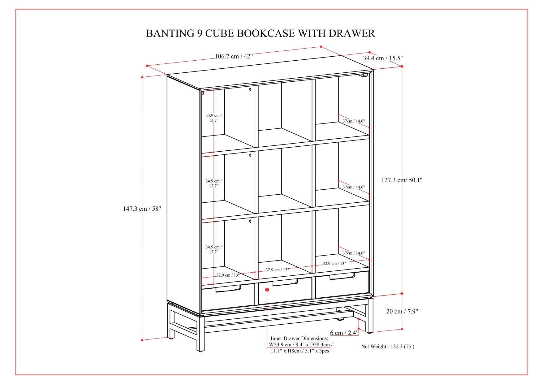Bring organized style to any room with this Banting 9-cube bookcase with drawers — a handcrafted, modern-industrial storage solution combining solid wood warmth with a sturdy metal frame. Its nine display compartments and three convenient drawers provide flexible display and hidden storage for books, decor, media, and everyday essentials, while the walnut-brown finish and graphite-grey metal legs deliver a contemporary yet timeless look.