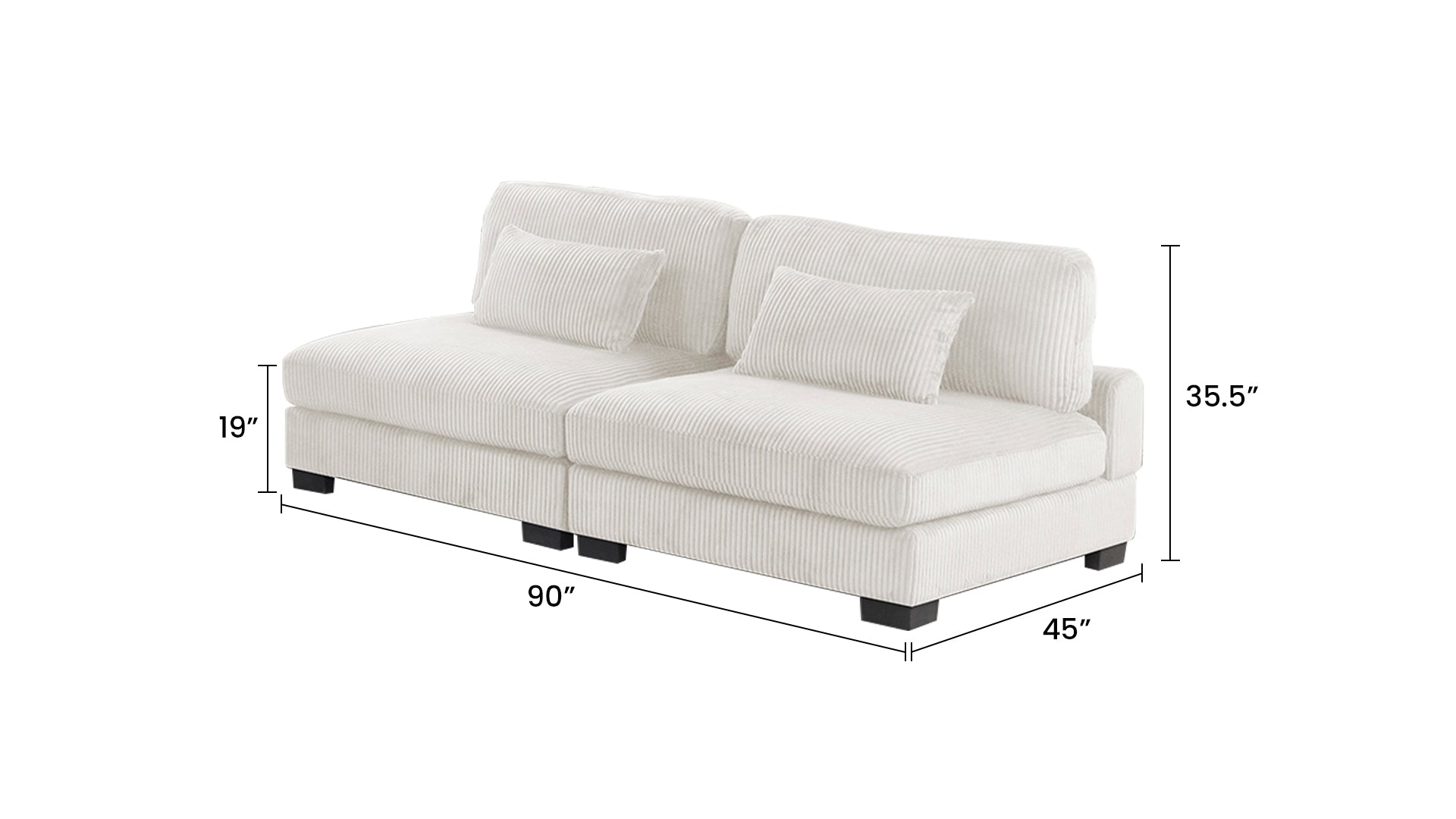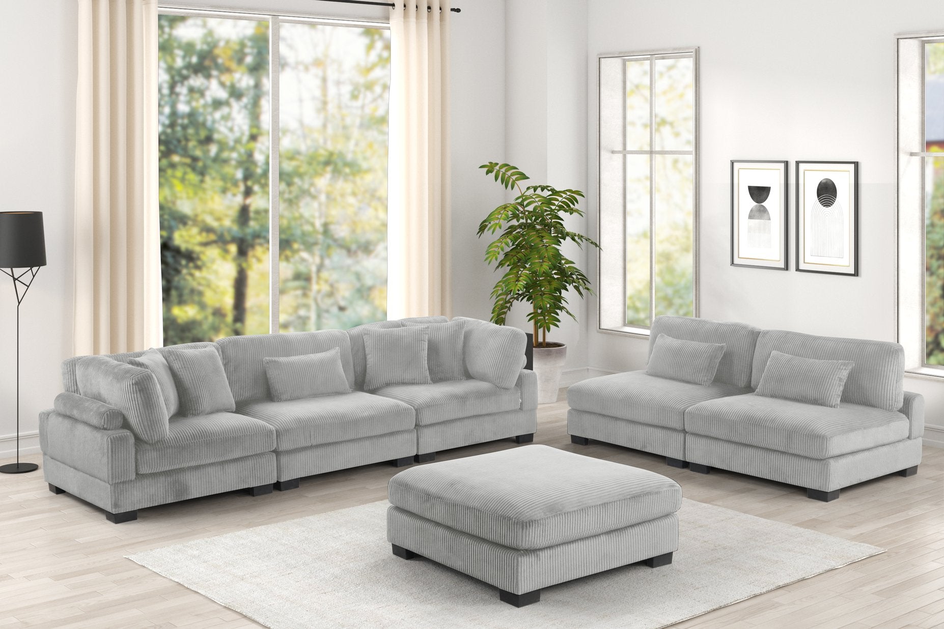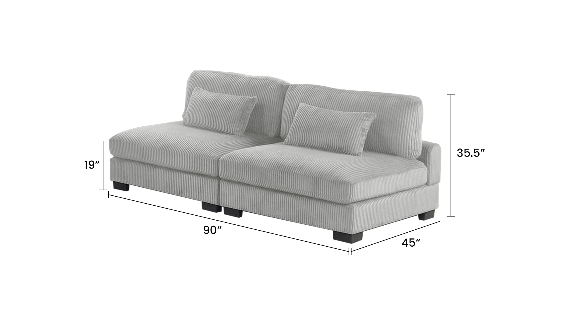 Discover comfort and versatility with this Bentley modular sectional — a contemporary take on the classic sofa-and-loveseat arrangement. Upholstered in soft gray corduroy and supported by a durable wood frame, this configuration adapts to your living space while delivering a cohesive, modern look and plush seating for family and guests. The included ottoman replaces a traditional coffee table for relaxed lounging and easy reconfiguration.