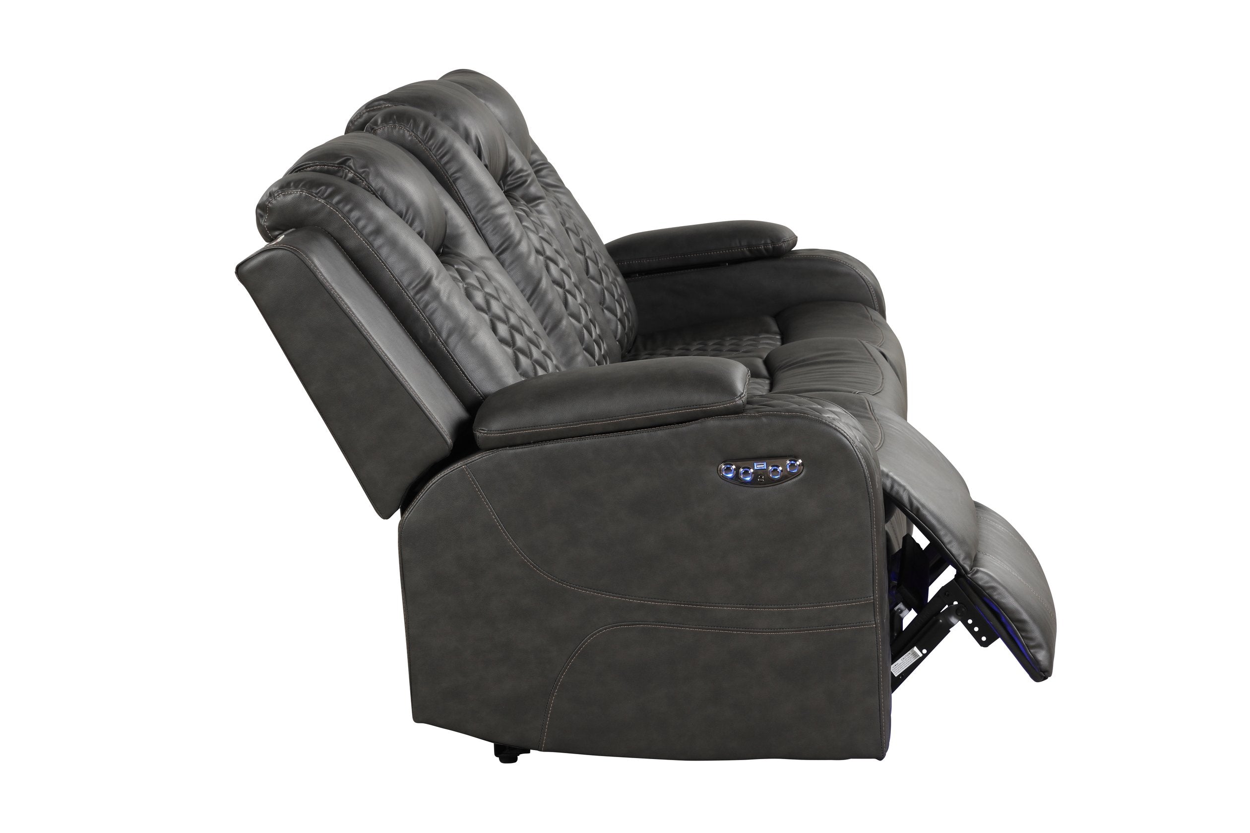 Transform your living room into a modern, tech-forward retreat with this 2-piece power reclining set. Upholstered in pebble-effect gray faux leather inspired by sports car interiors, the set pairs sleek styling with practical features—one-touch power recline, adjustable headrests, integrated lighting, and built-in media conveniences—so you can relax, entertain, and recharge in comfort.