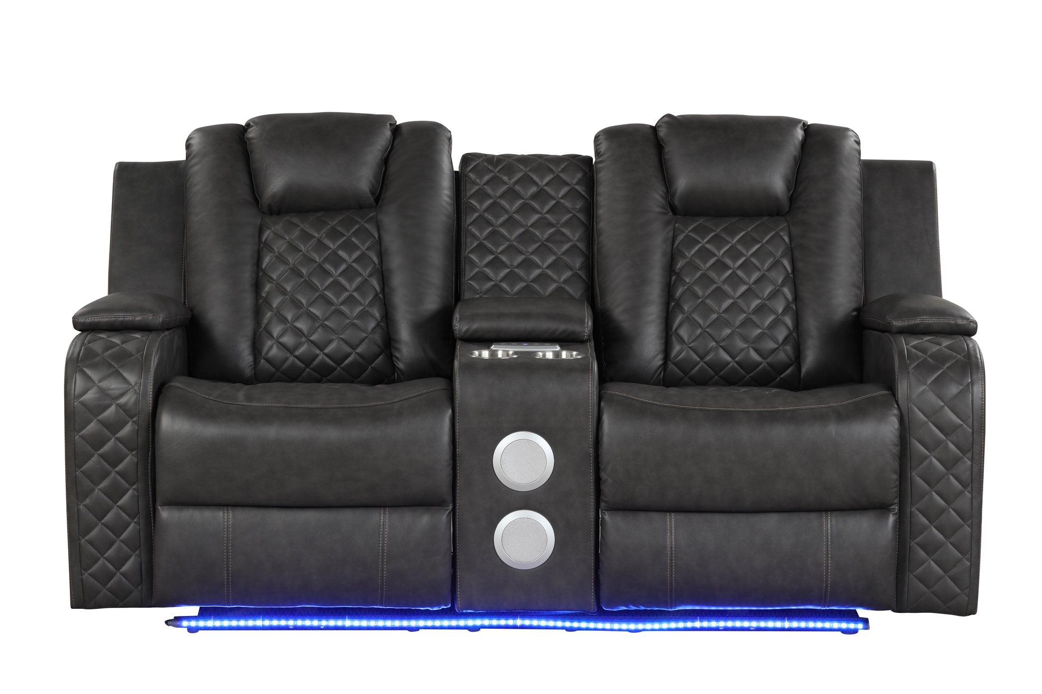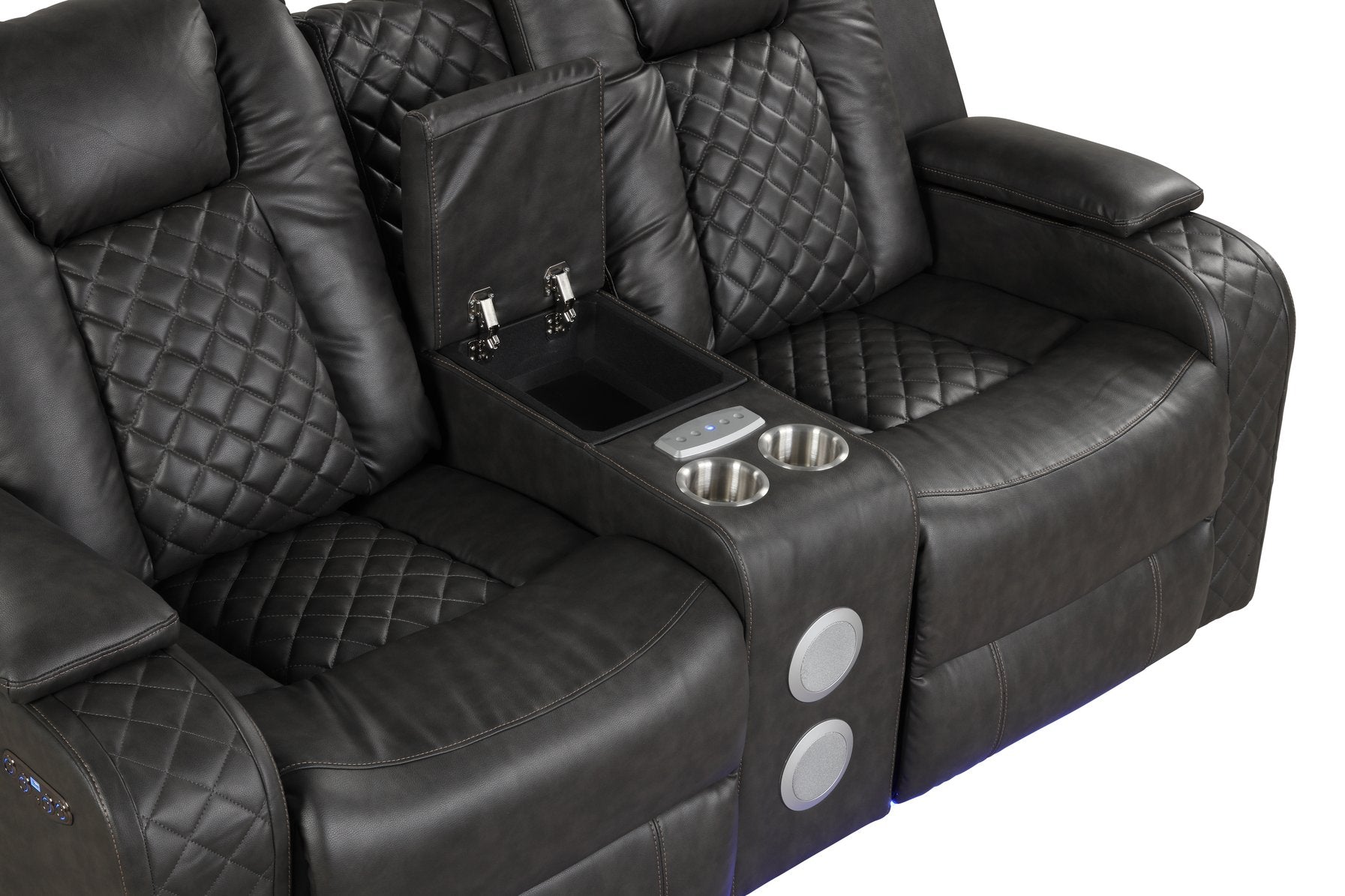 - Media & charging: Built-in USB ports and charging options (loveseat includes wireless charging station); loveseat also includes Bluetooth speakers and an inbuilt console