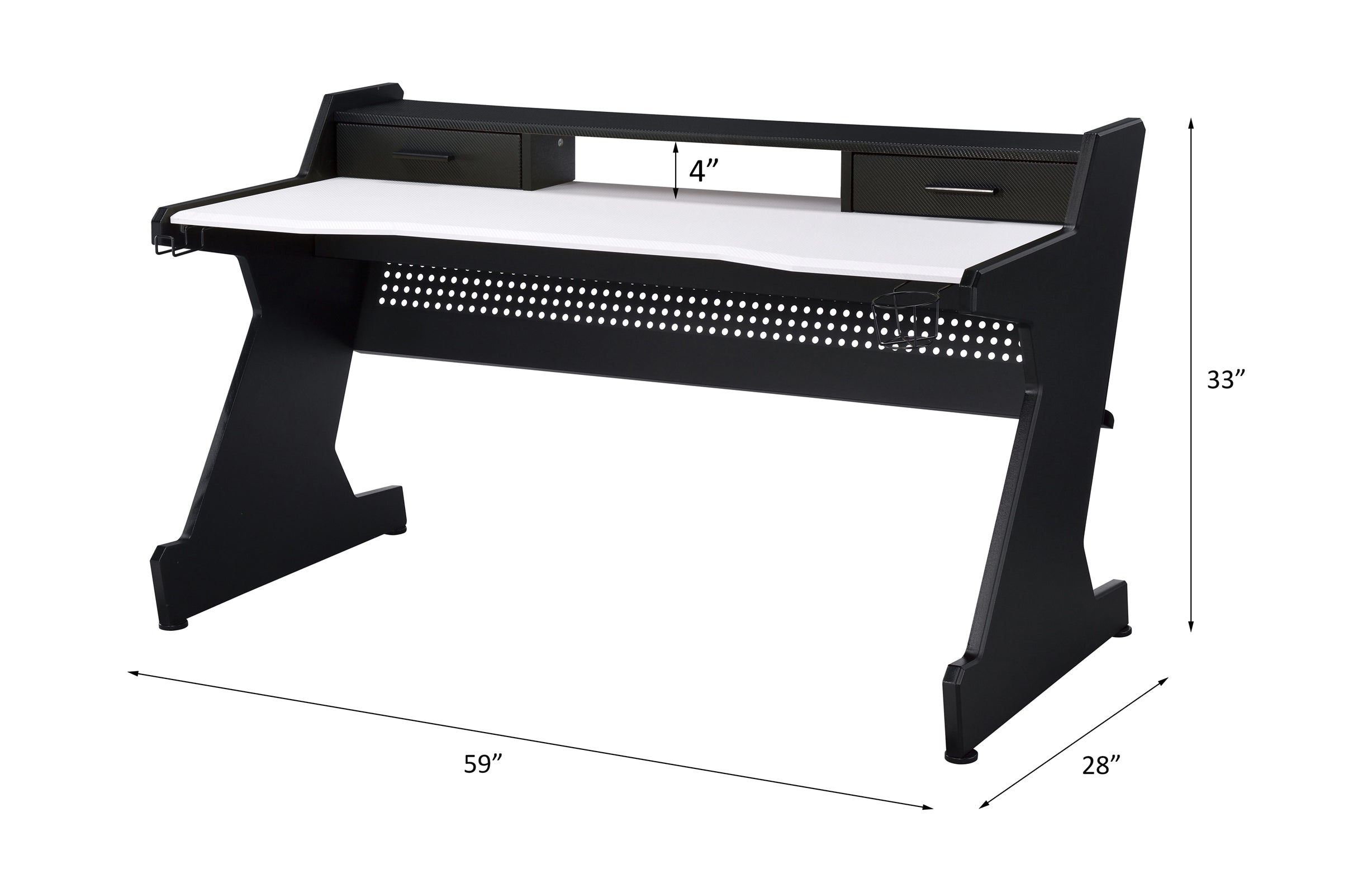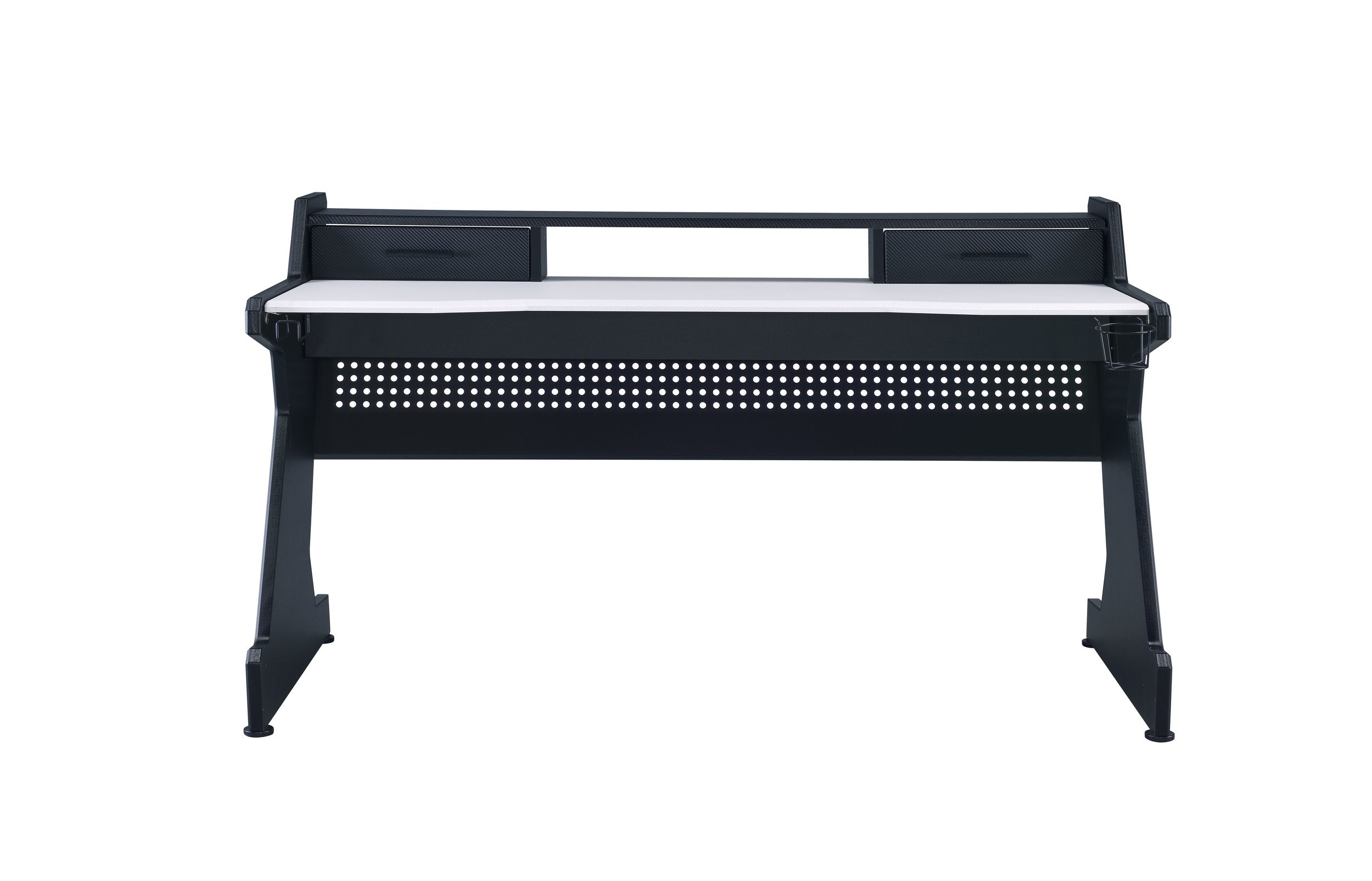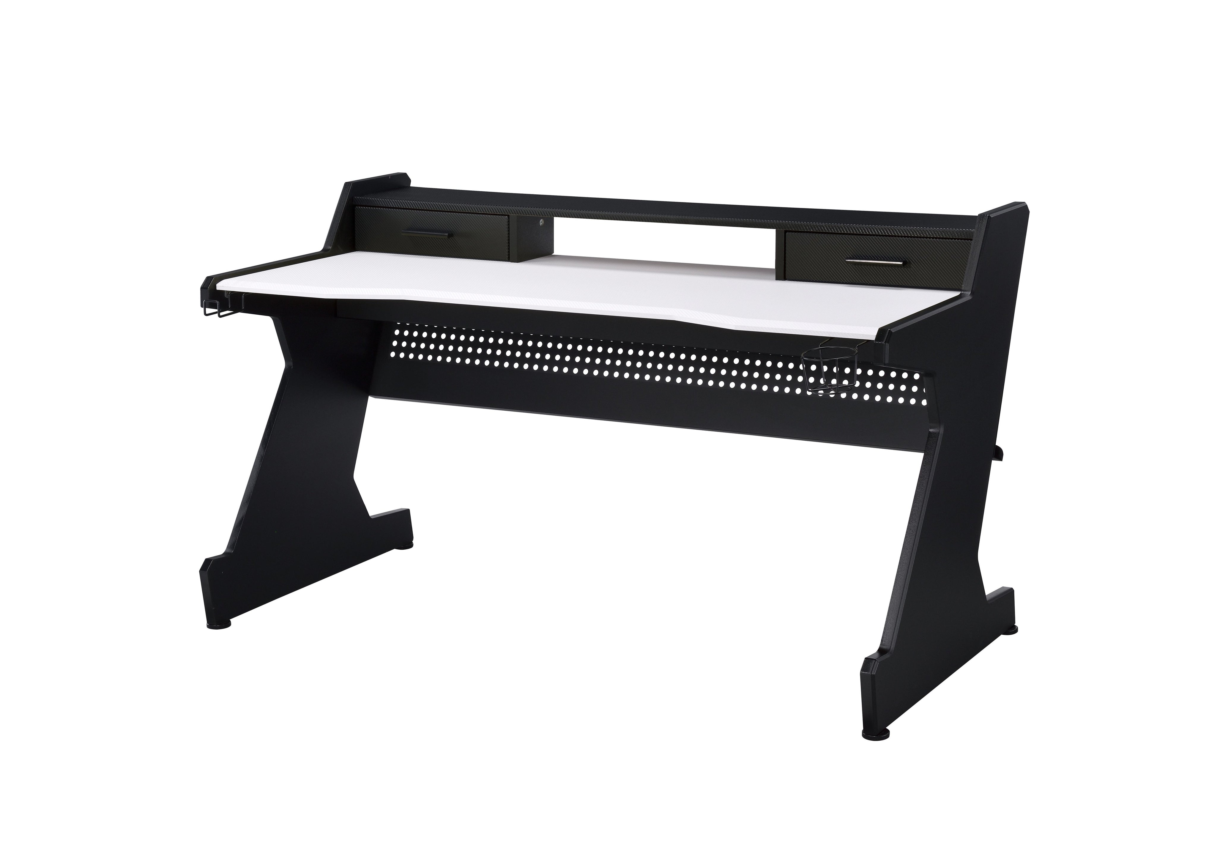 Upgrade your gaming setup with a sleek, functional desk designed for comfort, organization, and lasting use. This rectangular gaming desk combines clean black-and-white styling with practical storage—two drawers plus an open compartment—so your controllers, headsets, cables, and accessories stay neatly organized and within easy reach. Built from durable materials and sized to fit a wide range of gaming rigs, it works well in game rooms, home offices, dorms, or covered outdoor spaces.