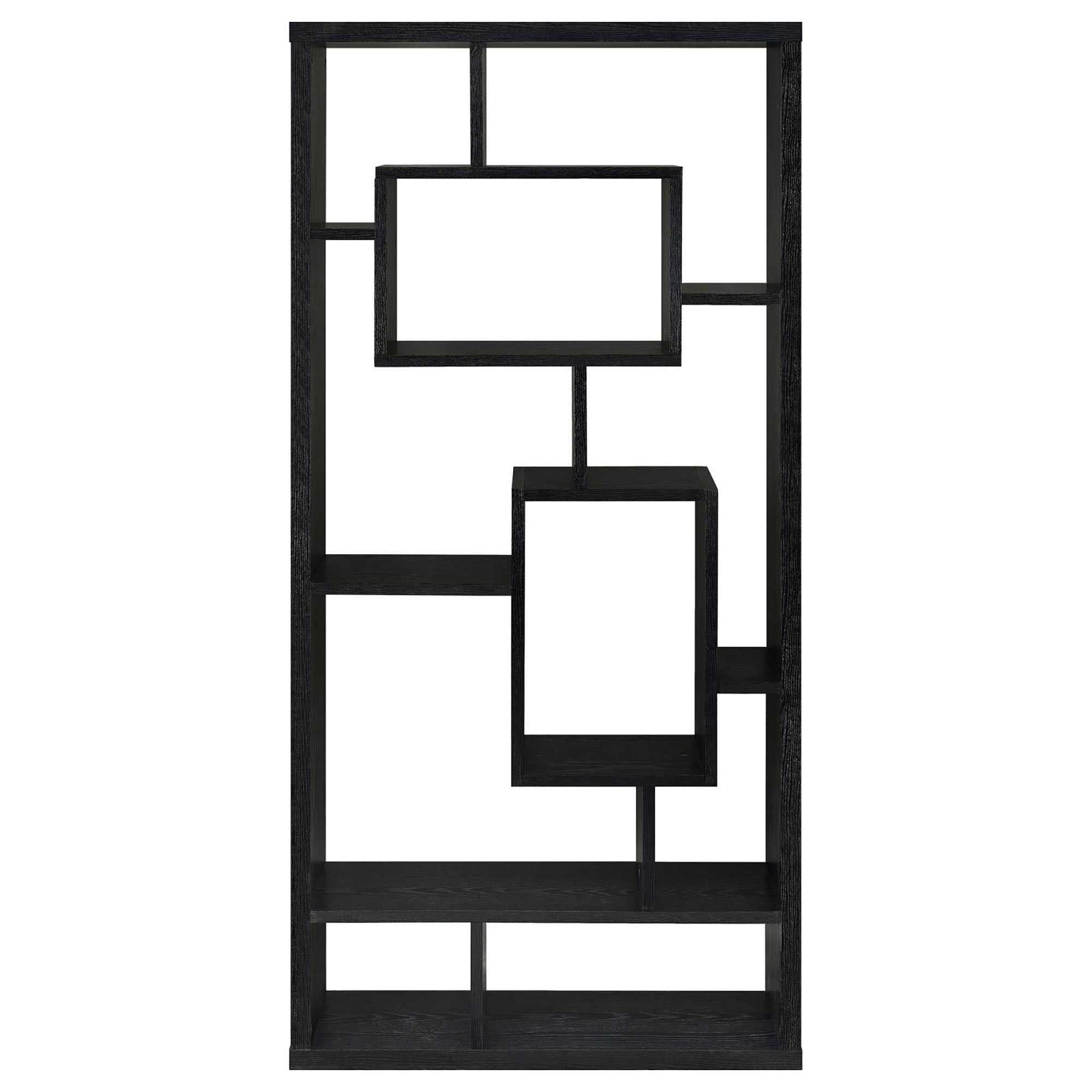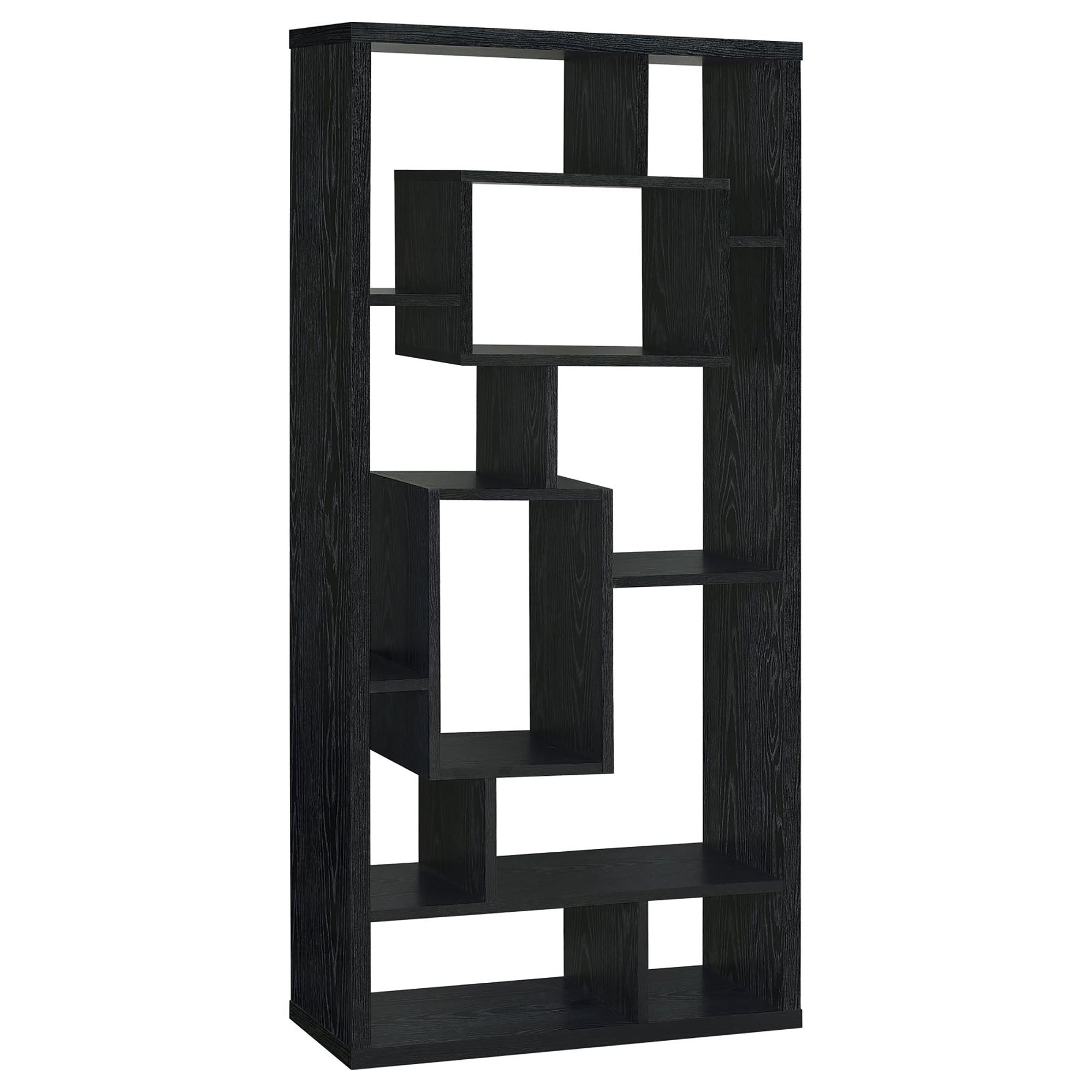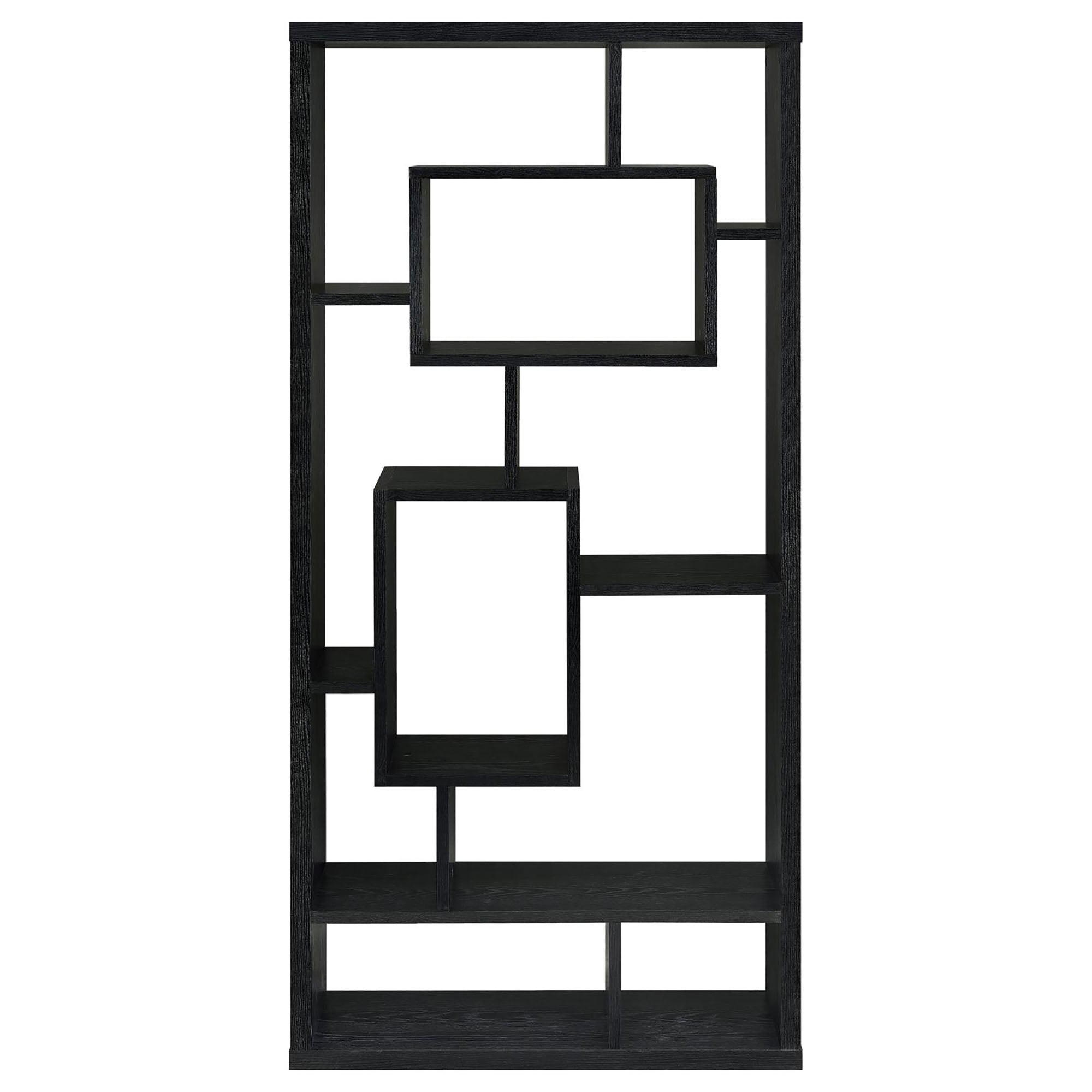 Give your living room, home office, or hallway a contemporary focal point with this Black Oak 10-shelf open-back bookcase. Its interlocking cubby design creates a modern, geometric display that highlights books, collectibles, framed photos and decorative objects while maintaining an airy, open feel. The clean black oak finish pairs easily with a variety of decor styles and the sturdy melamine-faced construction provides long-lasting everyday use.