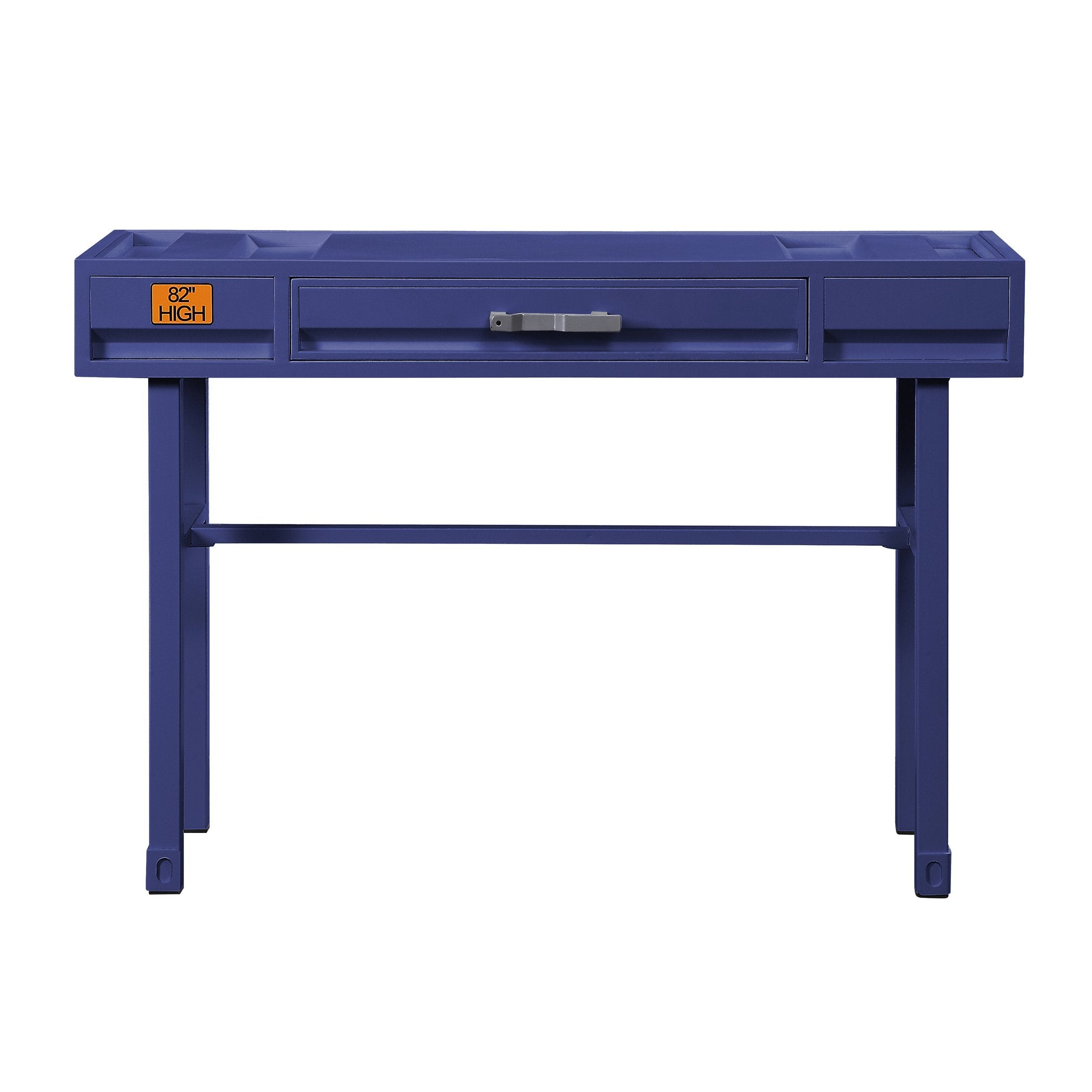 Bring bold industrial style to your home office with this blue writing desk that blends cargo-container inspiration with practical features for everyday work. Clean lines, a textured recessed panel, and a distinctive blue finish create a focal point while the single drawer and sturdy construction keep your essentials organized and within reach.