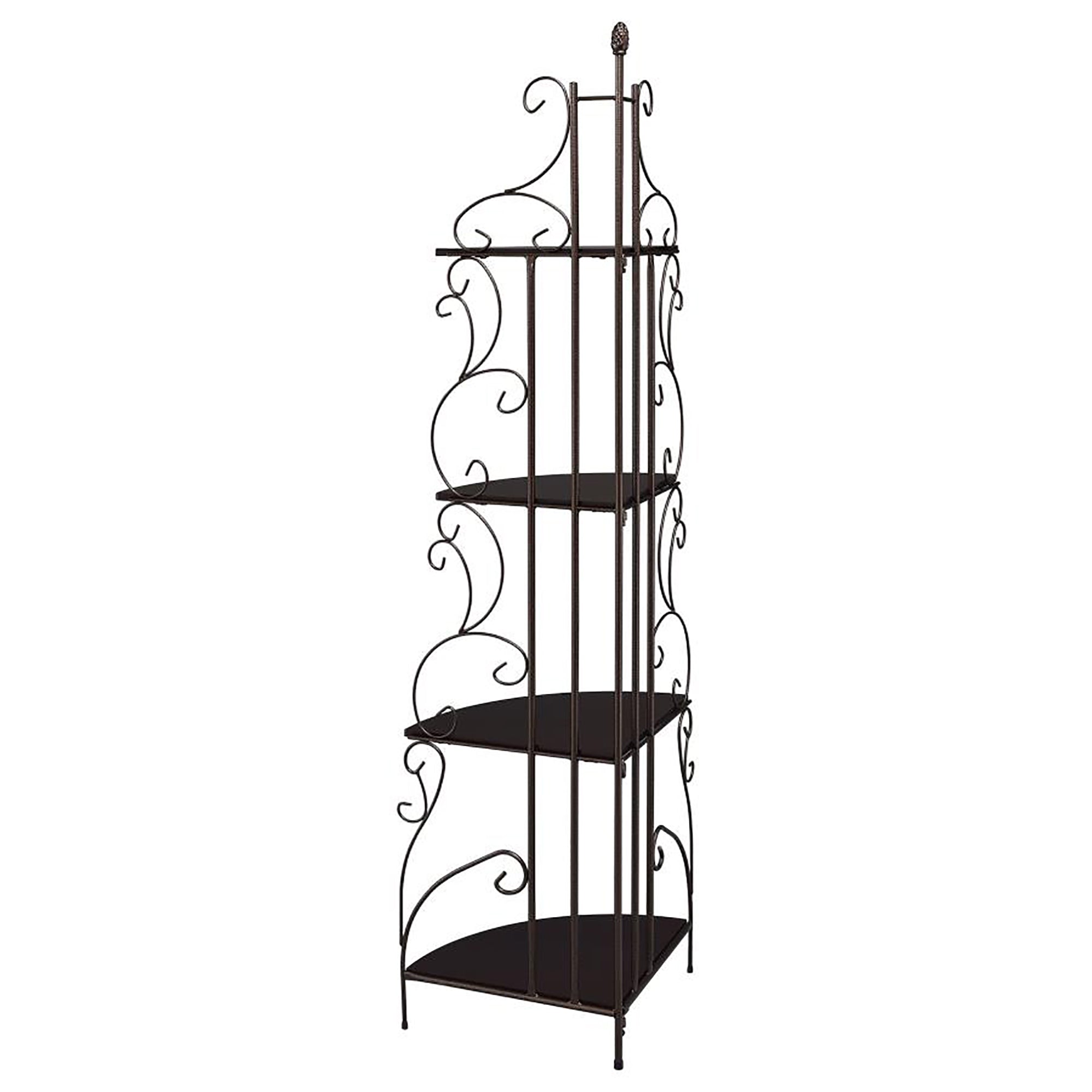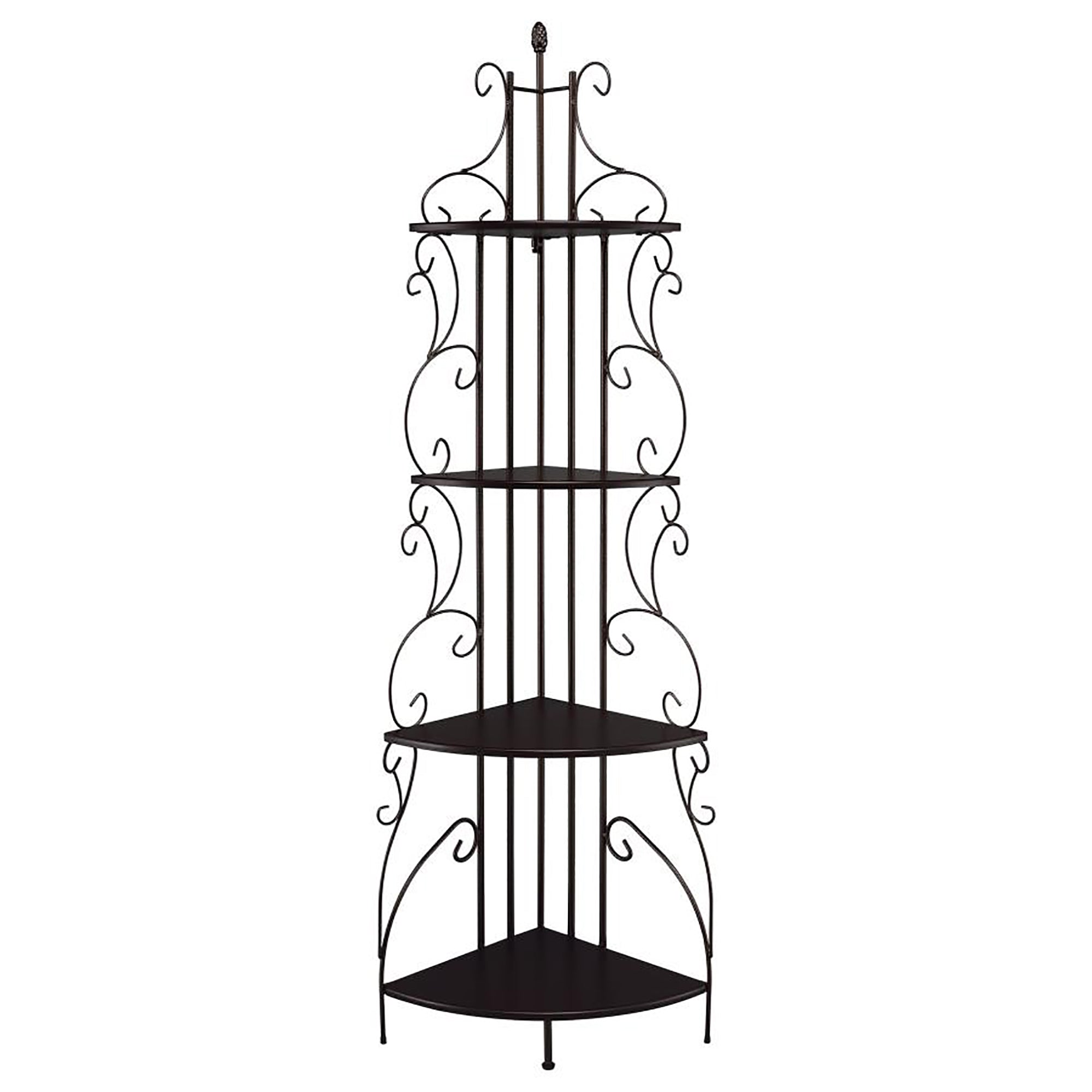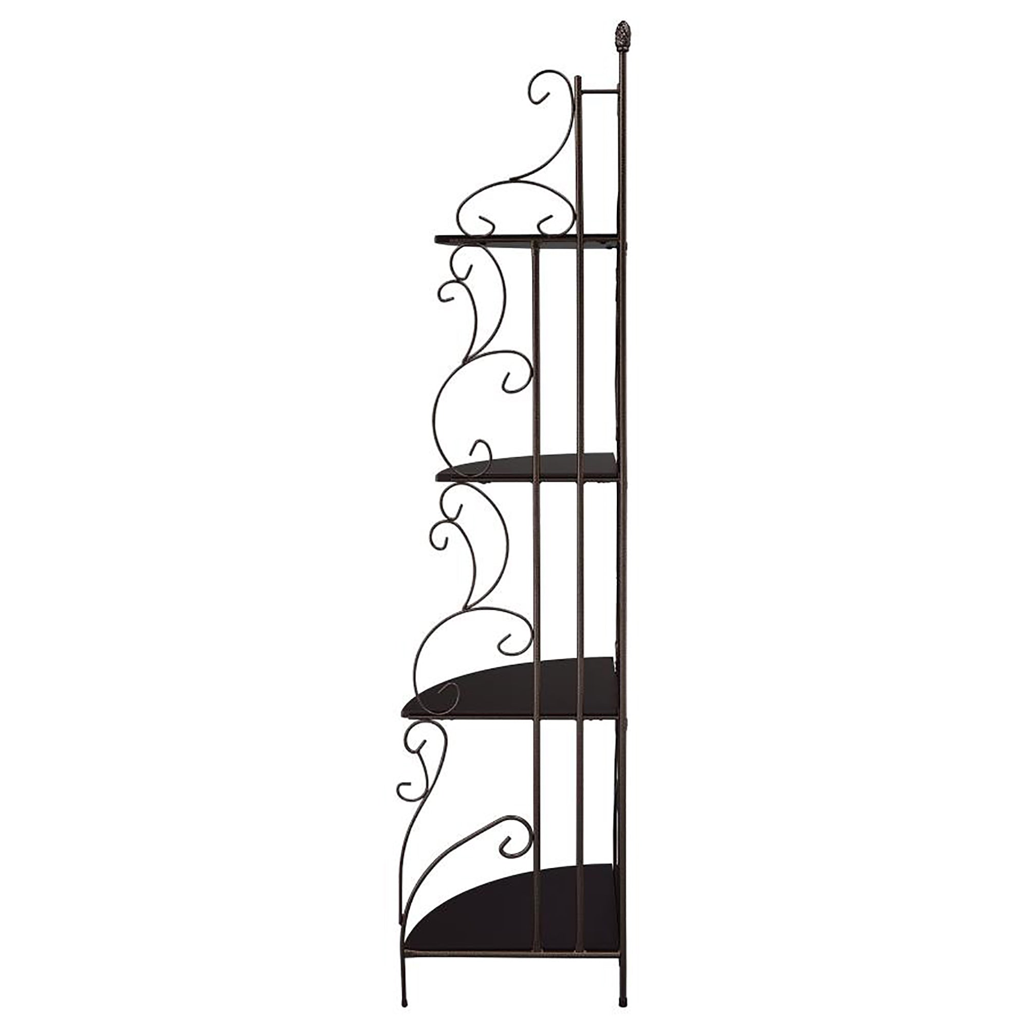 Add classic charm and smart storage to any room with this four-tier corner bookcase. Its cappuccino and copper finish, handcrafted scrollwork, and compact triangular profile make it an attractive display piece that tucks neatly into corners—ideal for an entryway, living room, kitchen, or hallway where style and space-saving meet.