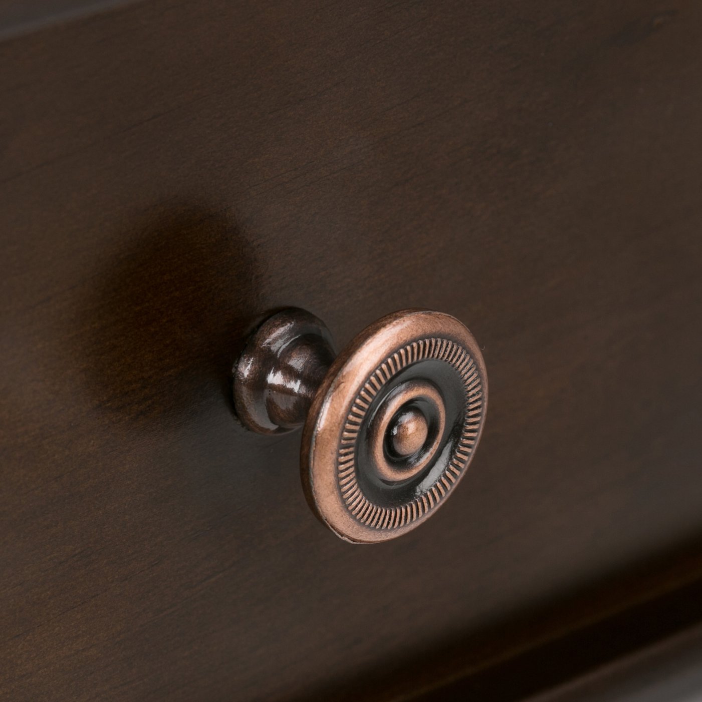 - Storage & Function: Flip-down drawer front conceals an internal keyboard tray — bronze rounded knobs add a classic touch.