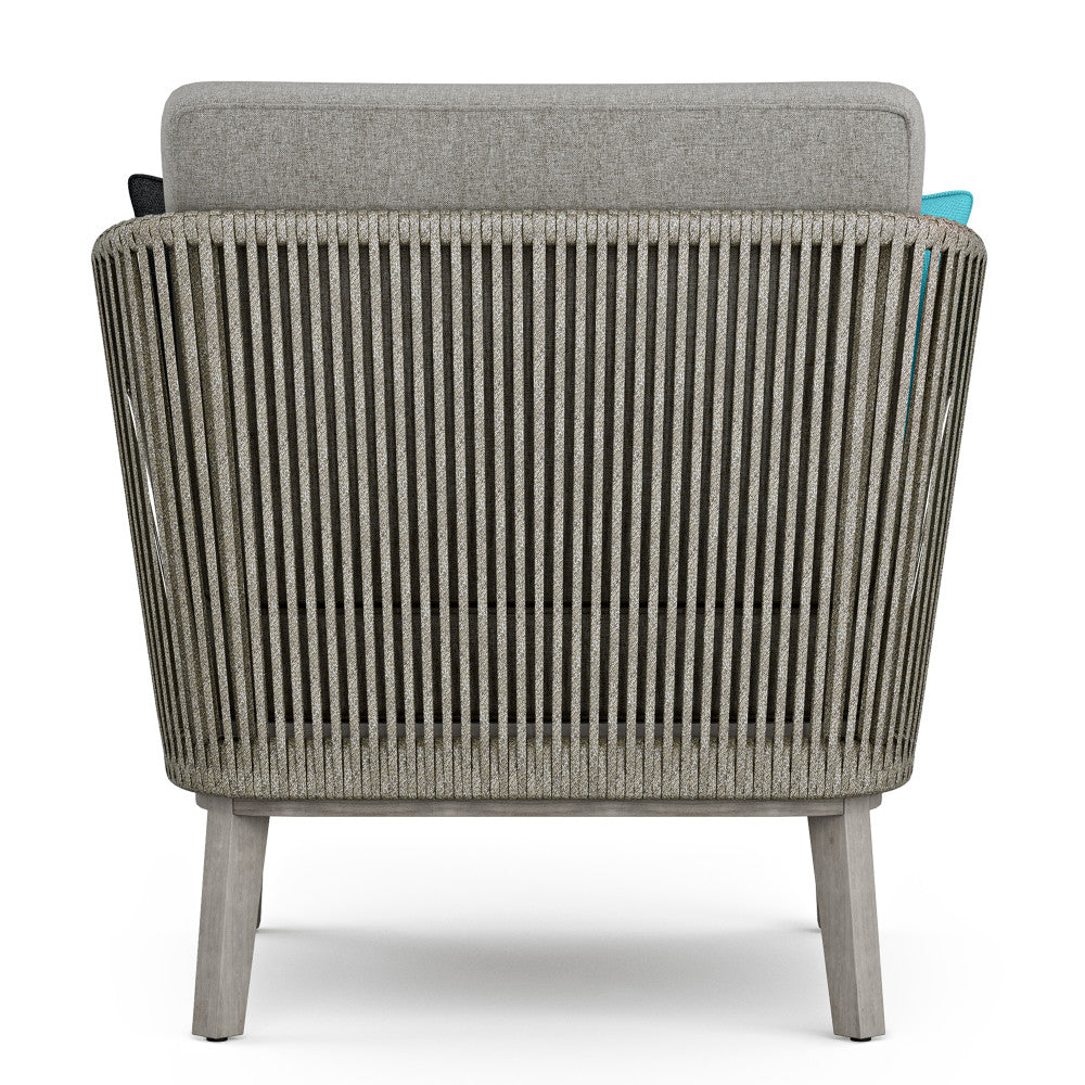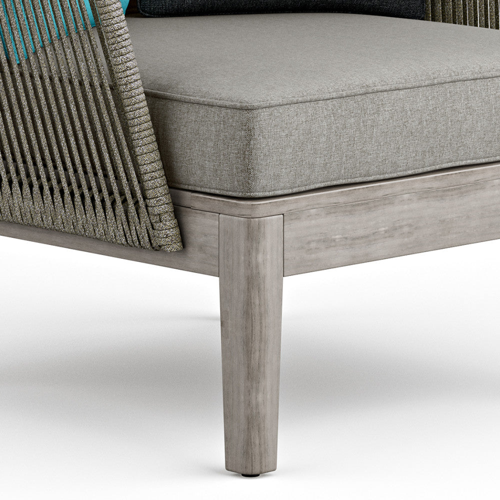 - Key materials: Powder-coated aluminum frame, solid acacia wood base and legs with a distressed weathered grey finish, wrapped woven rope detailing, polyester fabric, and high-density foam cushions.