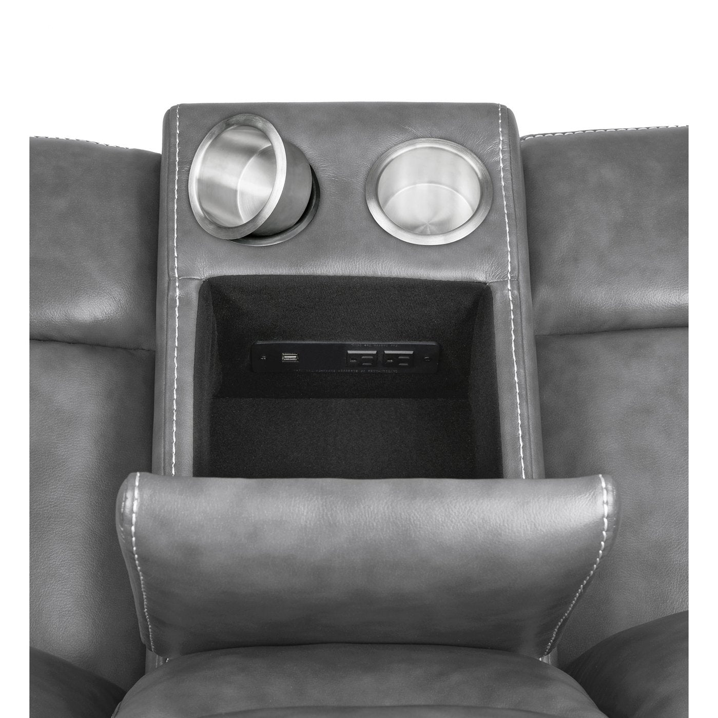 - Loveseat console features soft-closing lift top storage, power outlets, removable stainless steel cup holders, and a convenient storage drawer