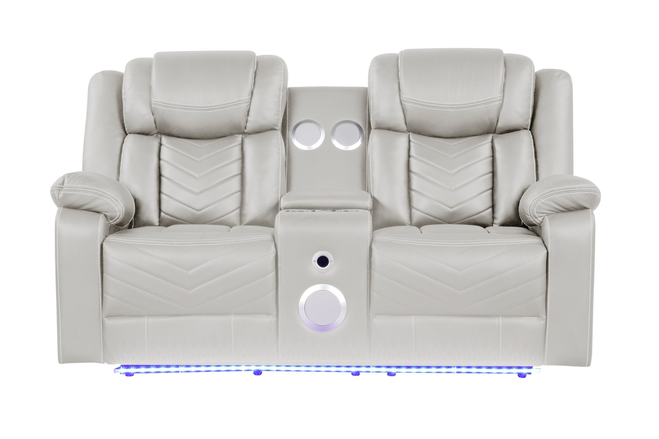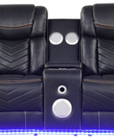 Sink into modern comfort and entertainment with this contemporary power reclining loveseat. Upholstered in durable premium faux leather with a sleek contrasting accent, it’s designed for movie nights, gaming sessions, or everyday relaxation—complete with built-in audio, convenient storage, and ambient LED lighting for a cinematic atmosphere.