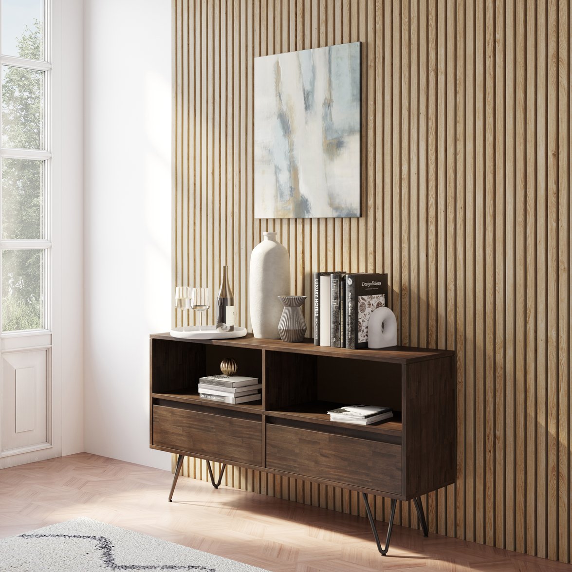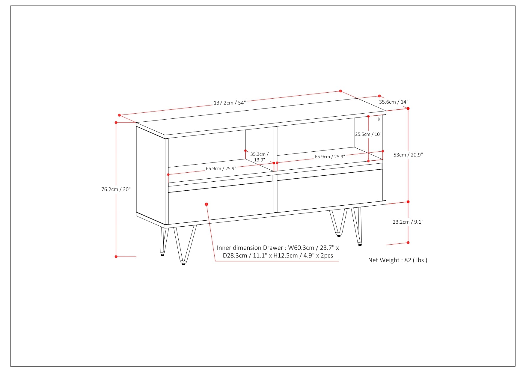 - Smart storage layout: Two large open compartments ideal for books, media, or display items, plus two notched-handle drawers for concealed storage.