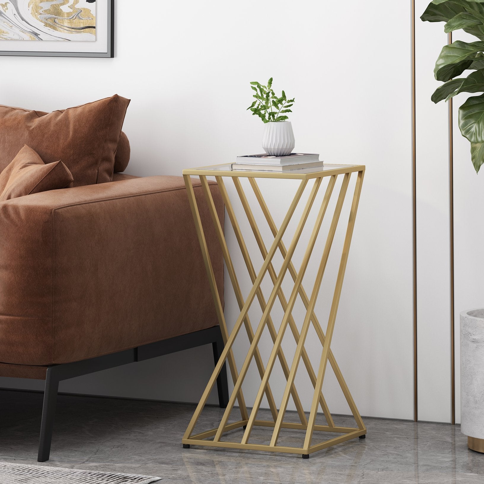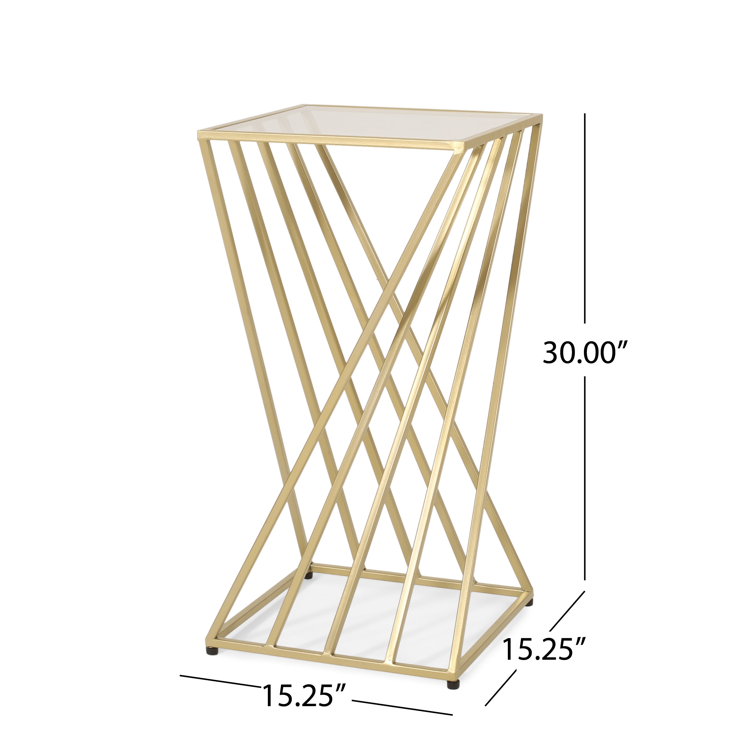 Elevate your living space with this sculptural end table that combines modern glam and practical function. Its twisted hourglass iron frame and champagne metallic finish create a striking focal point, while the tempered glass top provides a sleek, durable surface perfect for a lamp, decorative objects, or a tray of refreshments. Ideal for small spaces, entryways, or beside a sofa or bed, this piece adds both lightness and luxury to contemporary or transitional interiors.