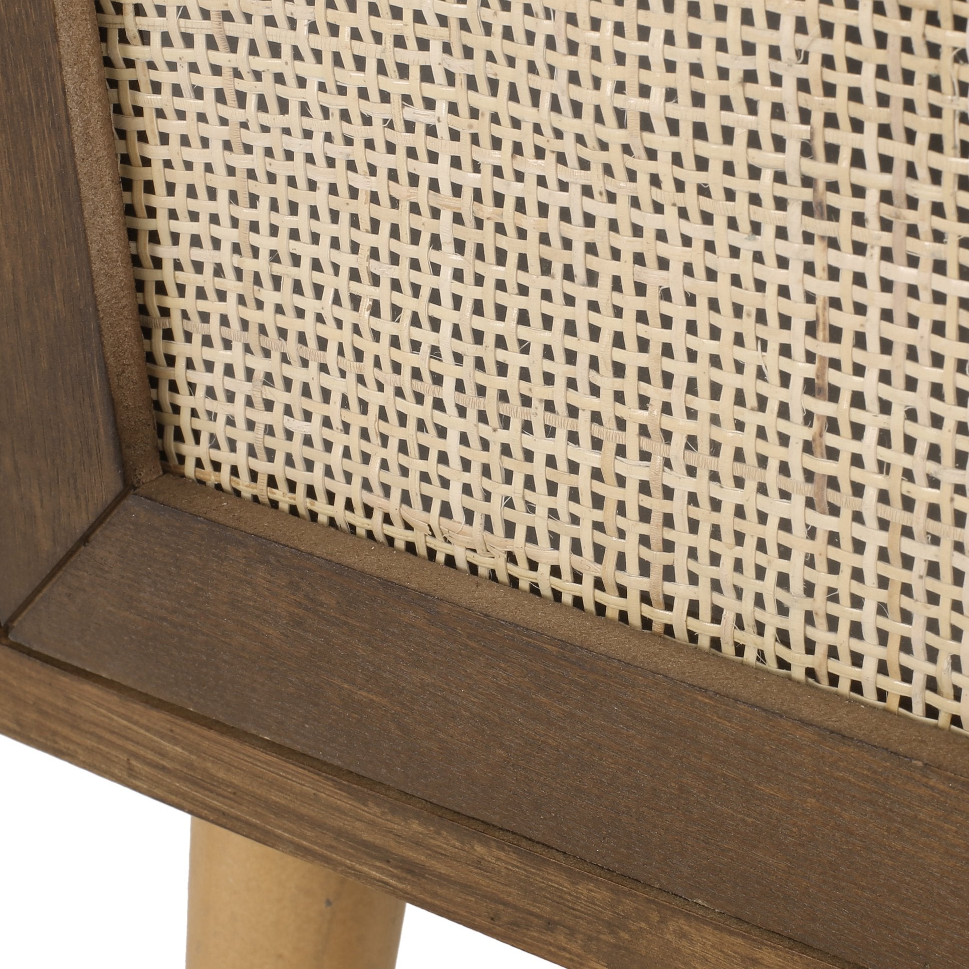 - Design details: Contemporary silhouette with clean lines, rattan accents, and angled splayed legs for mid-century-inspired appeal.