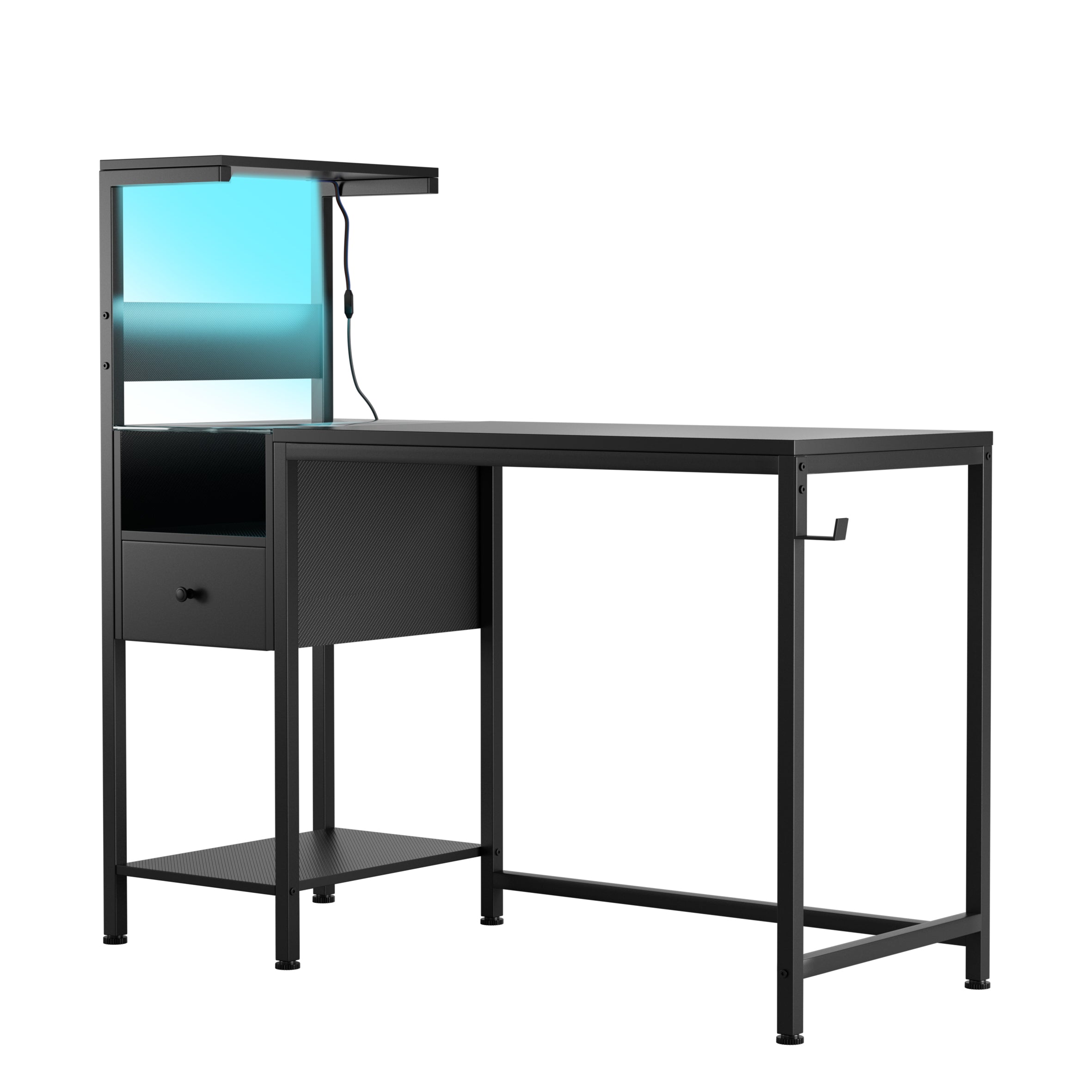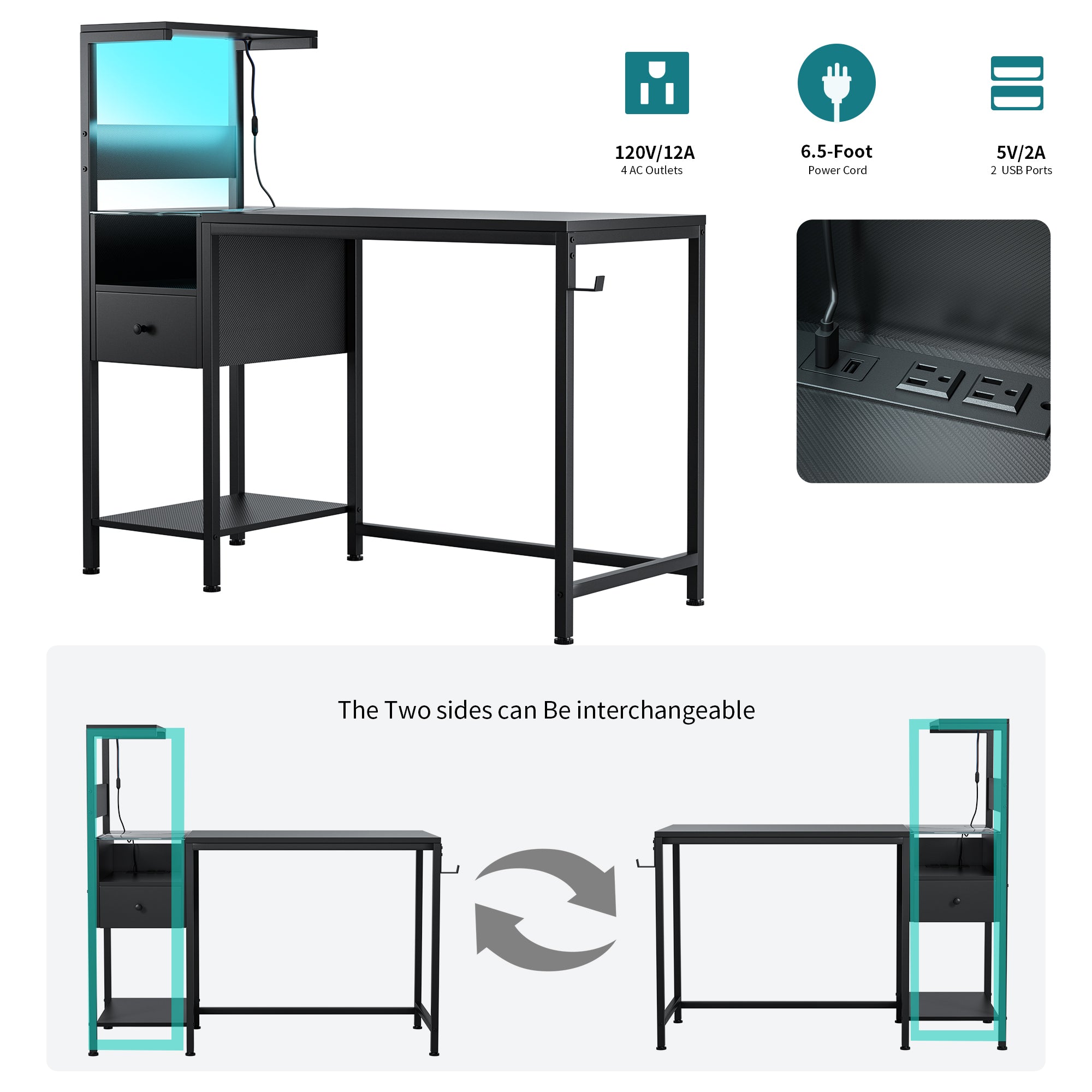 Bring style, function, and smart convenience to your home office or gaming setup with this versatile computer desk. Designed for small spaces, it combines reversible storage, integrated charging, and ambient RGB lighting to create an organized, comfortable workspace that adapts to work, study, and play.