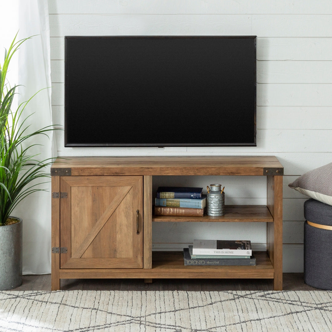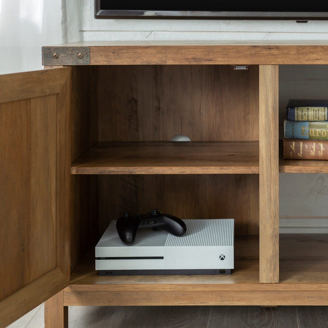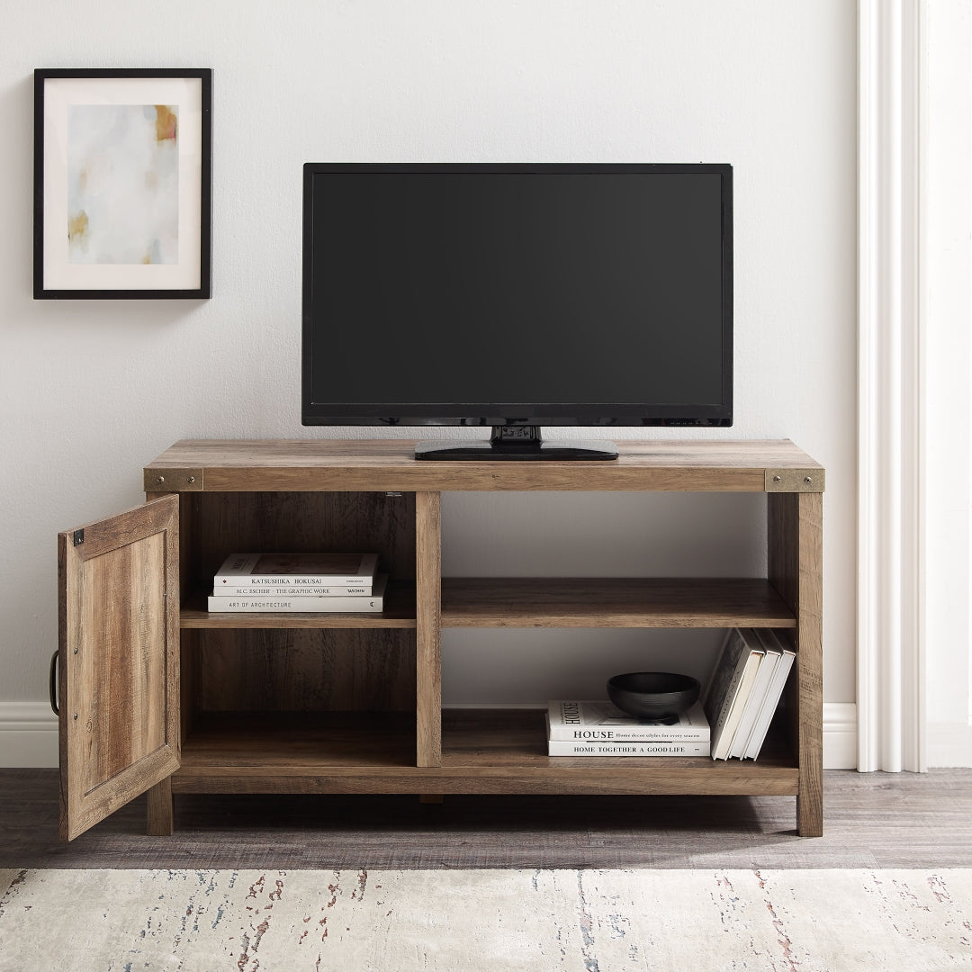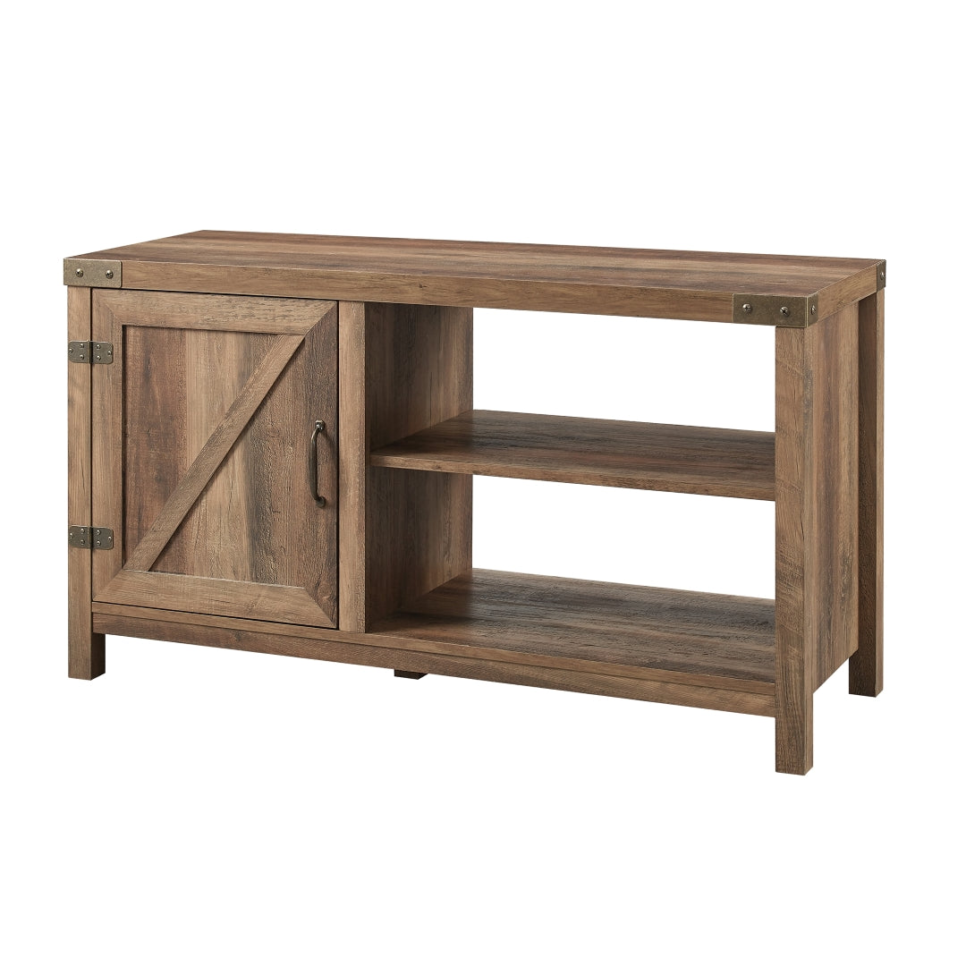 Our 44-inch rustic farmhouse barn door console makes for a perfectly practical console in your home. Made up of durable manufactured wood and metal hardware on the top front corners, door hinges, and door handle, to give the ultimate traditional and rustic feel to your living room. The visible and inside shelving are adjustable for open and hidden storage. Place your TV on top to use as a media stand or take your picture frames, ceramic vessels, and a stack of books to decorate the shelves and table top.