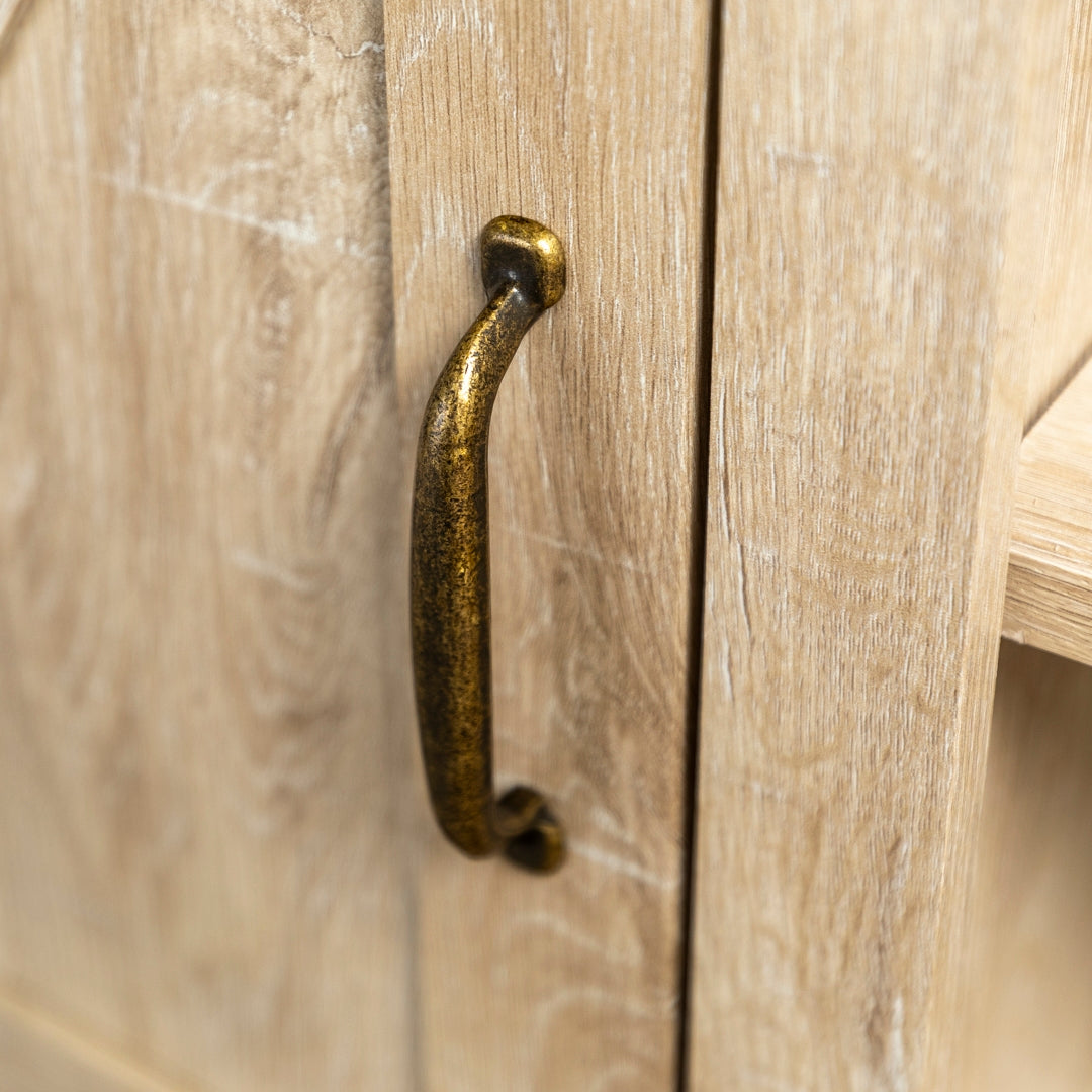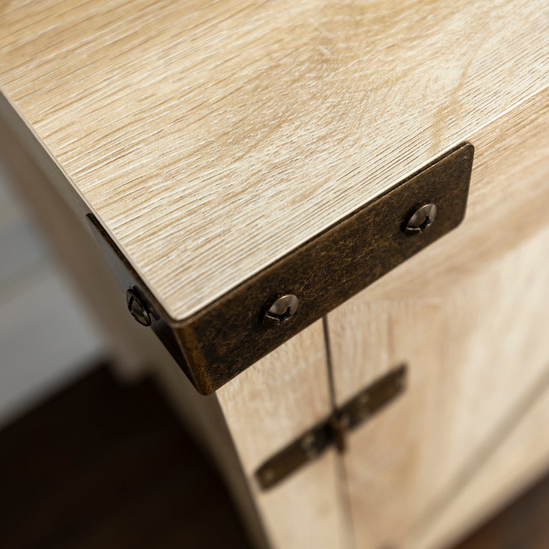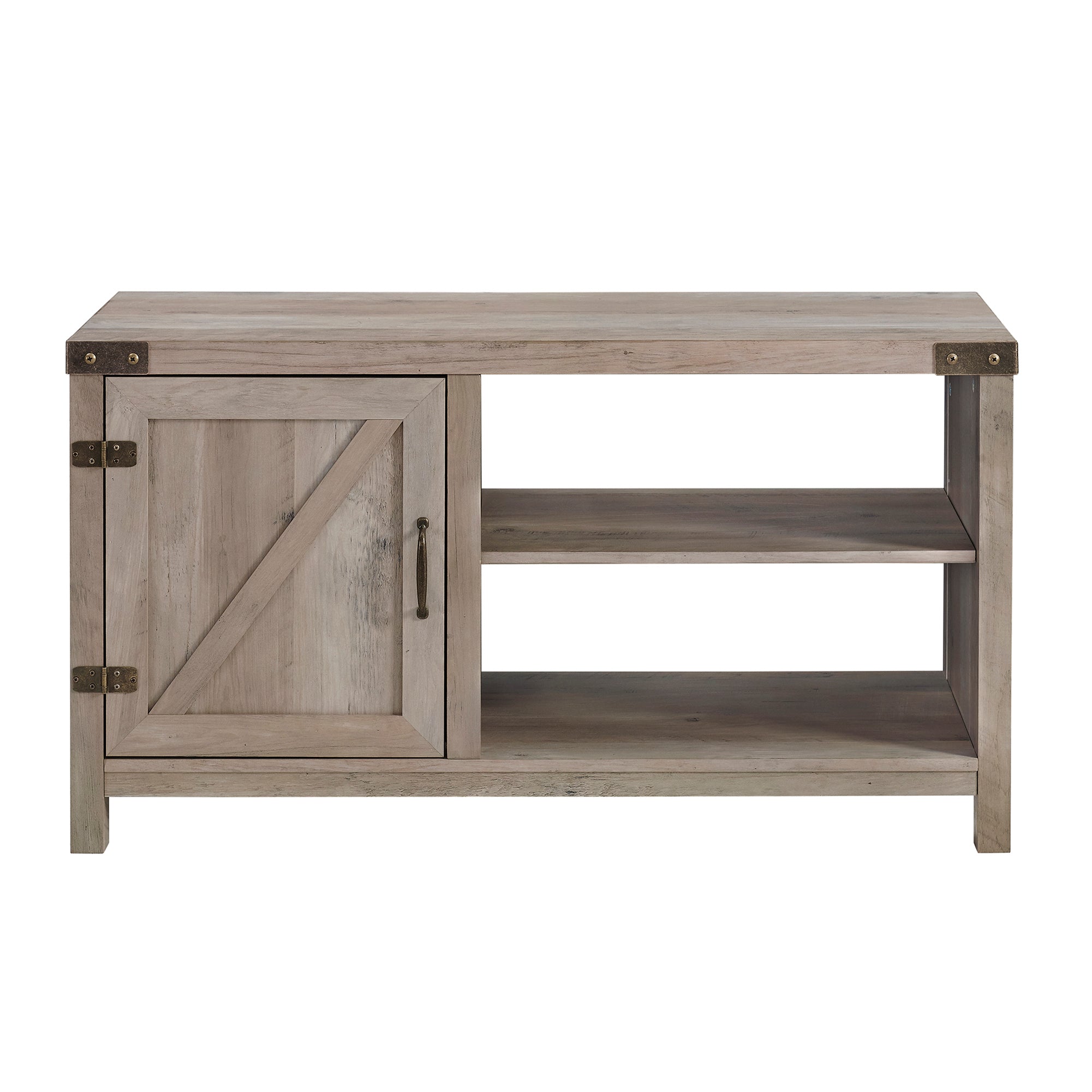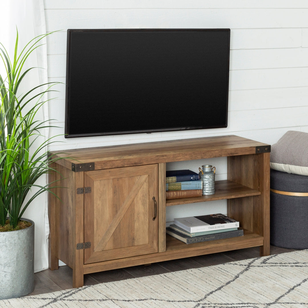 Our 44-inch rustic farmhouse barn door console makes for a perfectly practical console in your home. Made up of durable manufactured wood and metal hardware on the top front corners, door hinges, and door handle, to give the ultimate traditional and rustic feel to your living room. The visible and inside shelving are adjustable for open and hidden storage. Place your TV on top to use as a media stand or take your picture frames, ceramic vessels, and a stack of books to decorate the shelves and table top.