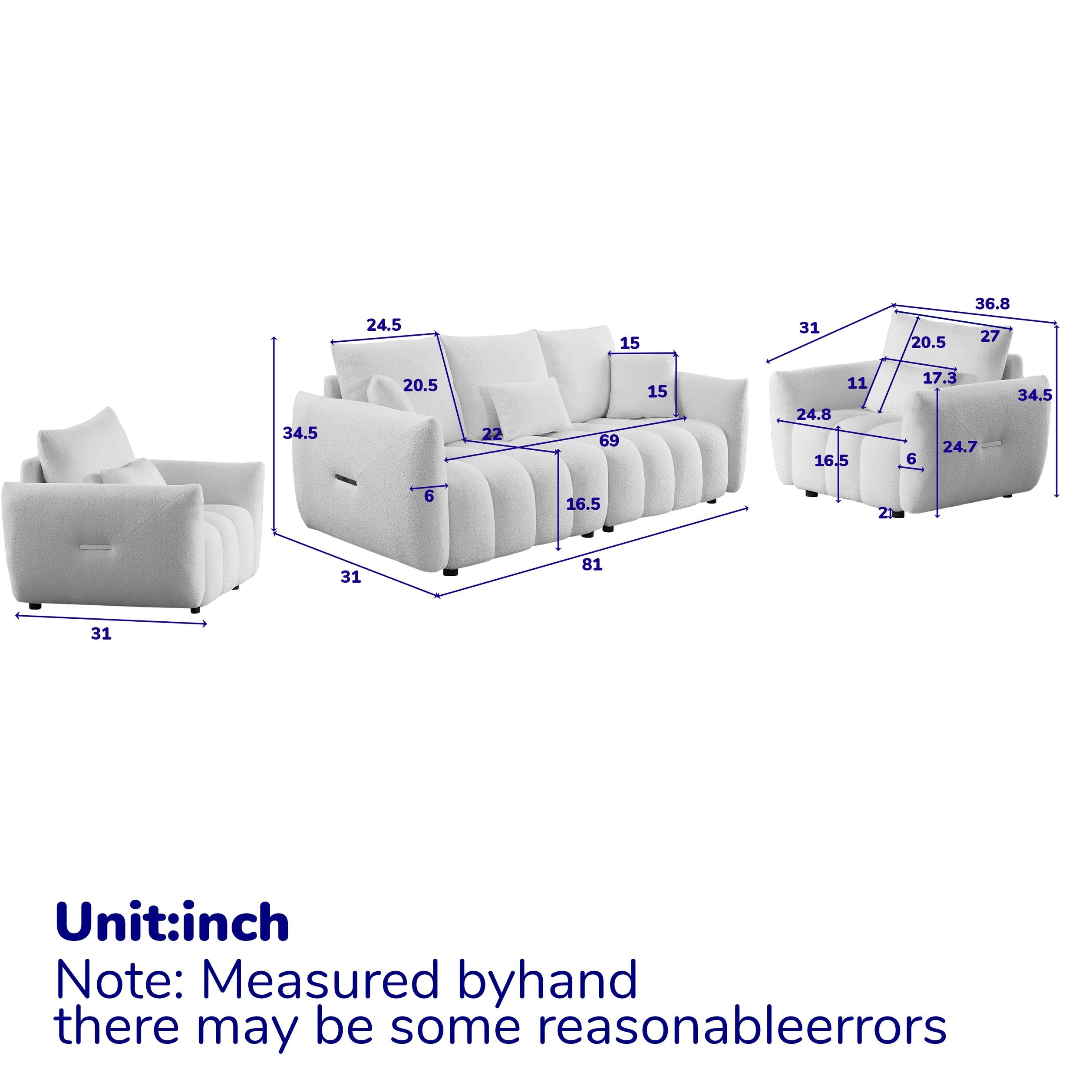 Bring cozy, contemporary style to your apartment or living room with this modern 3-seater + 1-seater + 1-seater sofa combo. Upholstered in plush teddy fleece and built on a solid wood frame, the set combines soft comfort with everyday durability—ideal for lounging, reading, watching movies, or entertaining guests. Thoughtful details like removable pillows, pocketed springs, and floor-protecting leg cushions make it practical as well as stylish.