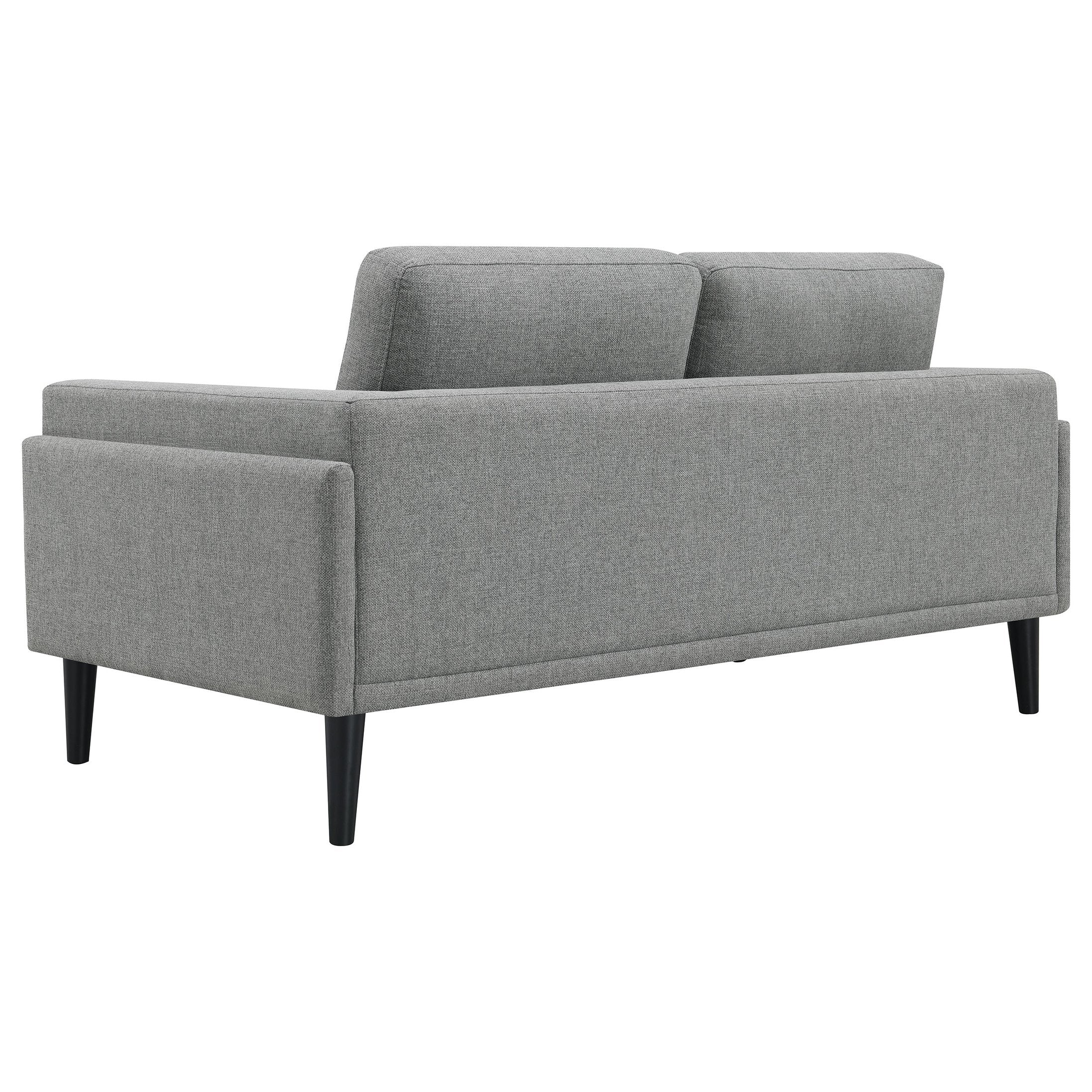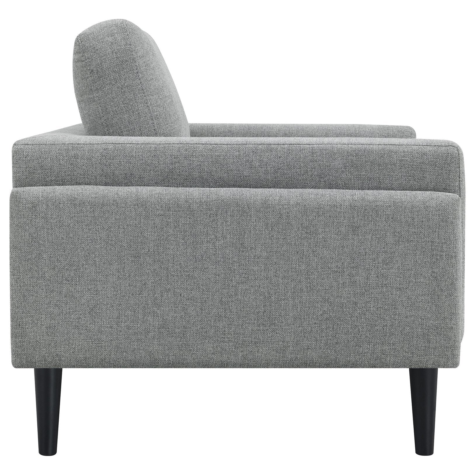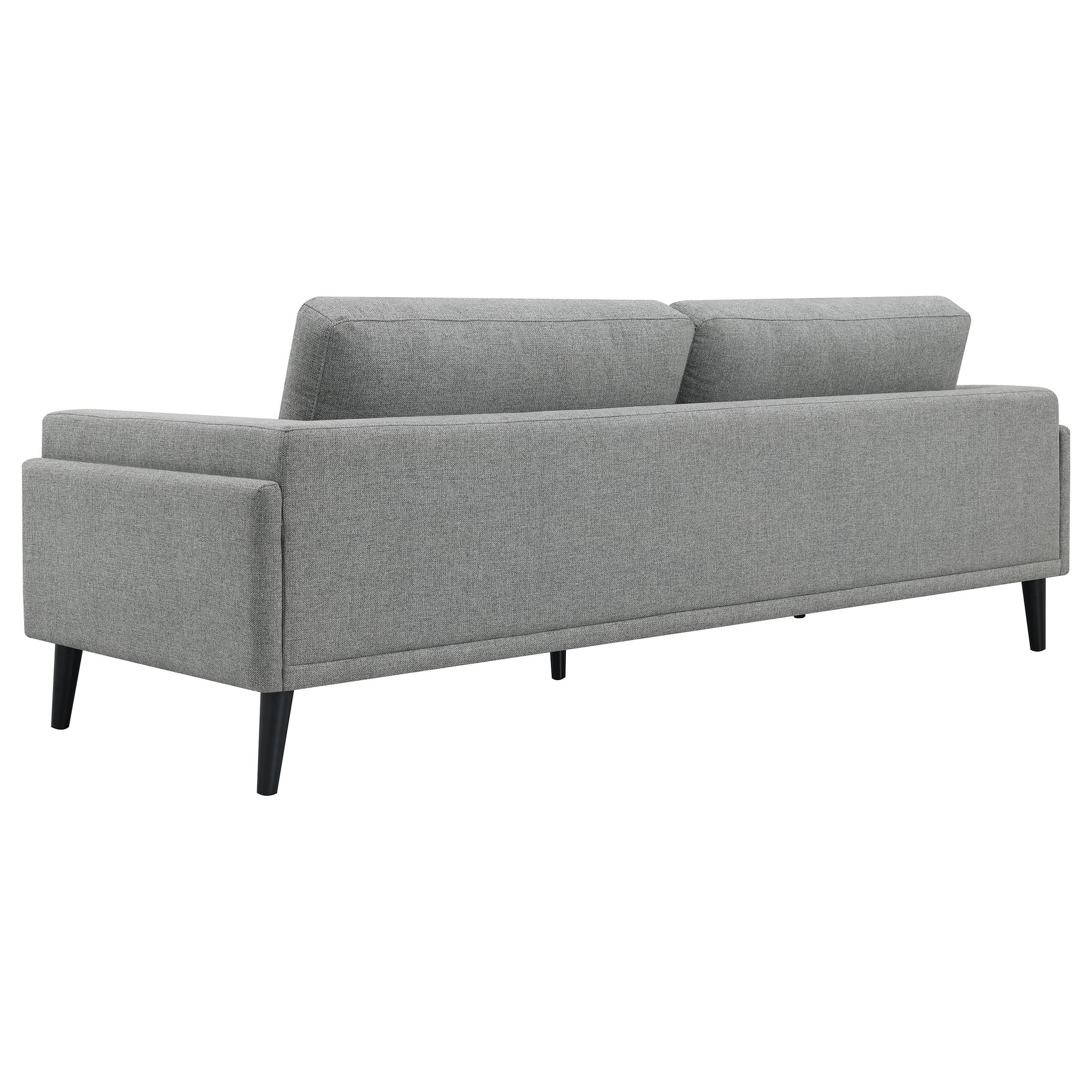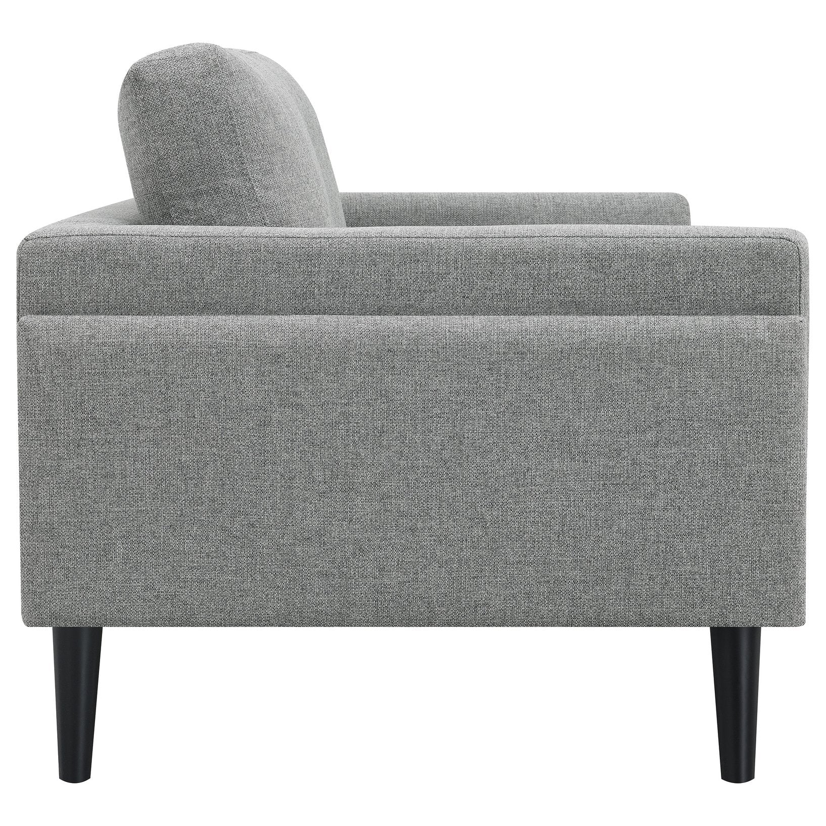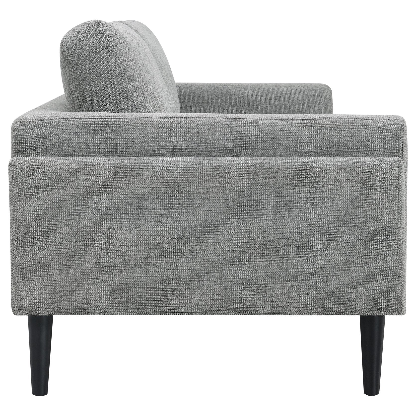Elevate your living area with this refined three-piece seating collection that blends modern lines with timeless comfort. Upholstered in a soft grey fabric, the set offers a cohesive, neutral palette that adapts to both contemporary and classic interiors. Thoughtfully constructed with fully encased solid wood frames, attached seat cushions and reversible back cushions, it provides durable support and easy maintenance. Tall black tapered legs add a tailored silhouette while ensuring stable performance for everyday use.