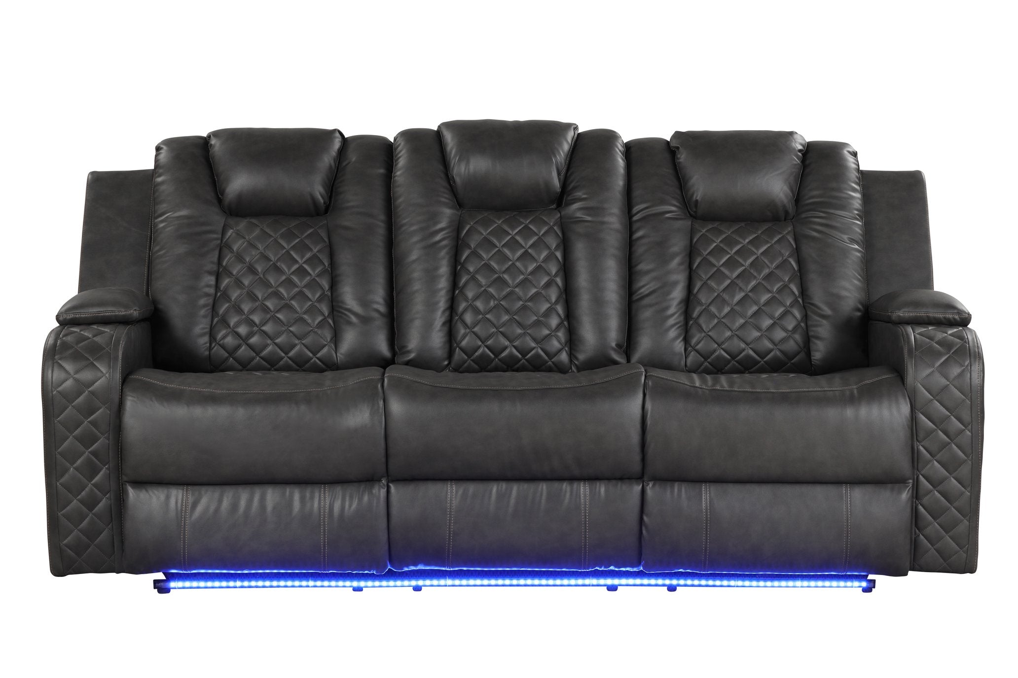 Transform your living room into a modern, tech-infused retreat with this 2-piece power reclining set. Designed with sporty, automotive-inspired styling and durable pebbled faux leather, the set pairs sleek aesthetics with advanced comfort features—one-touch power recline, adjustable headrests, ambient LED lighting, and integrated media conveniences—so you can relax, entertain, and recharge in style.