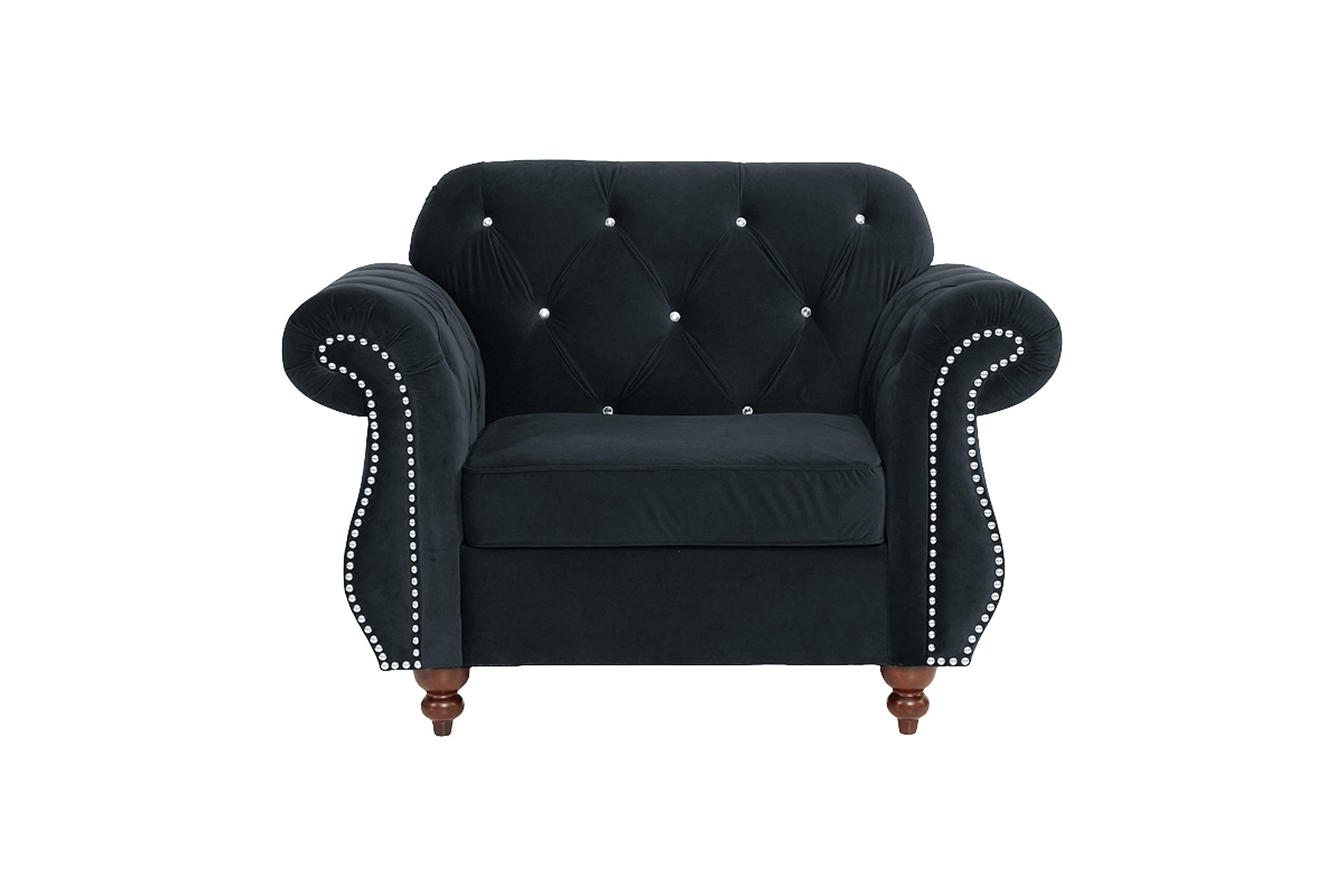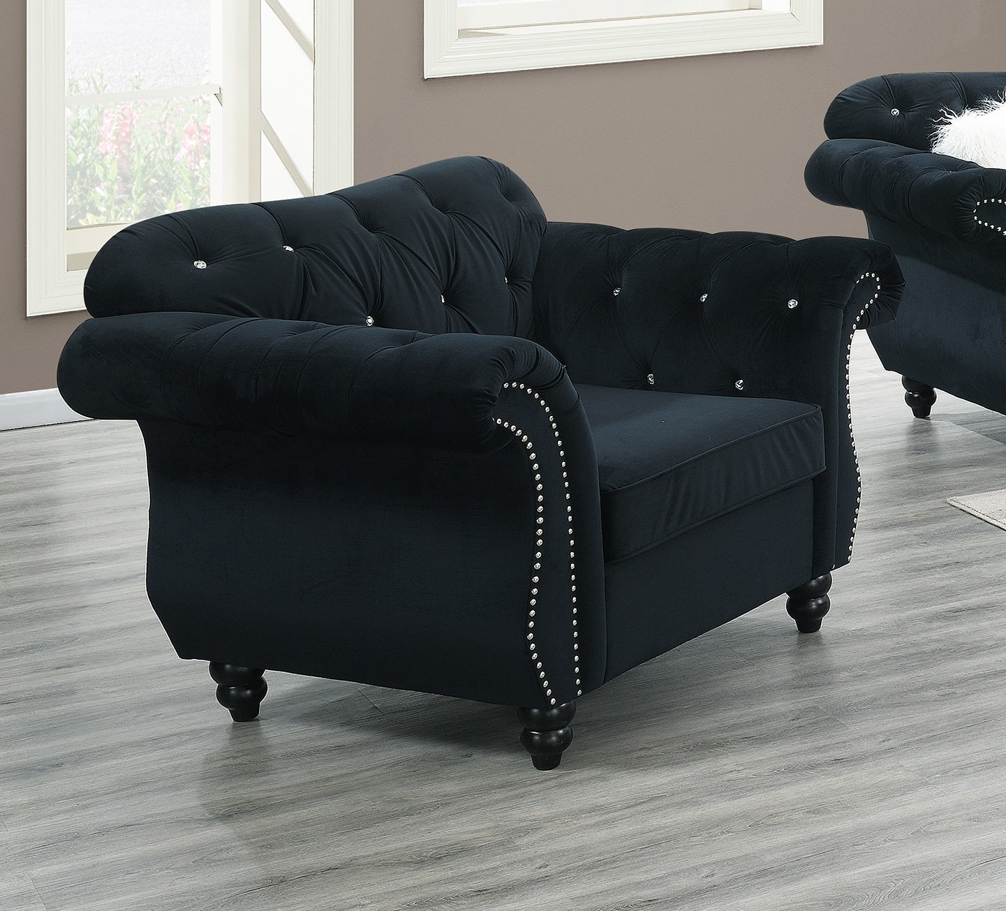 Elevate your living space with this luxurious 3-piece velvet sofa set, designed to combine classic glamour with contemporary comfort. Each piece features crystal tufting, rolled arms, and silver nailhead trim for a refined, cohesive look that suits both formal and casual settings. Upholstered in sumptuous velvet (available in Black and Indigo), the set provides plush seating and a striking visual focal point for your living room, den, or lounge area.