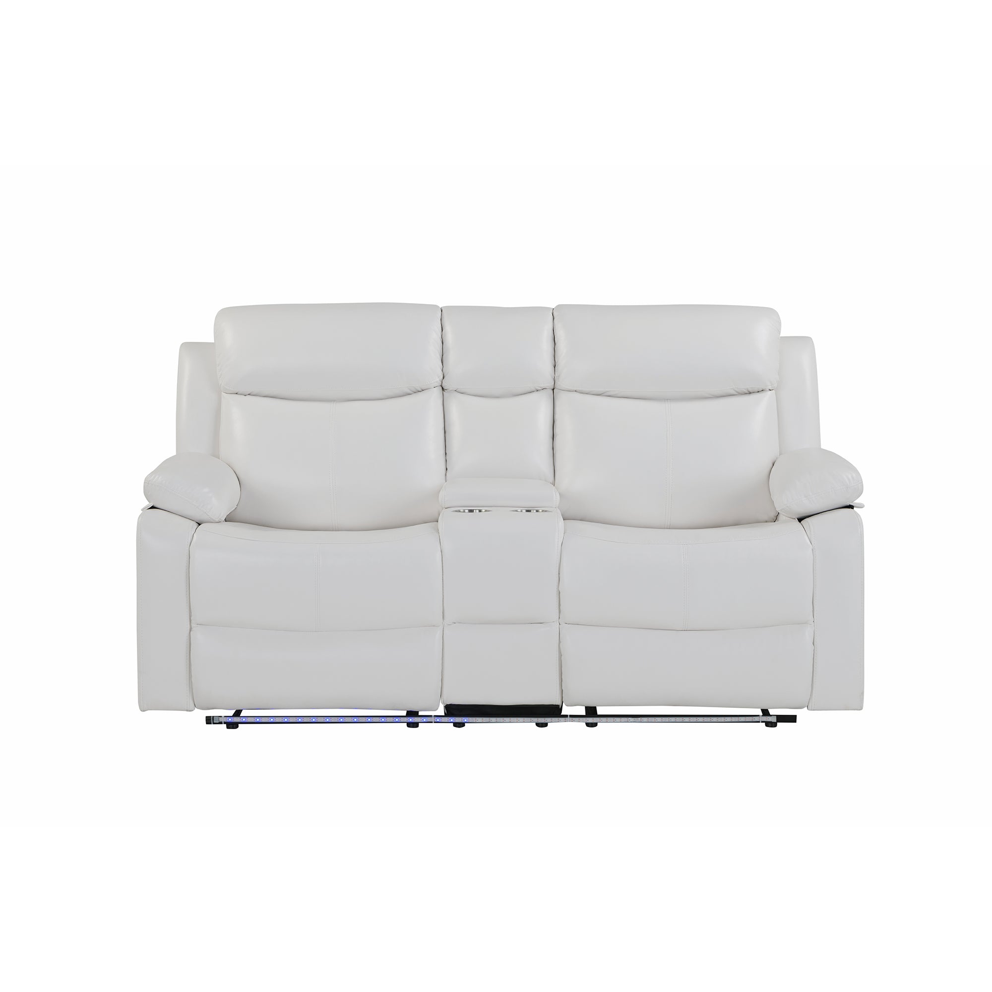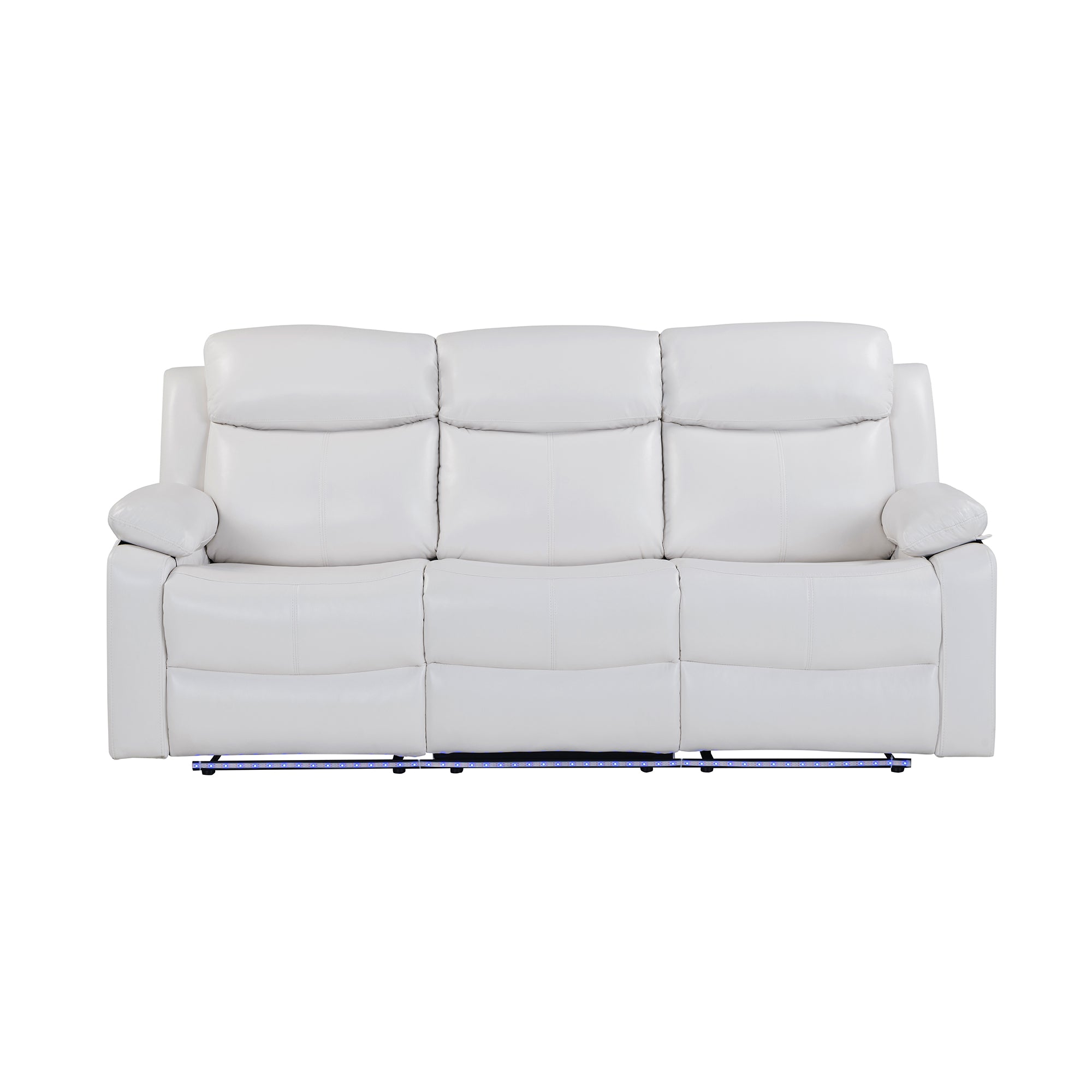 Bring modern comfort and cinematic flair to your living room with this elegant Blanche white reclining sofa and loveseat set. Upholstered in crisp white fabric, the two-piece ensemble delivers reclining relaxation, thoughtful storage, and subtle LED accents—perfect for movie nights, entertaining, or everyday lounging.