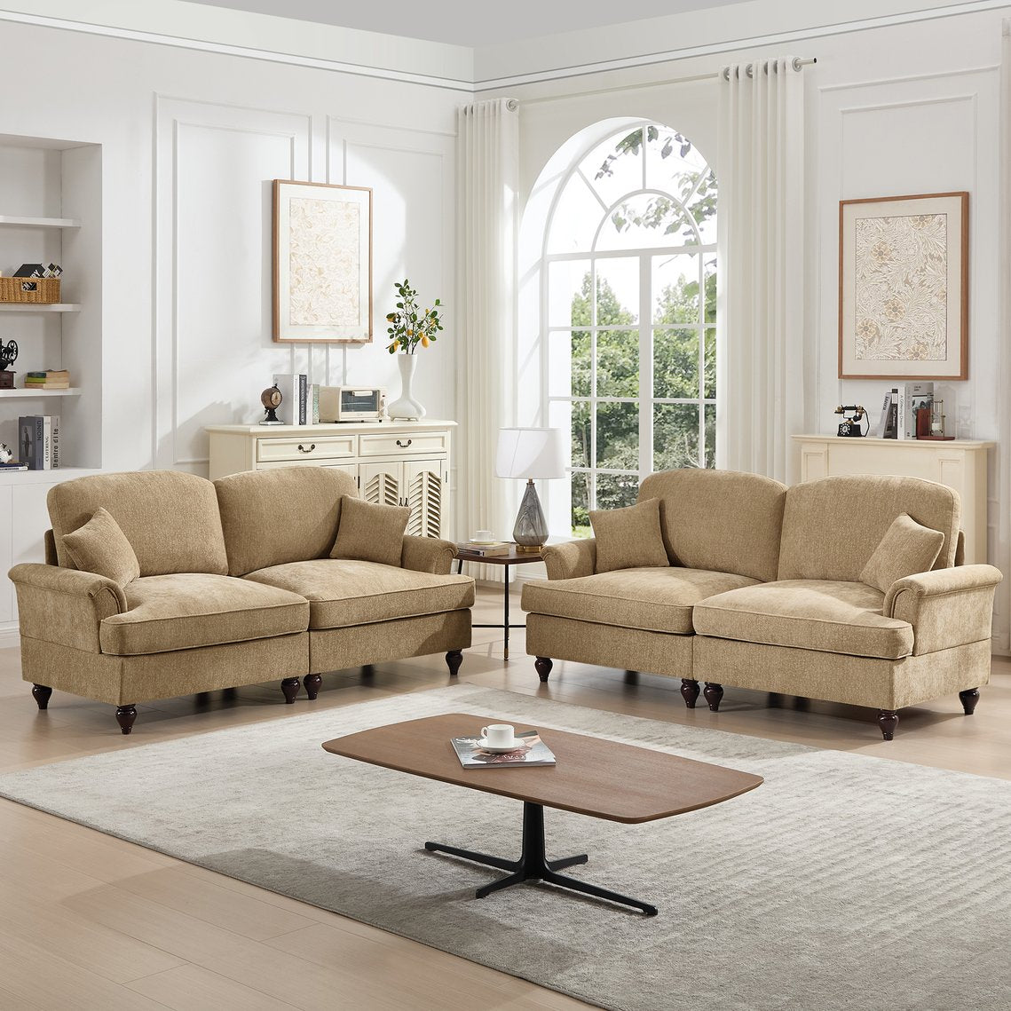 Experience timeless elegance and everyday comfort with this versatile 2-piece modular sofa set. Thoughtfully designed with flared petal arms, spindle legs, and removable ruffled pleat skirts, the set offers two distinct looks—classic romantic or clean mid-century—so you can refresh your living room without replacing furniture. Soft chenille upholstery, high-density foam cushions, and a segmented backrest deliver supportive seating for lounging or entertaining, while independent modules let you customize layout to suit any space.