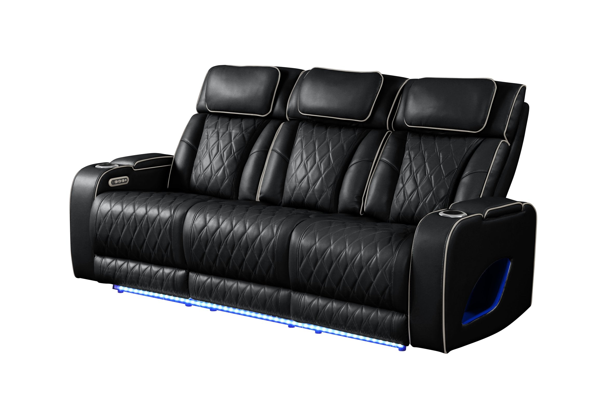 Transform your living room into a modern relaxation retreat with this 2-piece Fortuner reclining set. Upholstered in durable, high-performance faux leather and accented with diamond-pattern stitching, the set combines contemporary style with advanced comfort features — including power reclining, massage, LED lighting, and integrated tech — for a premium home-theater experience.
